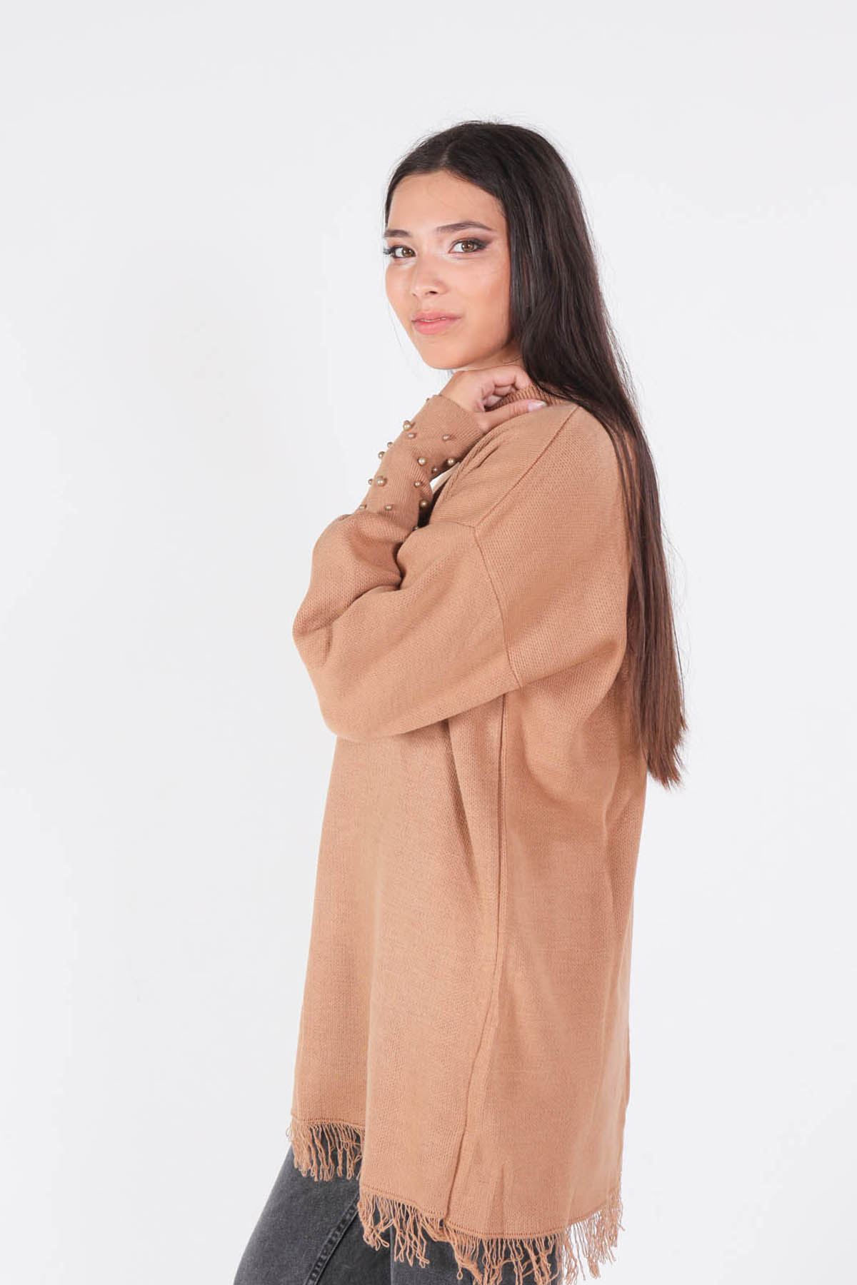 2028 Eteği Saçaklı İnci Detay Kazak Camel