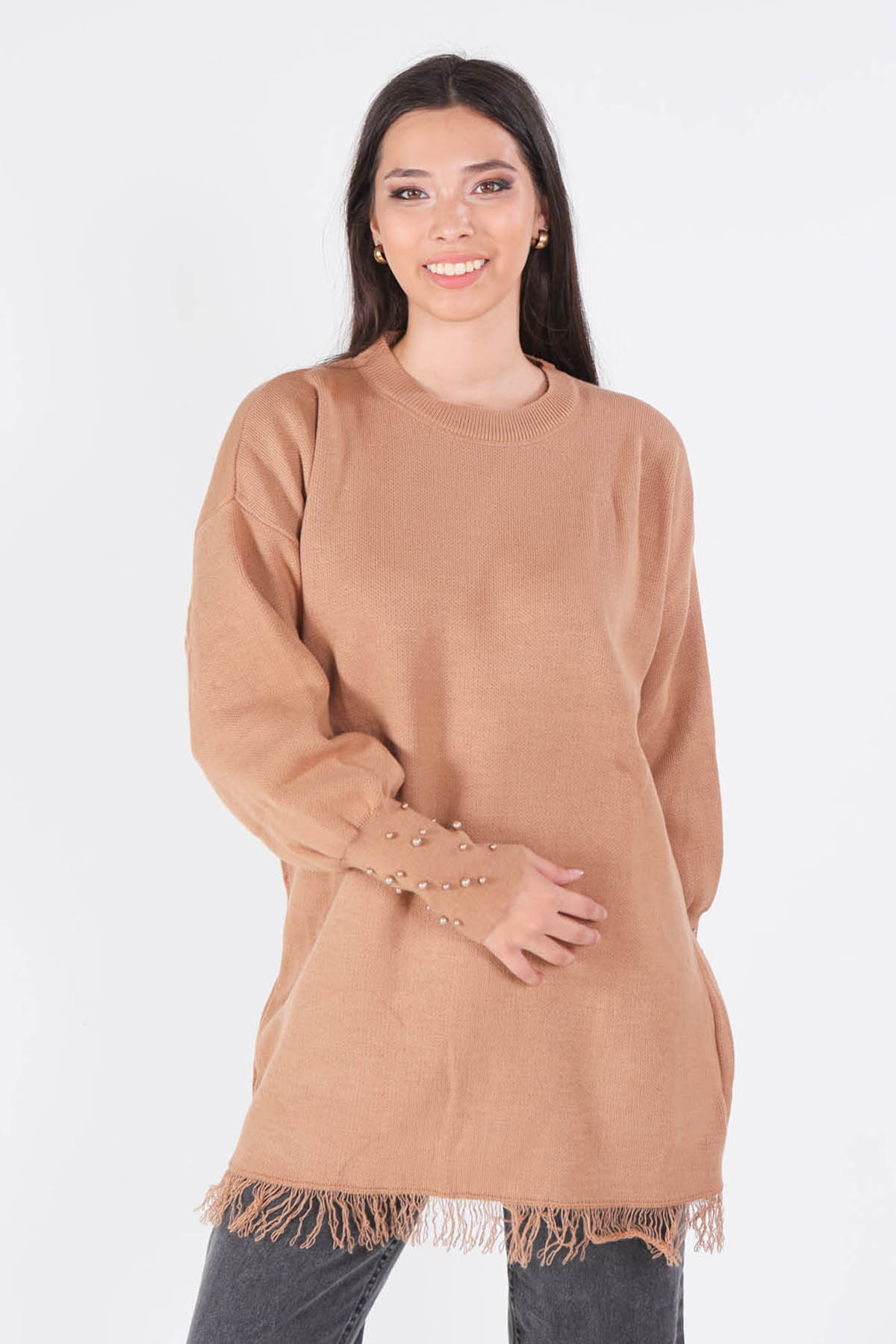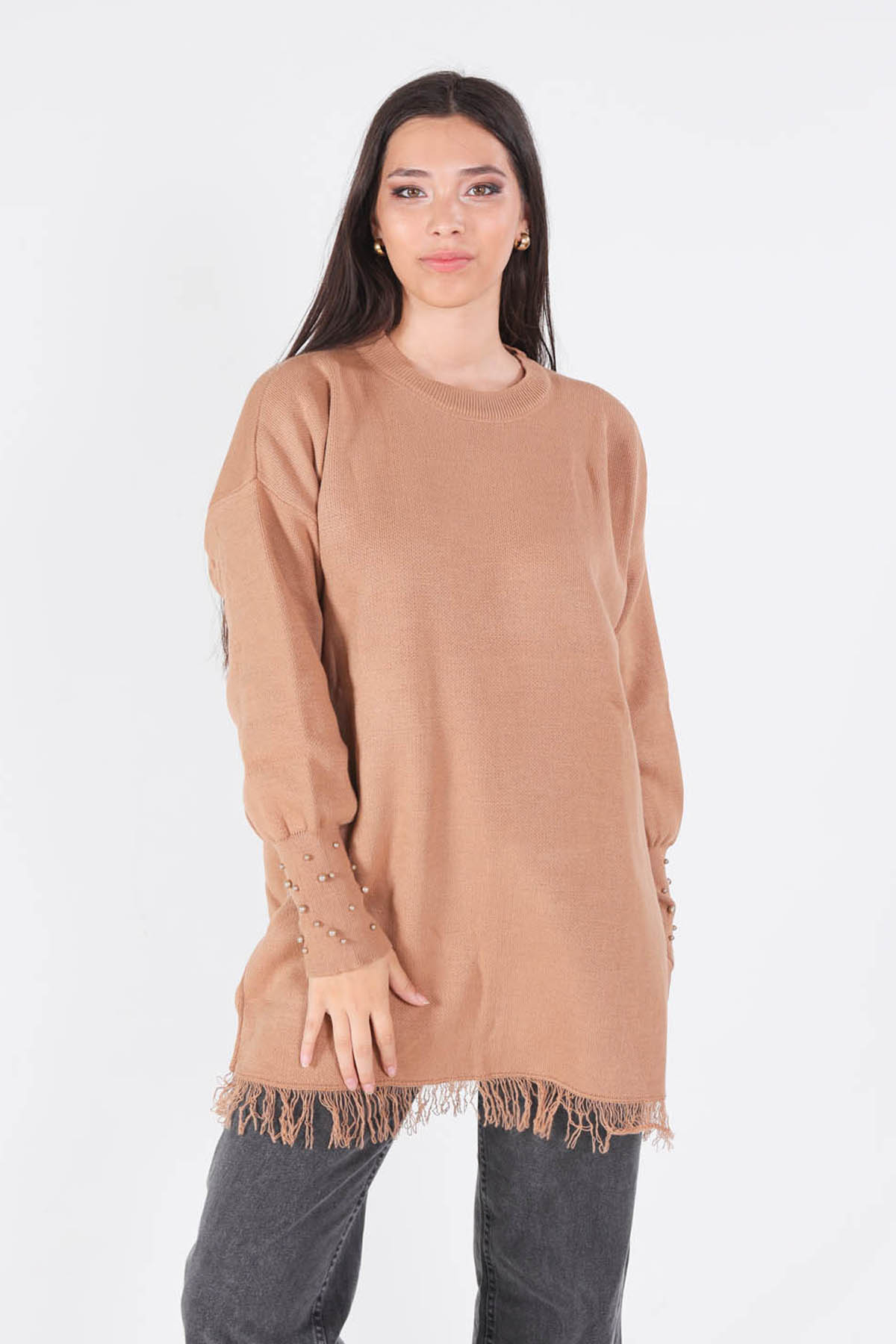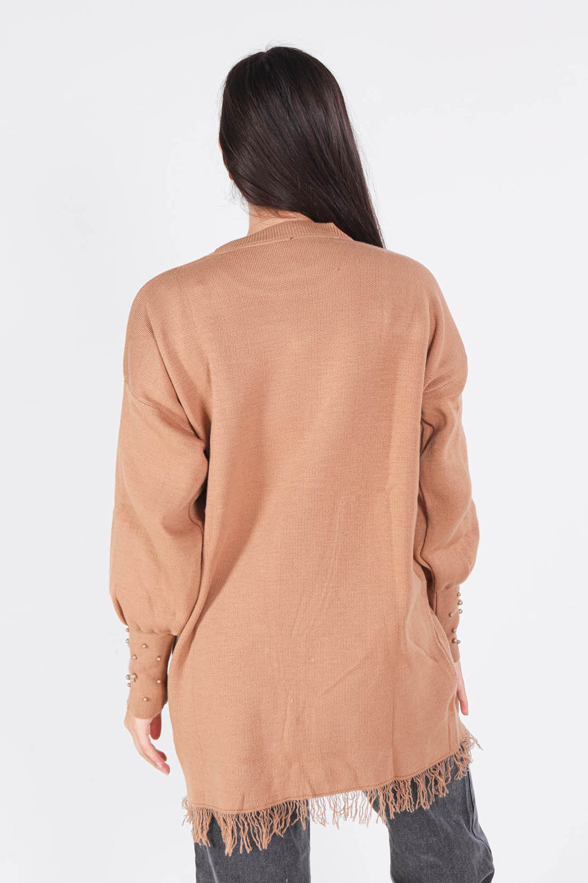 Camel Eteği Saçaklı İnci Detay Kazak 2028