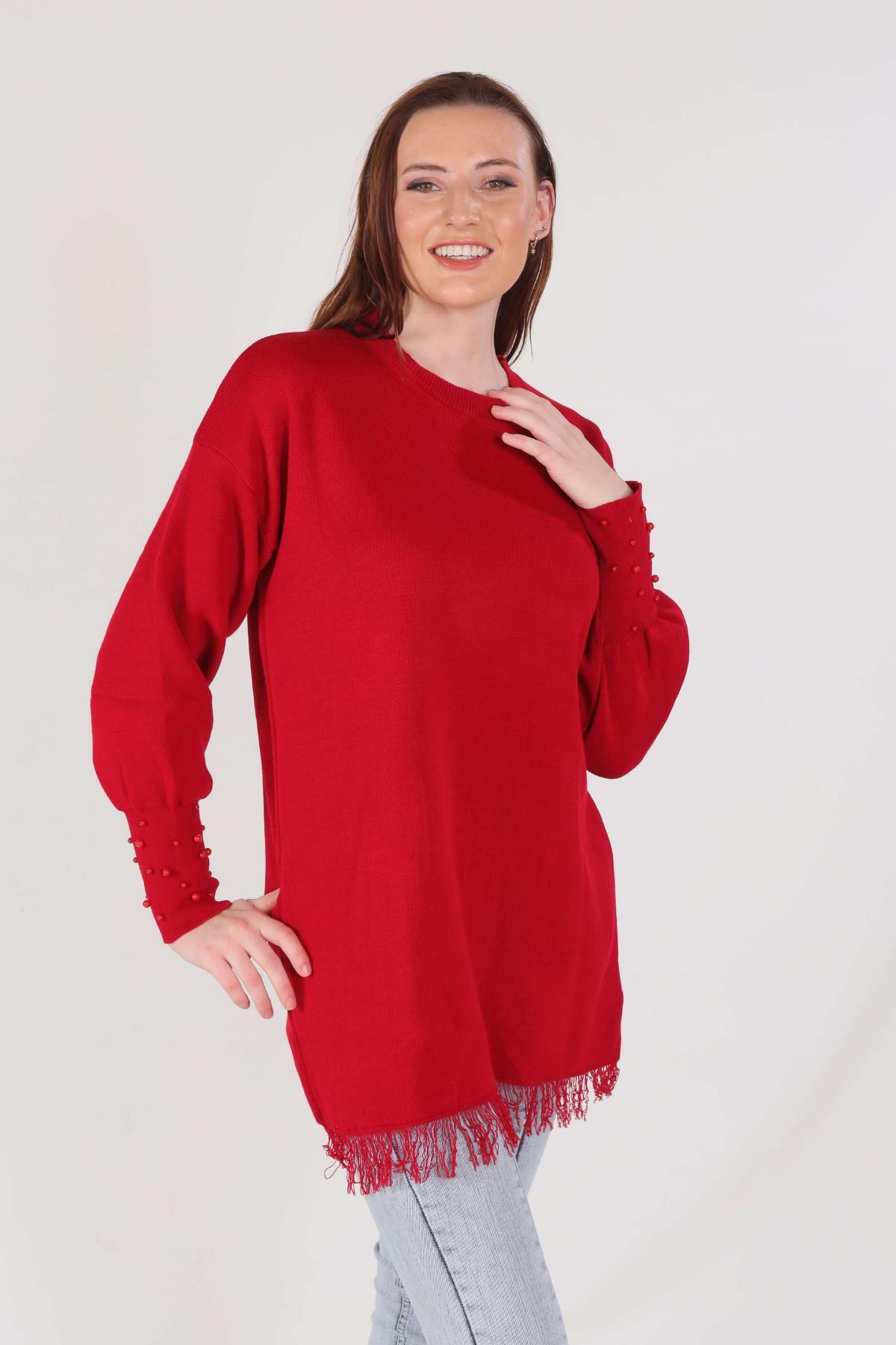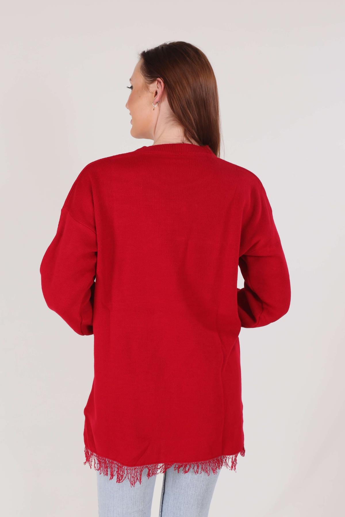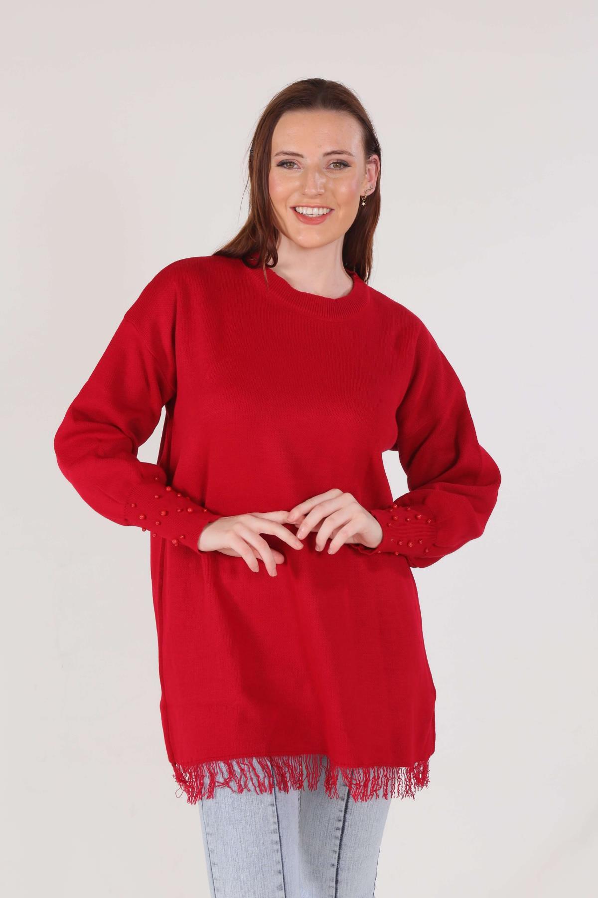 Kırmızı Eteği Saçaklı İnci Detay Kazak 2028