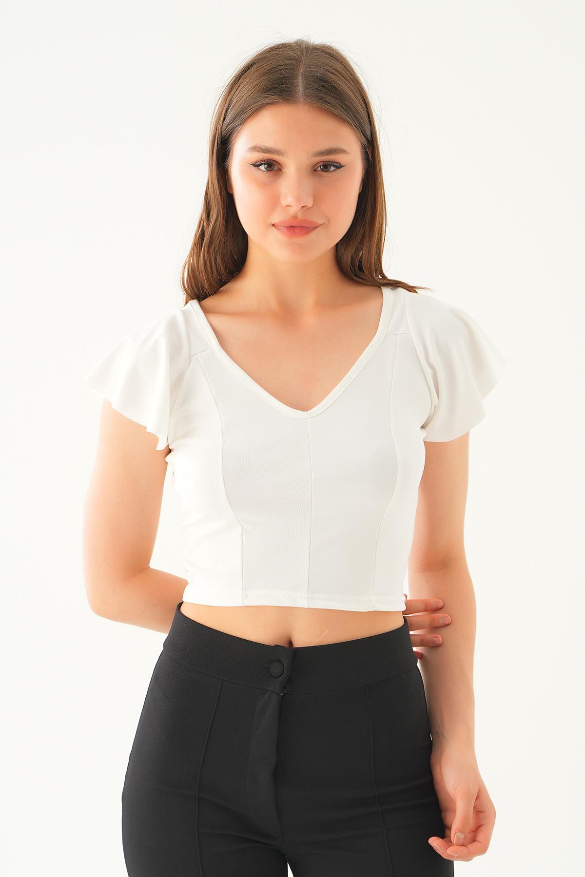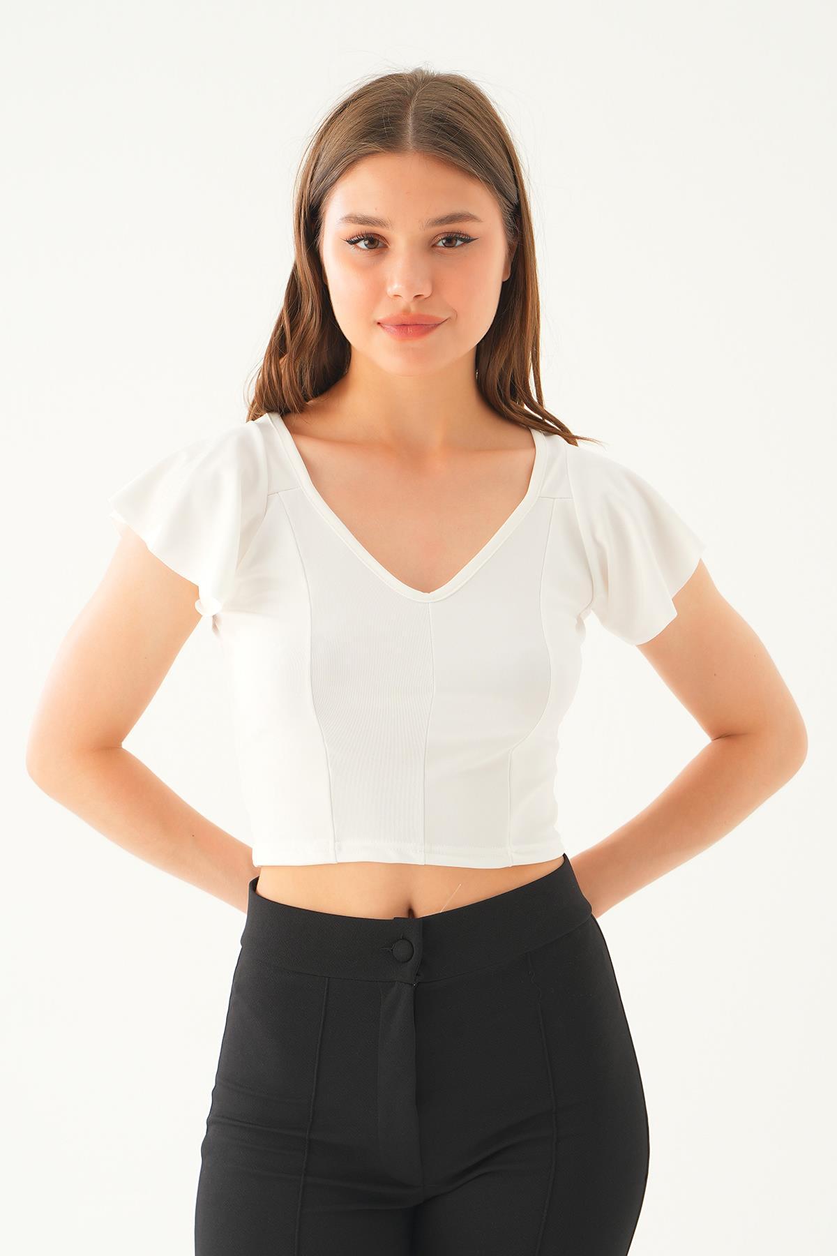 Beyaz Kol Volanlı V Yaka Bluz 2041