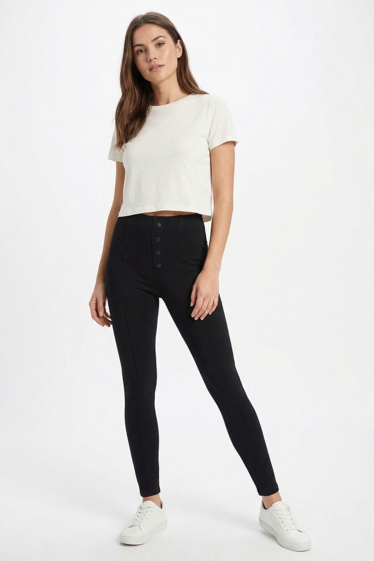 2067 Düğme Detay Yan Lastik Tayt Siyah