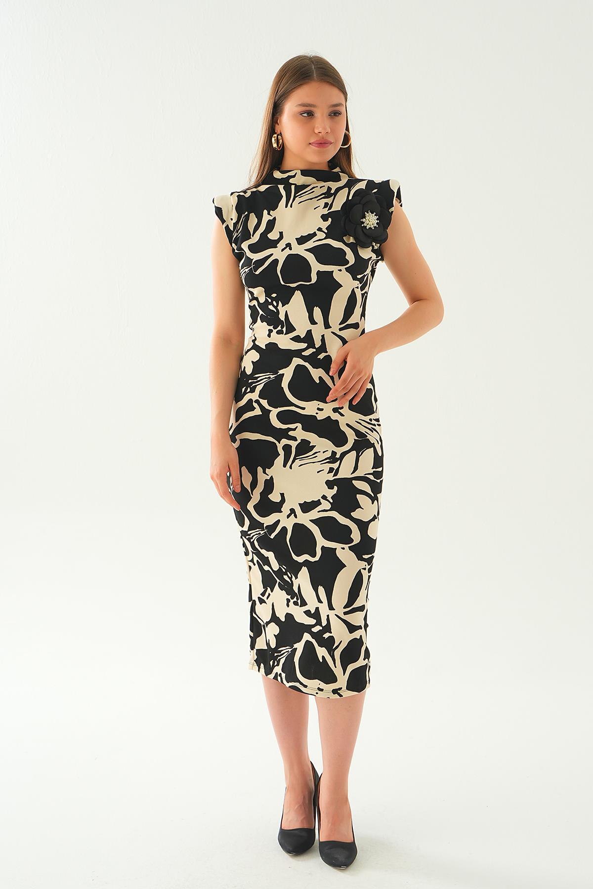 Siyah Gül Detay Desenli Uzun Elbise 2080