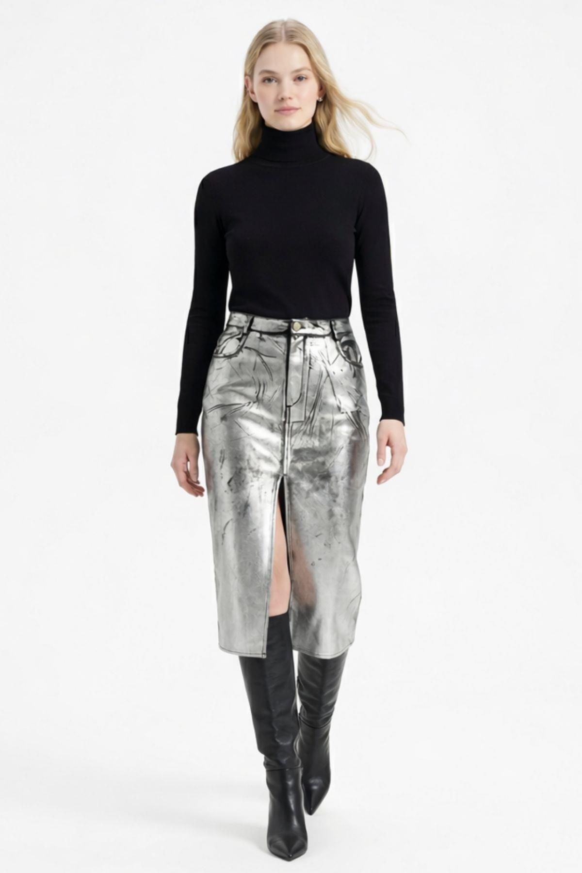 2088 Yırtmaçlı Metalik Deri Etek Gümüş