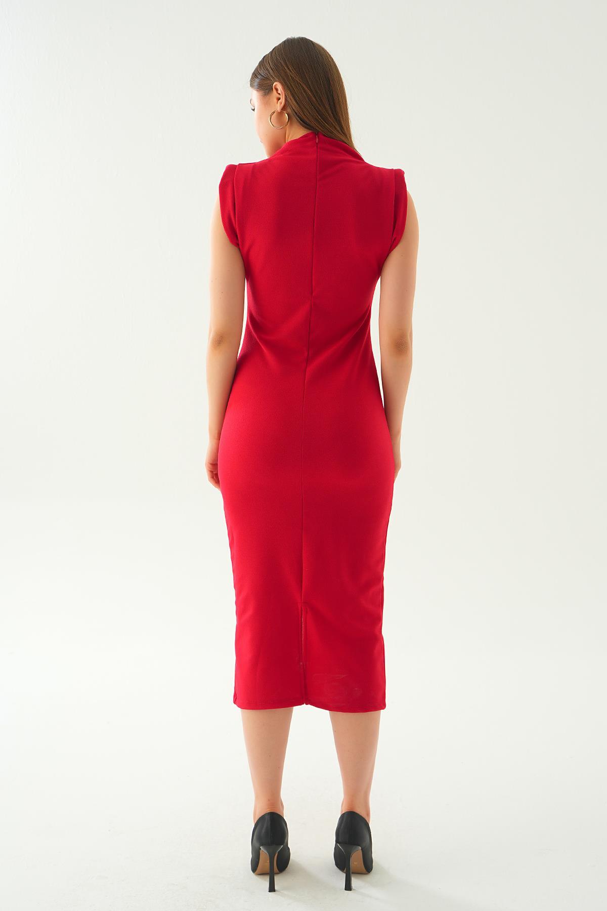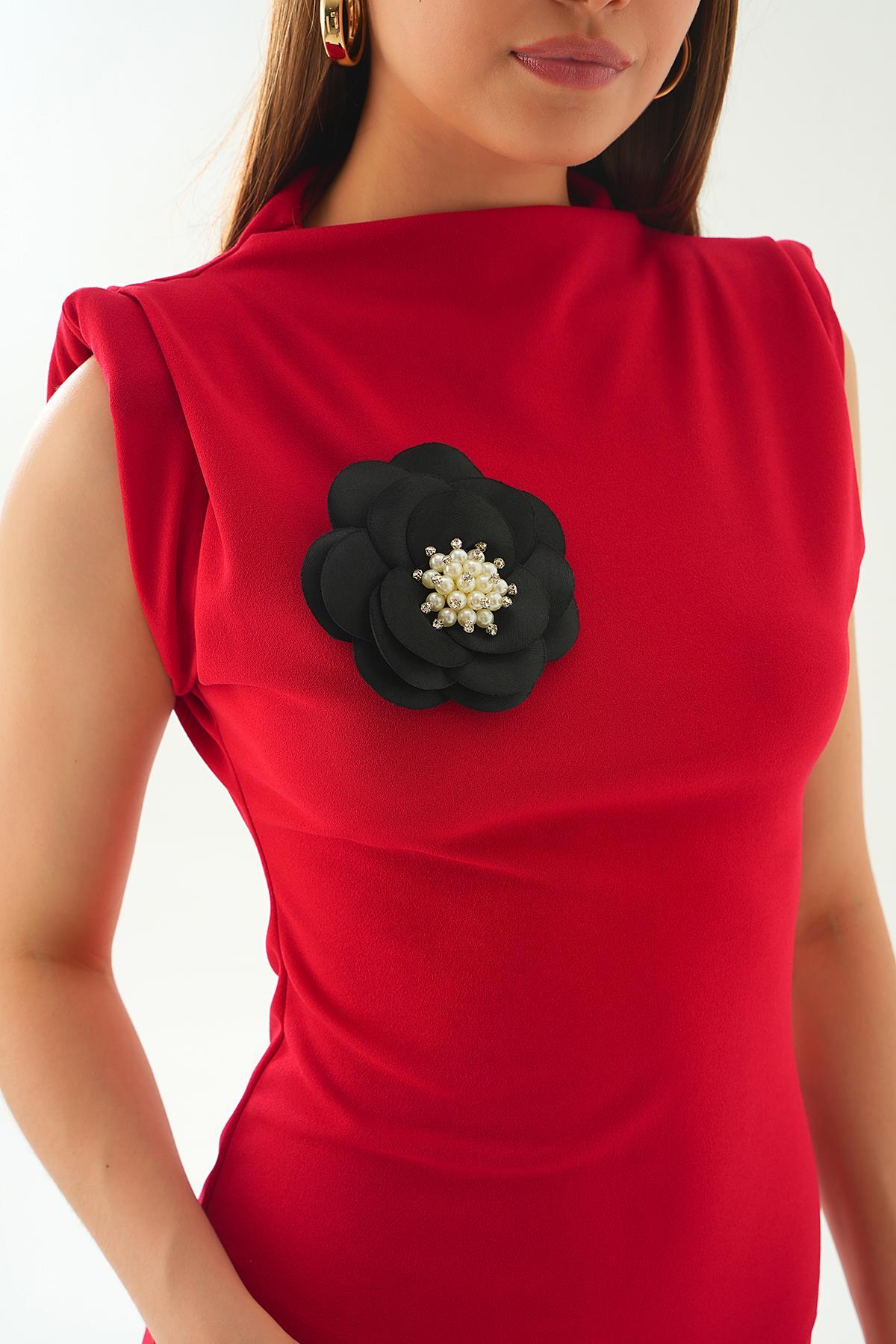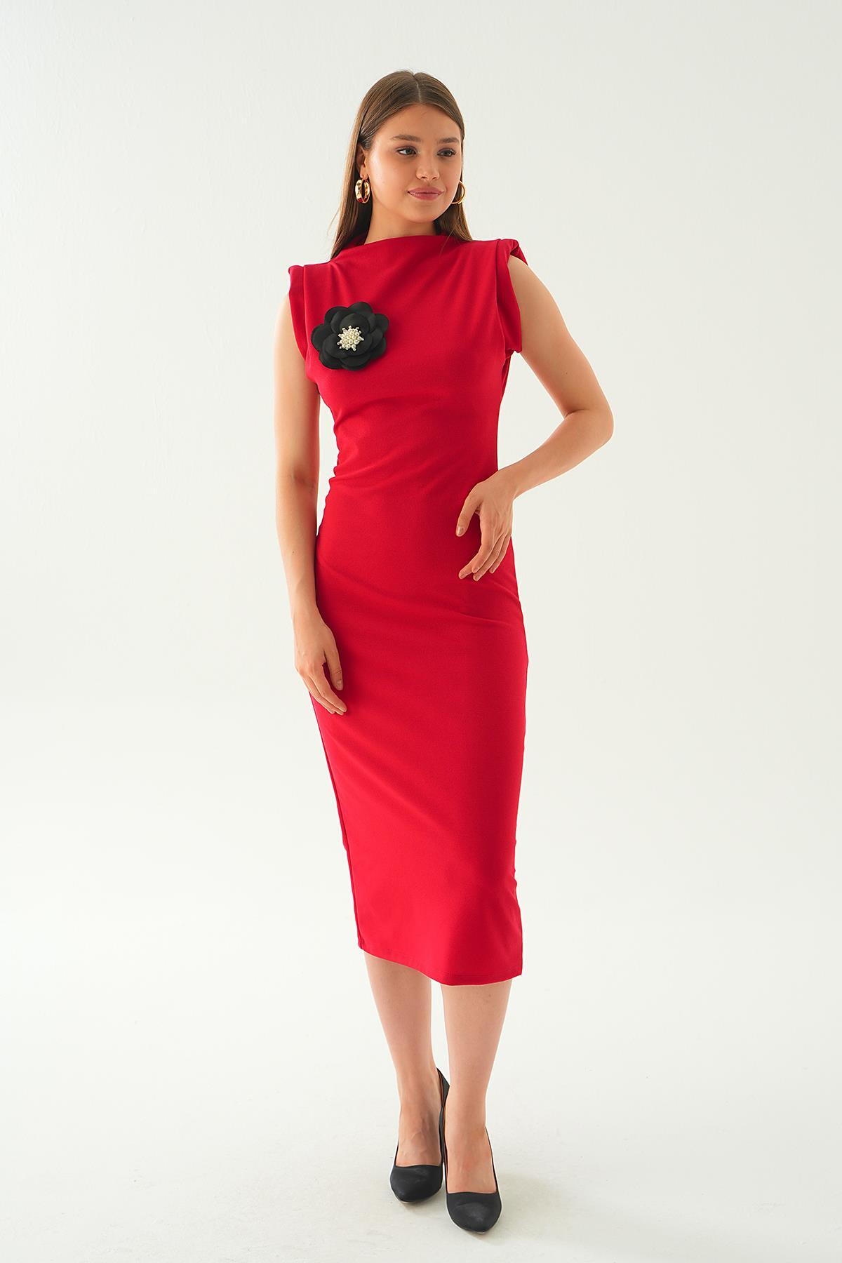 Kırmızı Gül Detay Uzun Elbise 2089