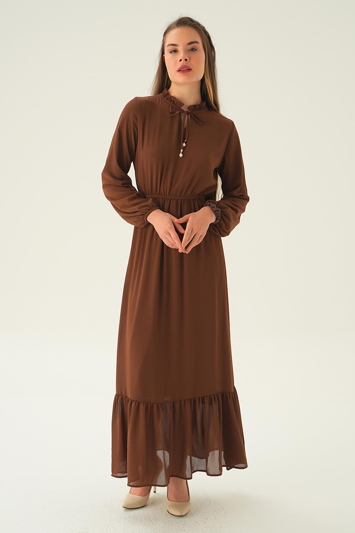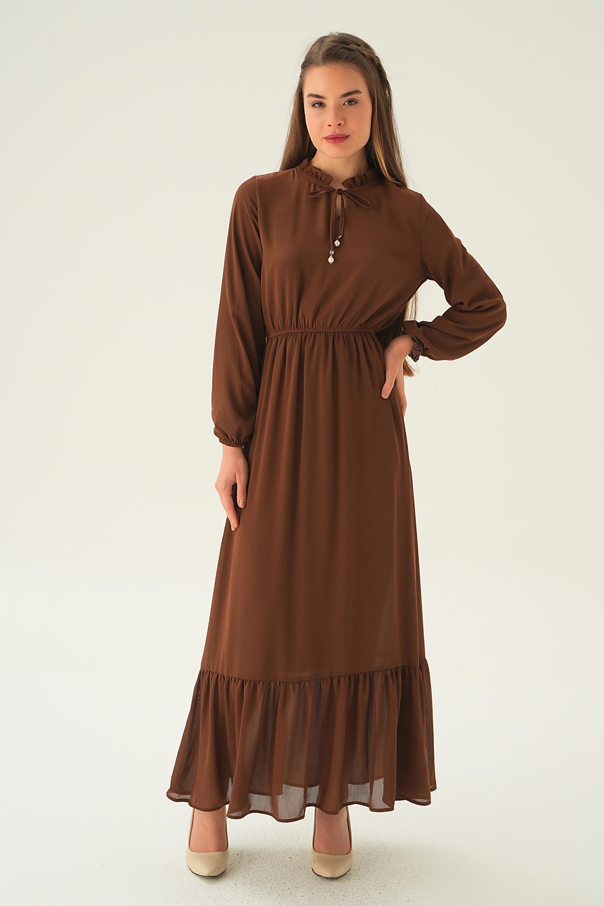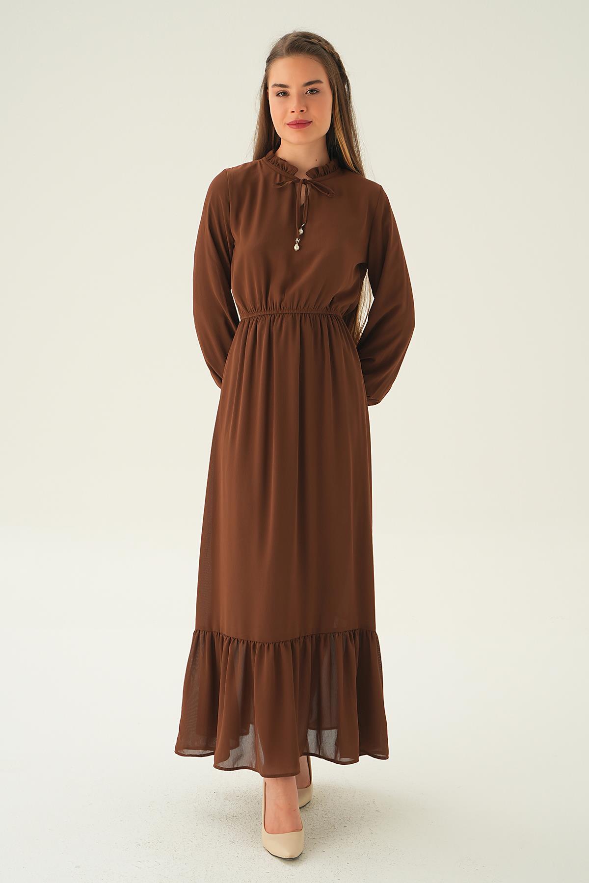 Kahve Yaka Bağcık Uzun Elbise 2110