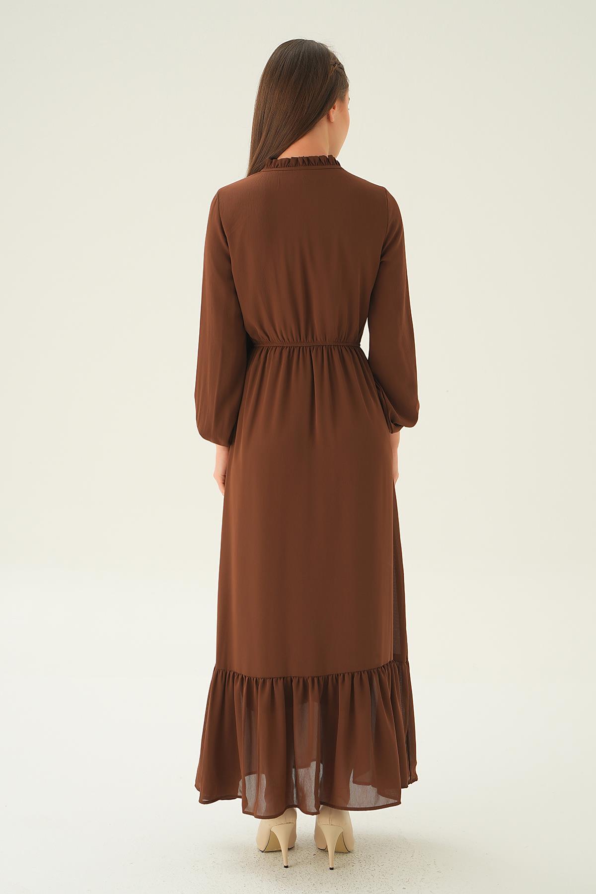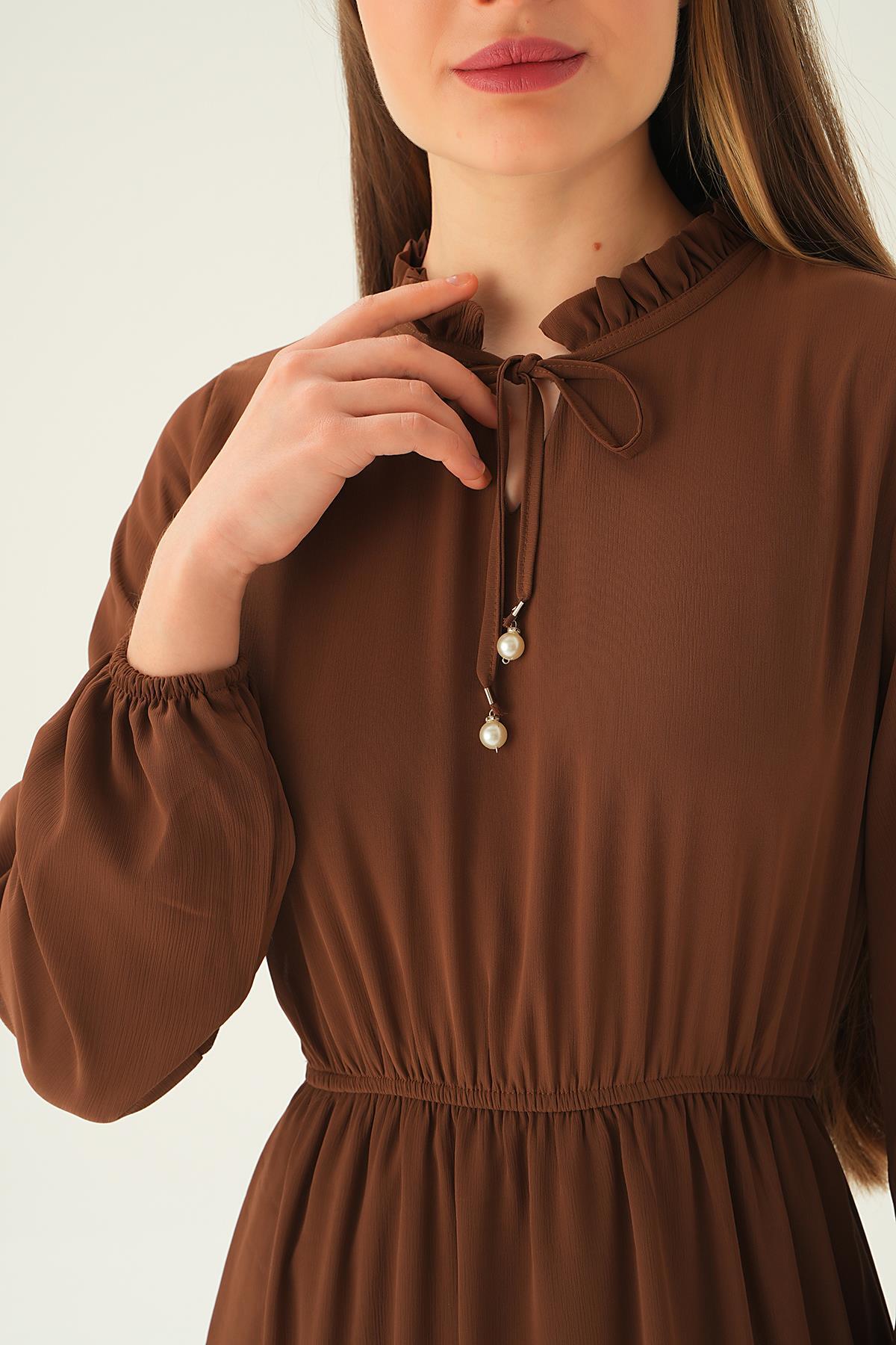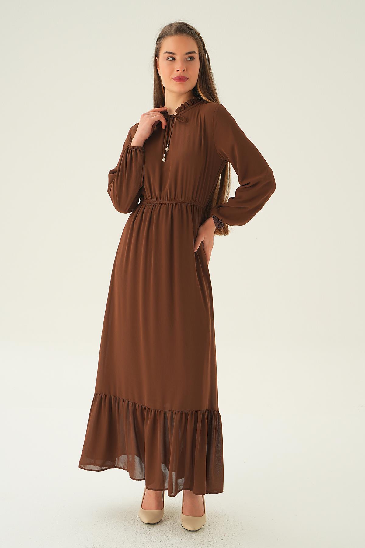 Kahve Yaka Bağcık Uzun Elbise 2110