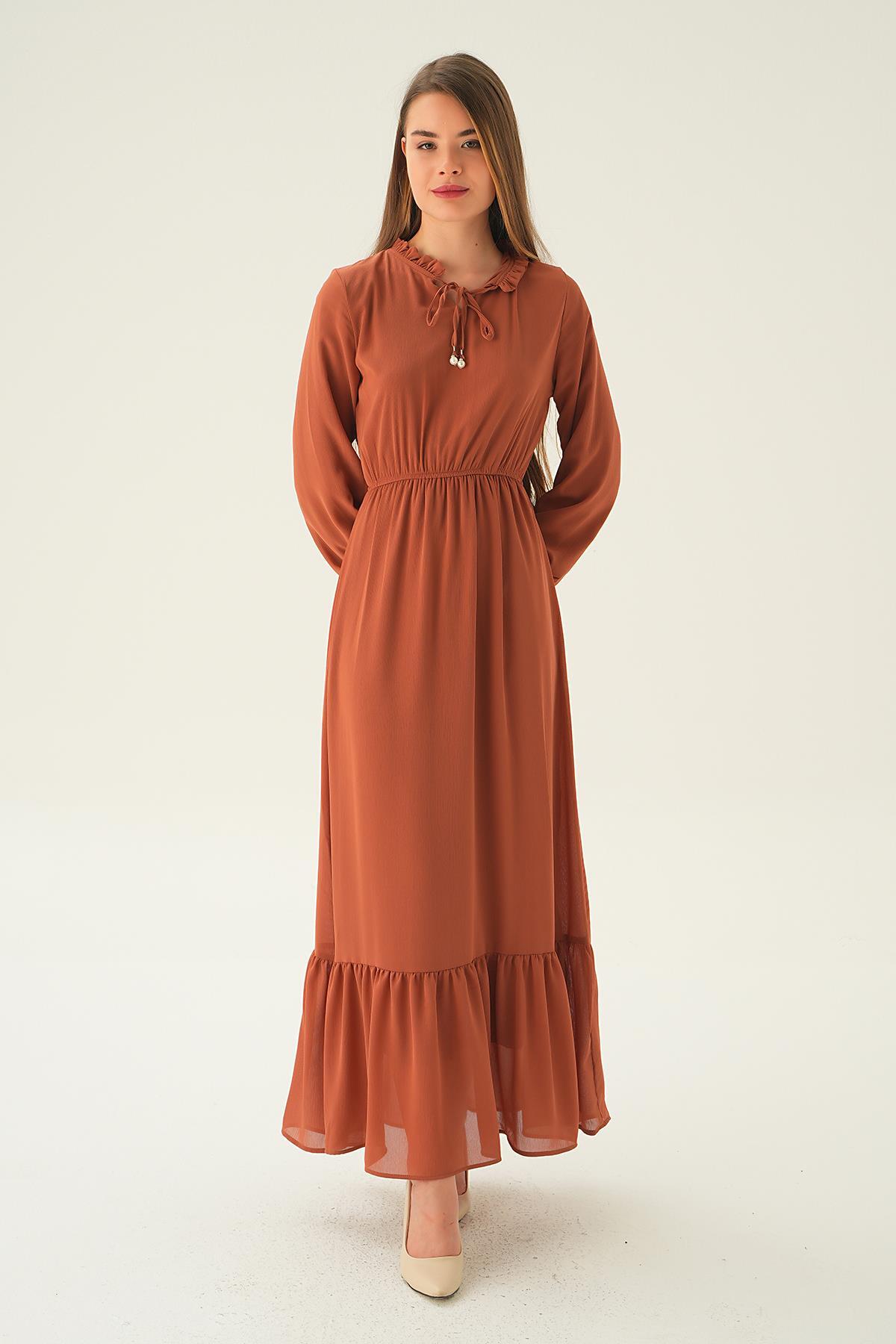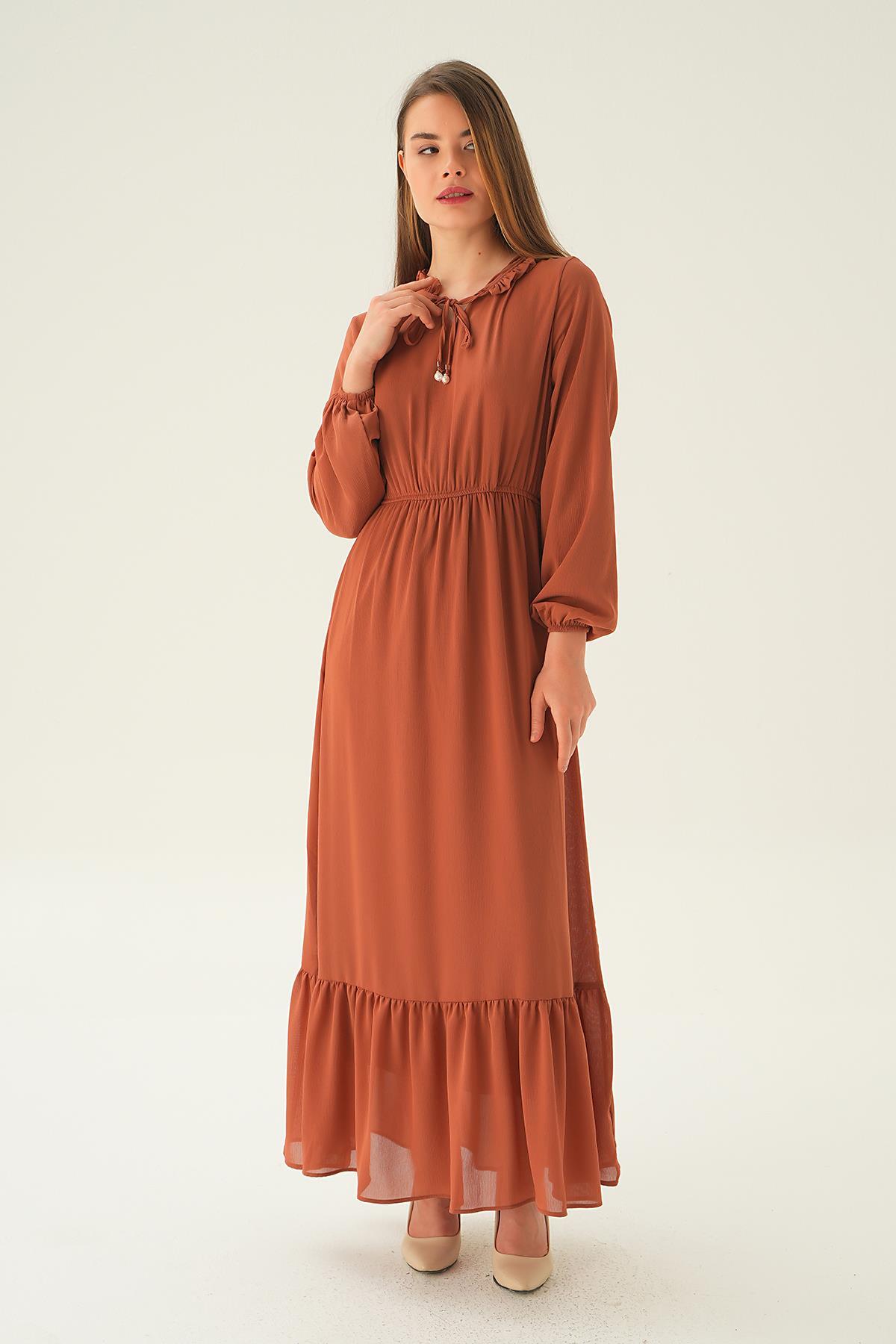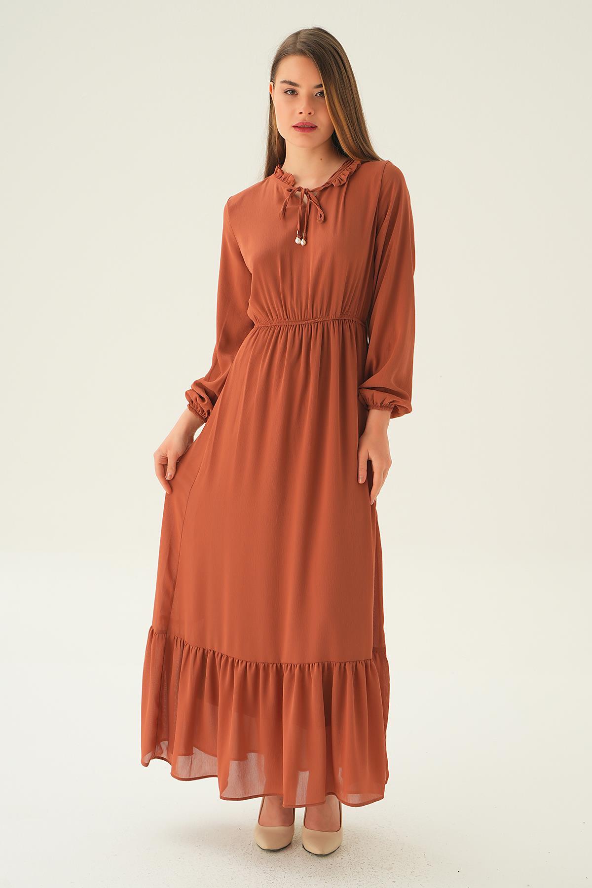 Kiremit Yaka Bağcık Uzun Elbise 2110