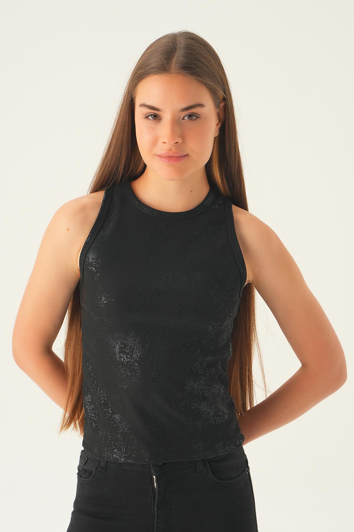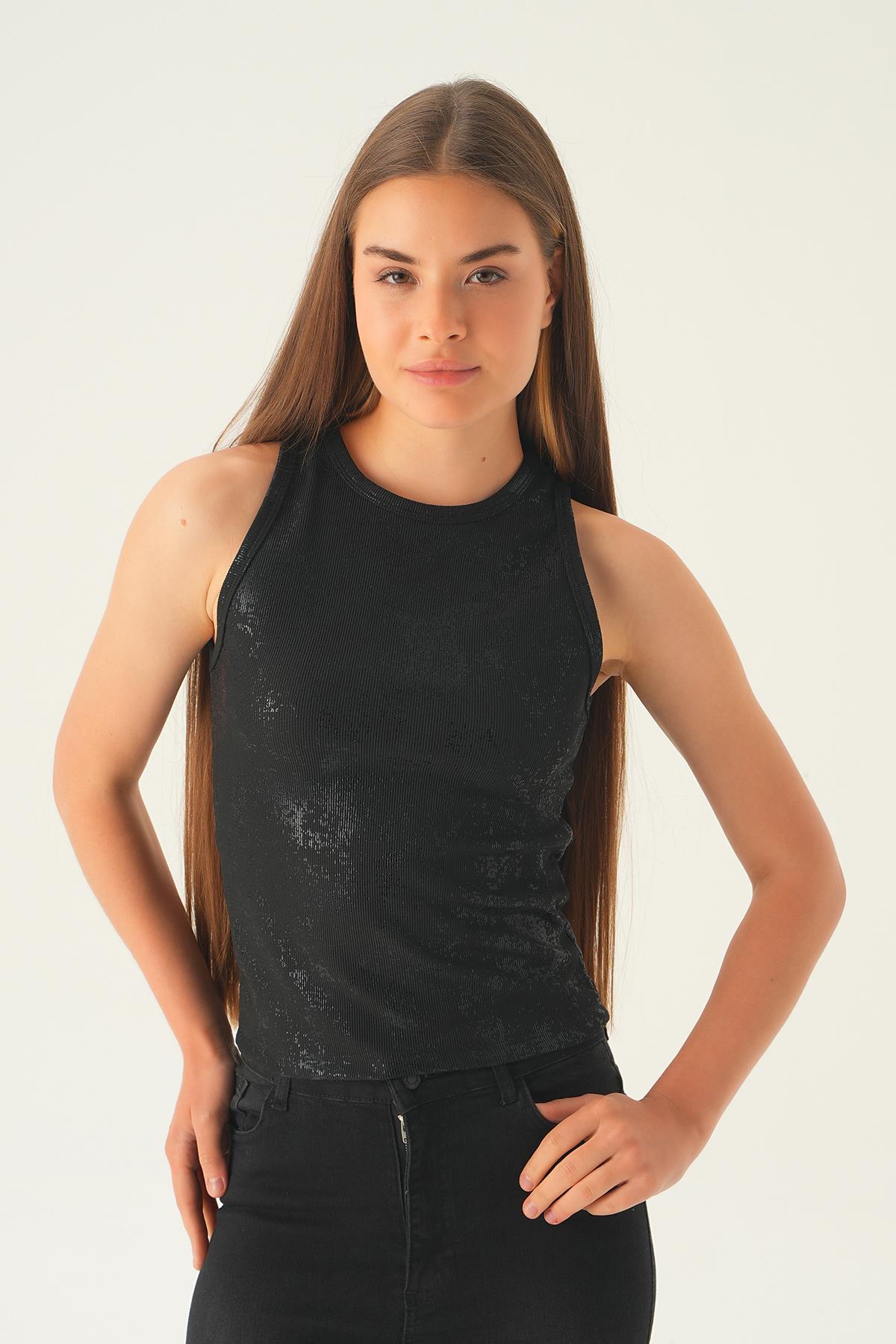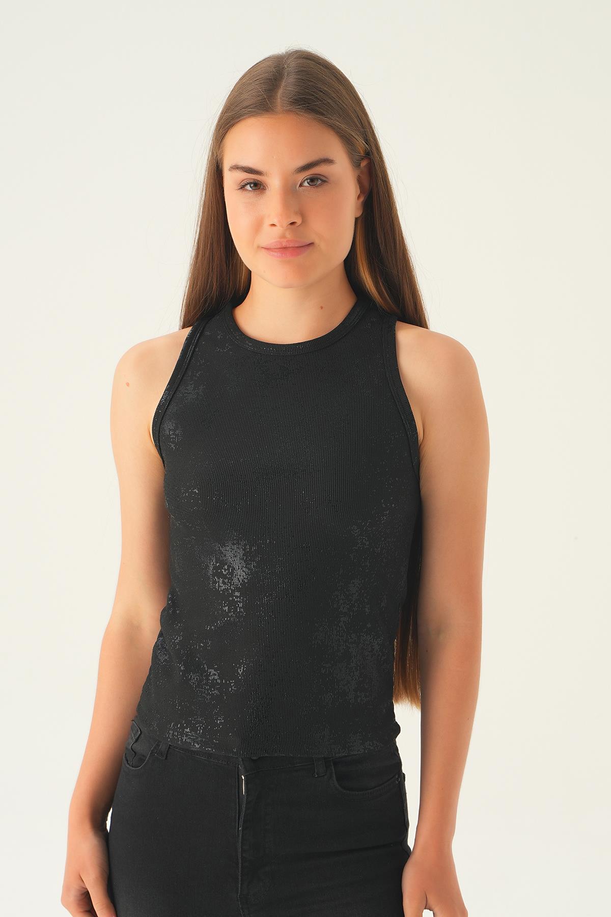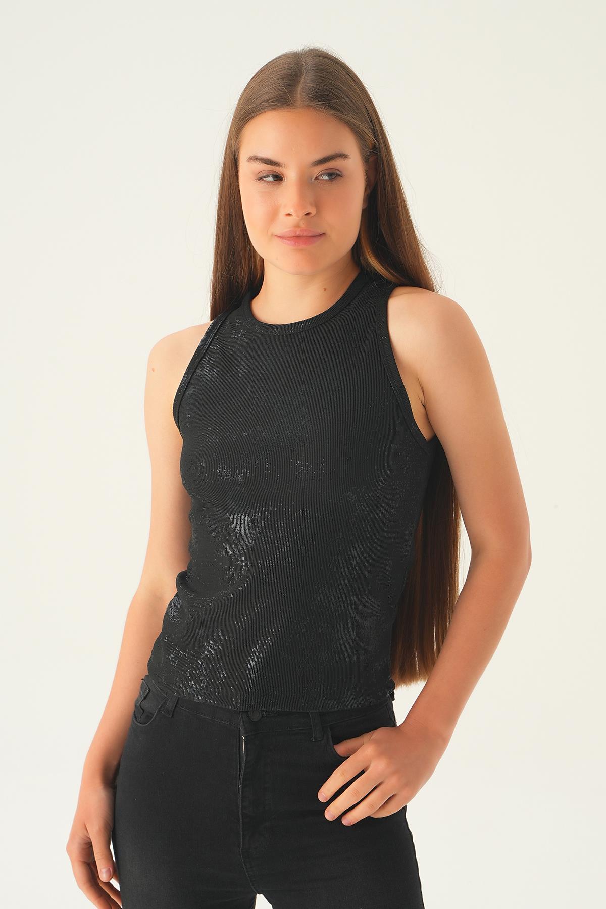 Siyah Varak Desen Sıfır Kol Bluz 21223
