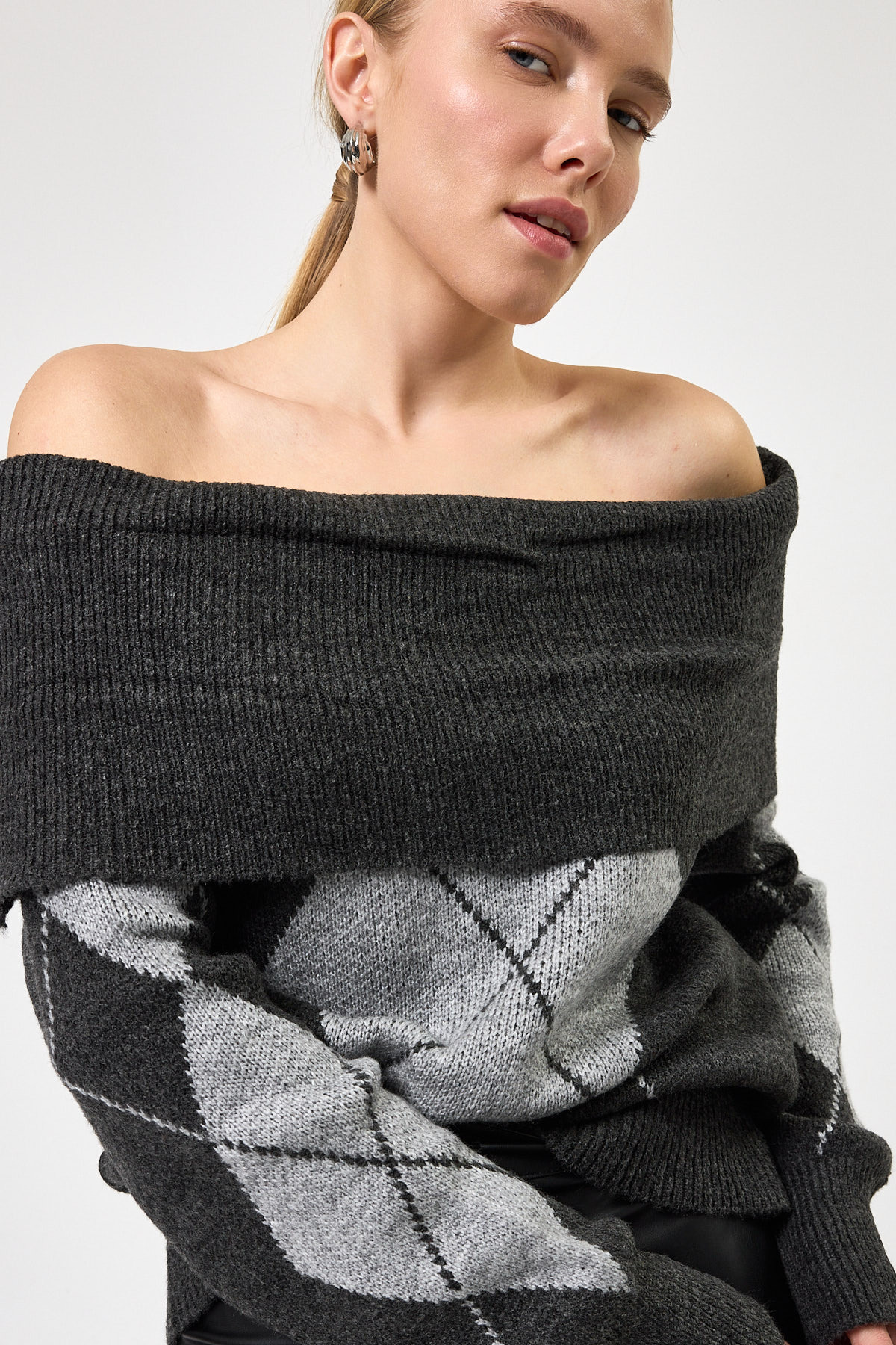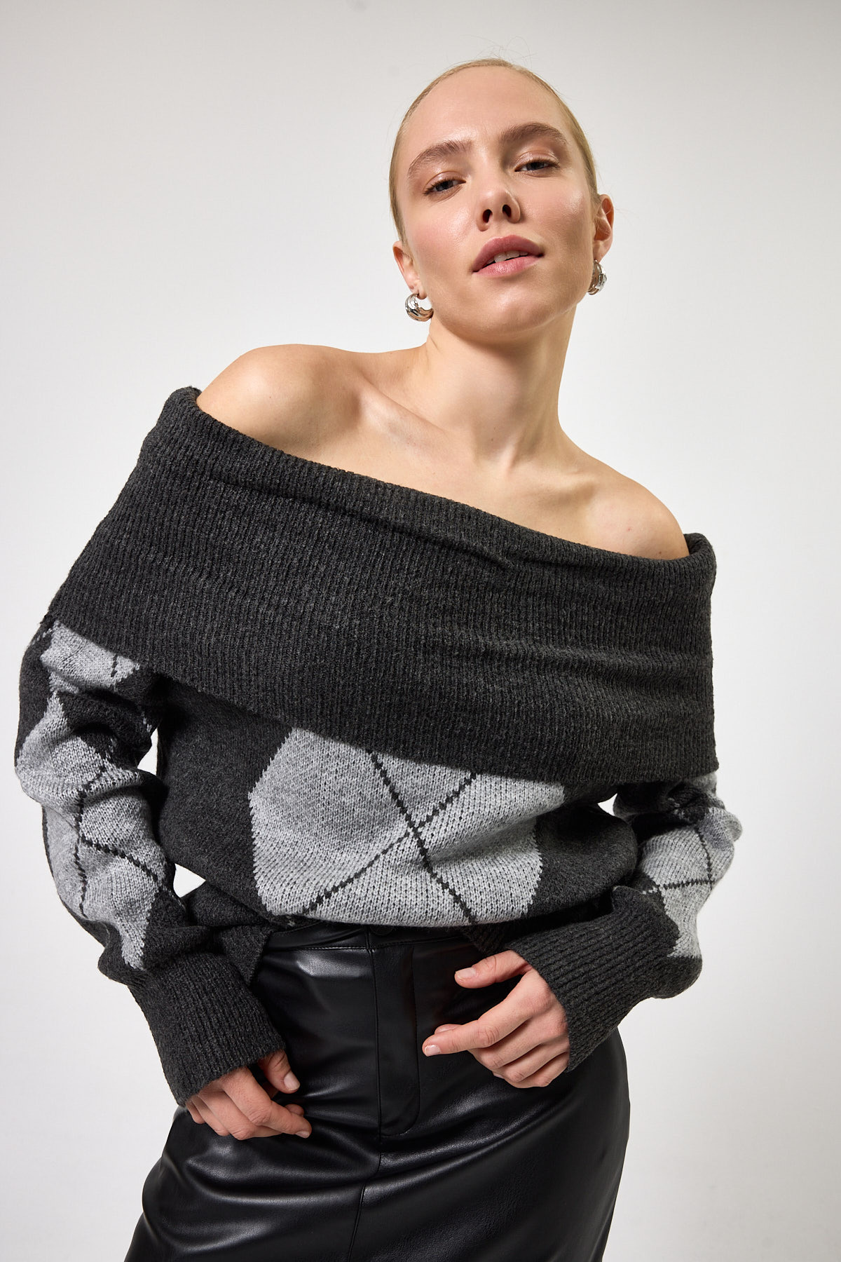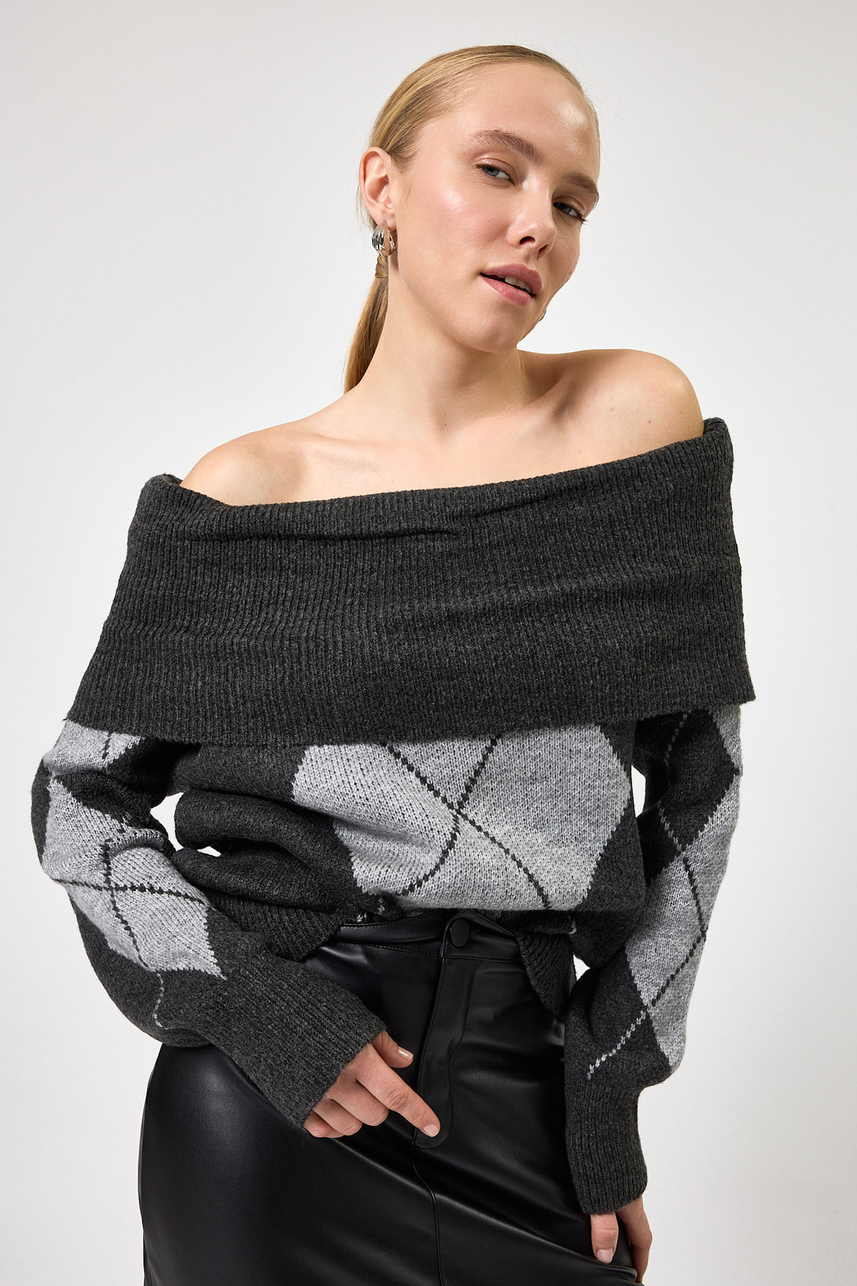 Antrasit - Açık Gri Düşük Omuz Desenli Kadın Triko Kazak 2123