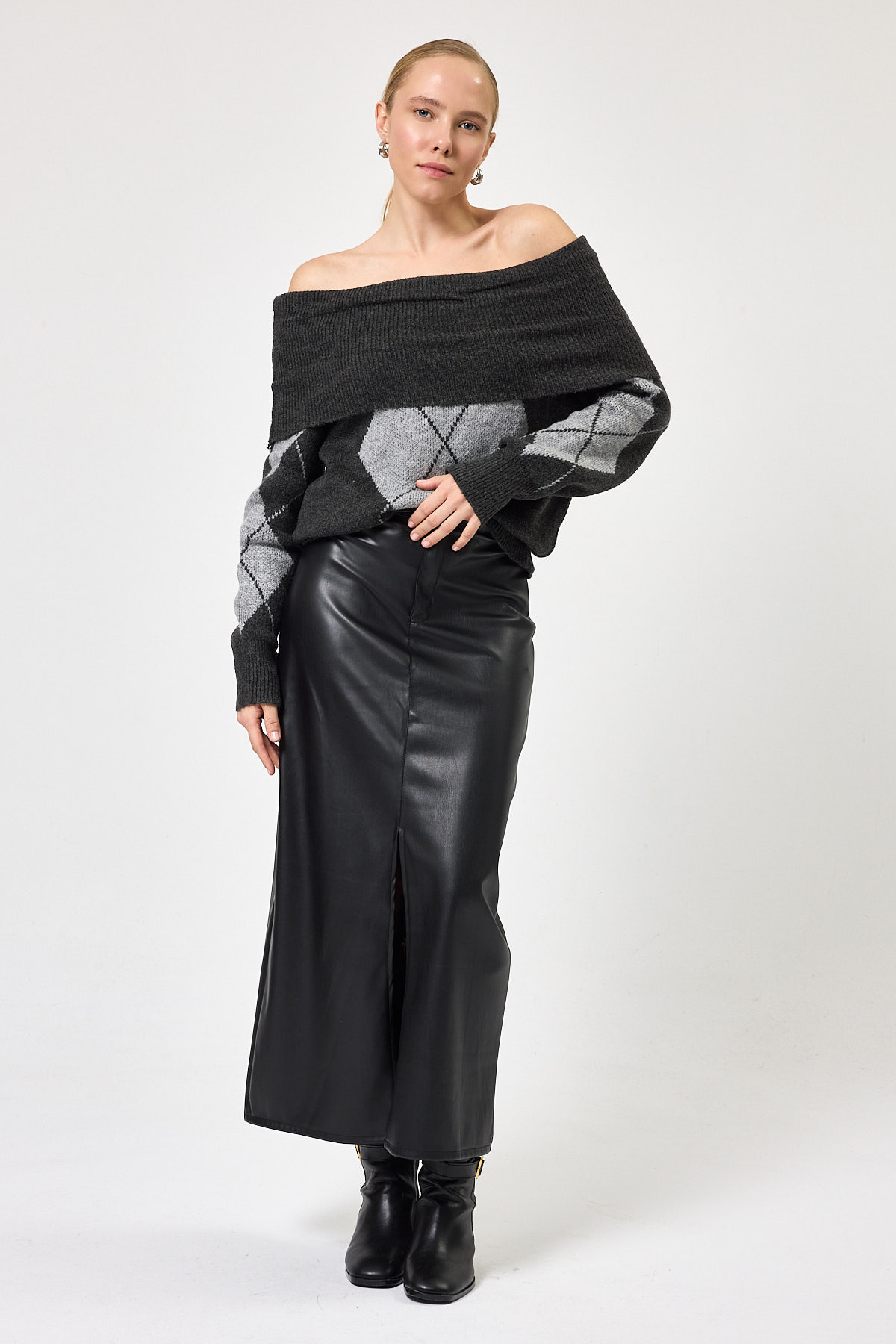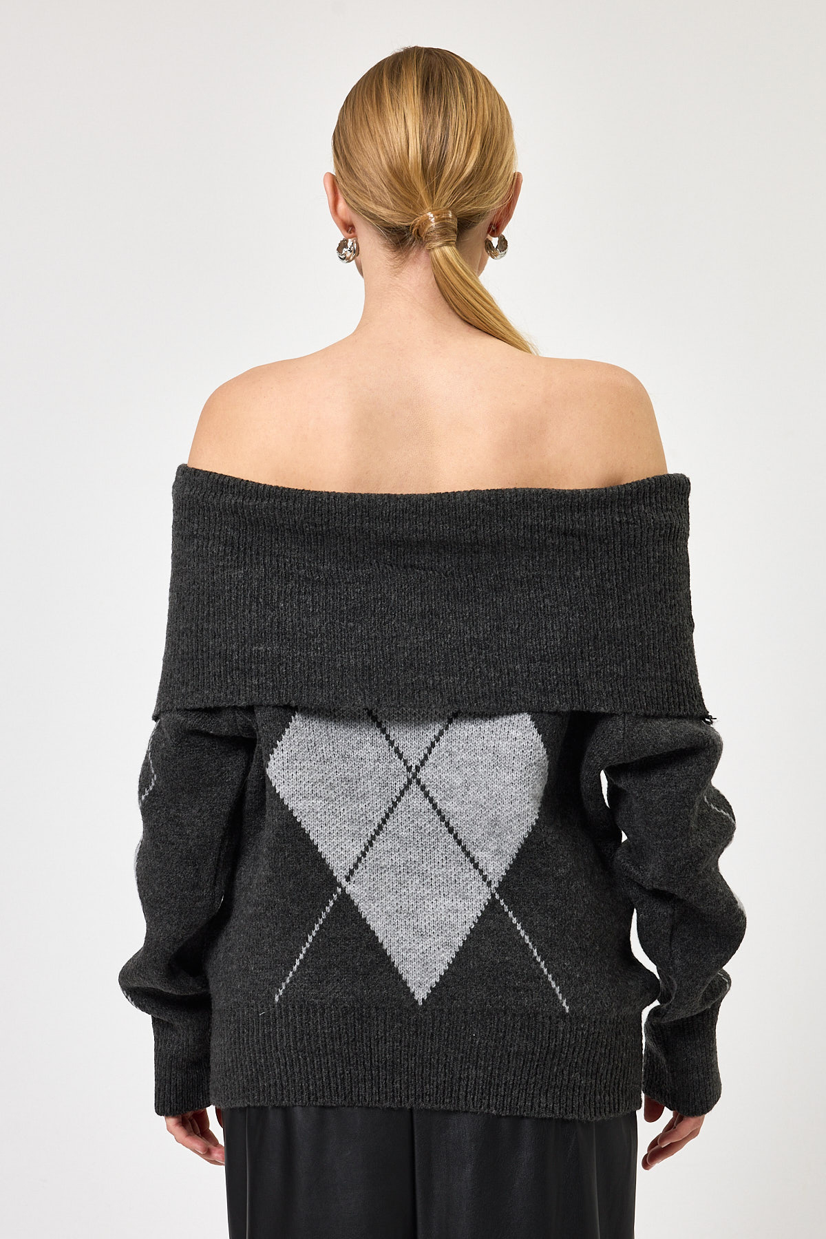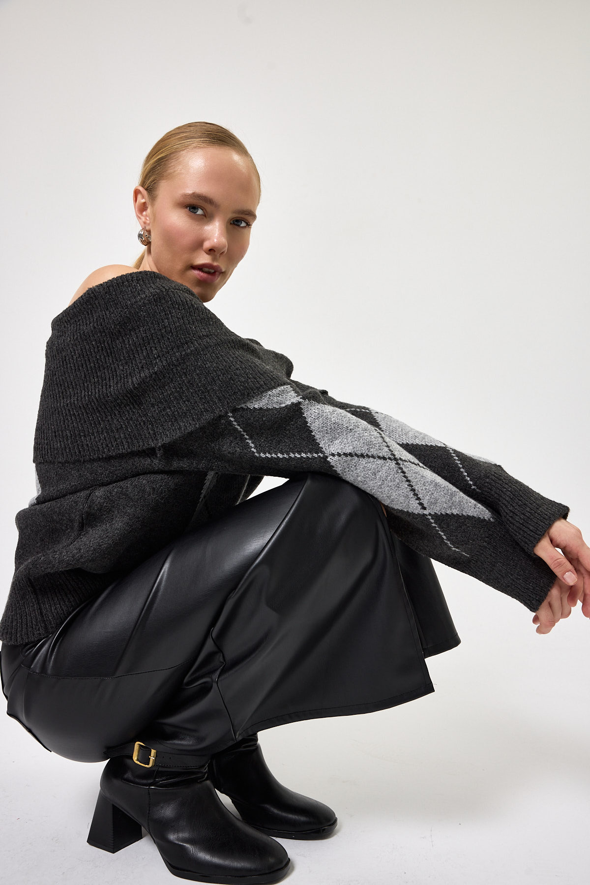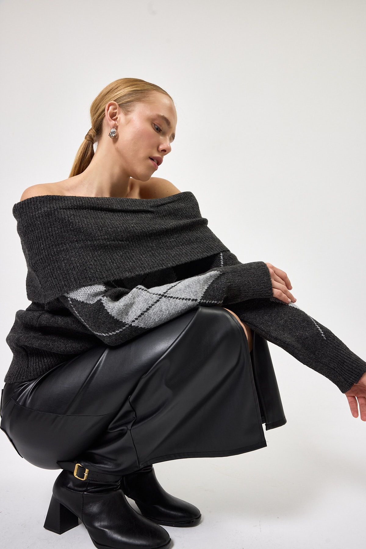 Antrasit - Açık Gri Düşük Omuz Desenli Kadın Triko Kazak 2123