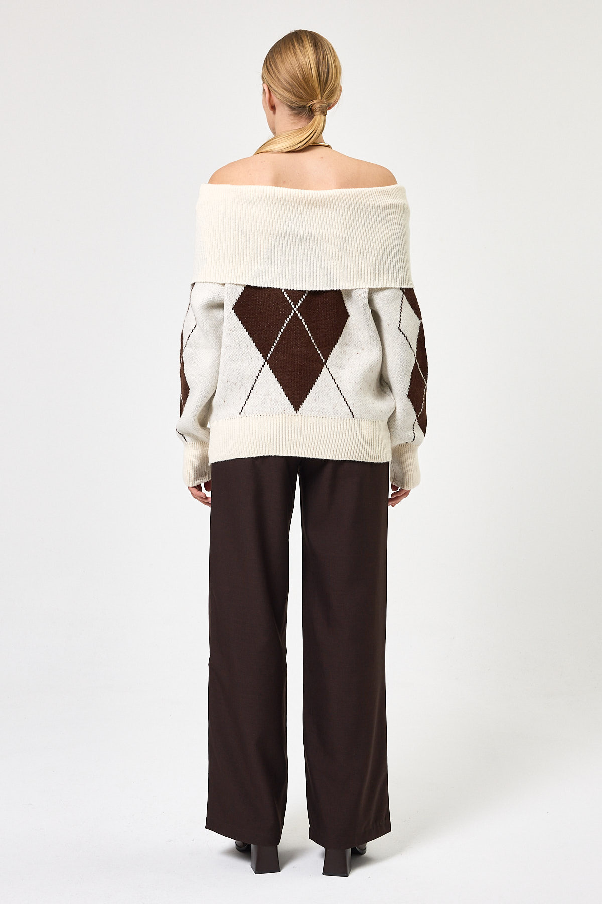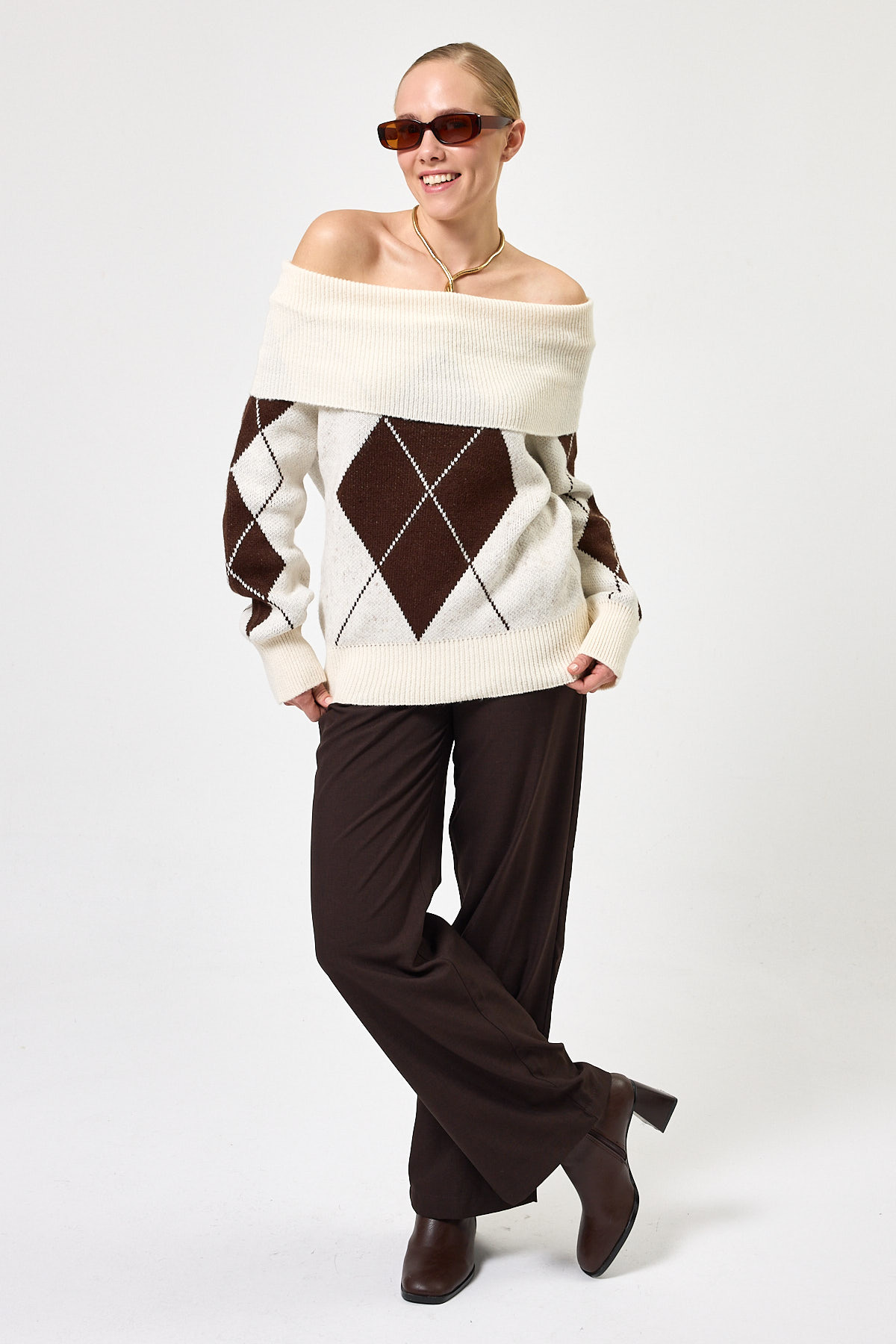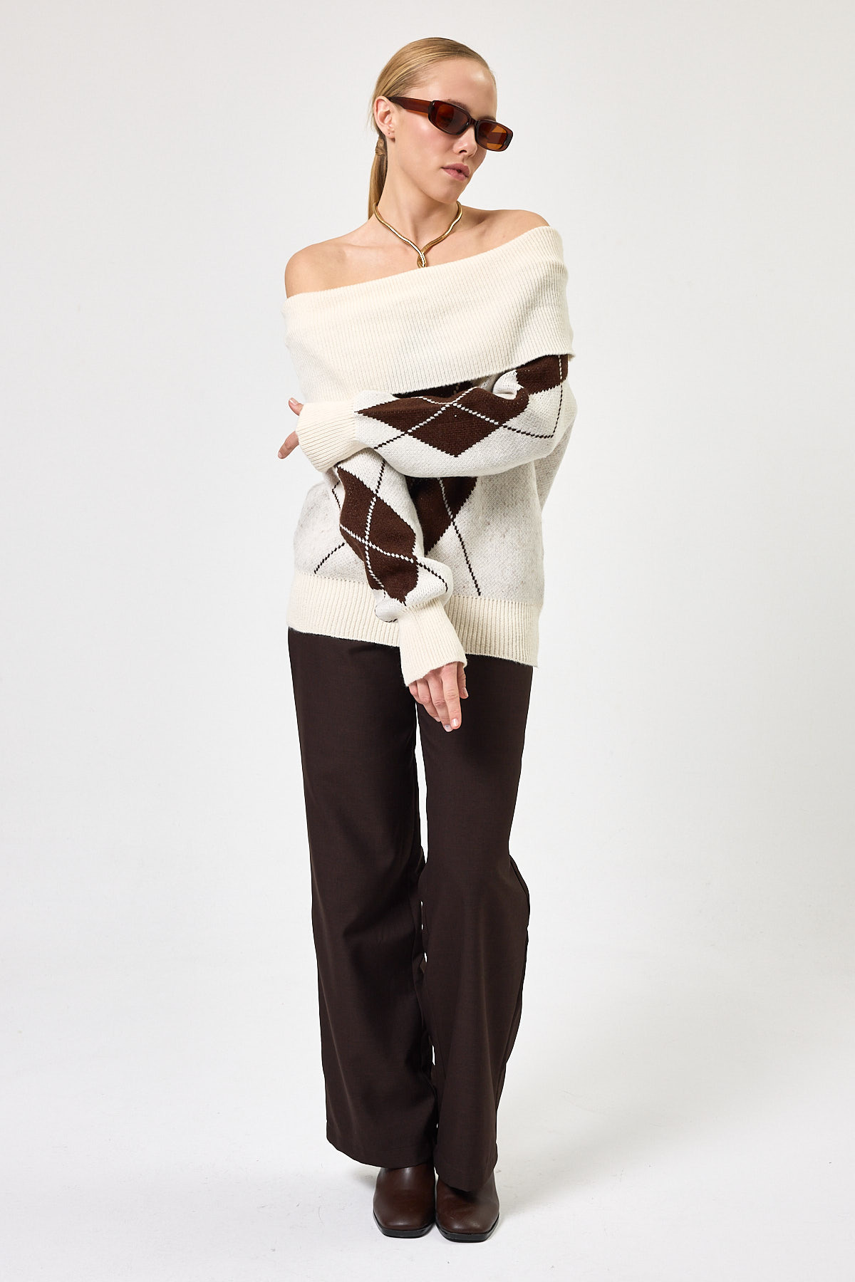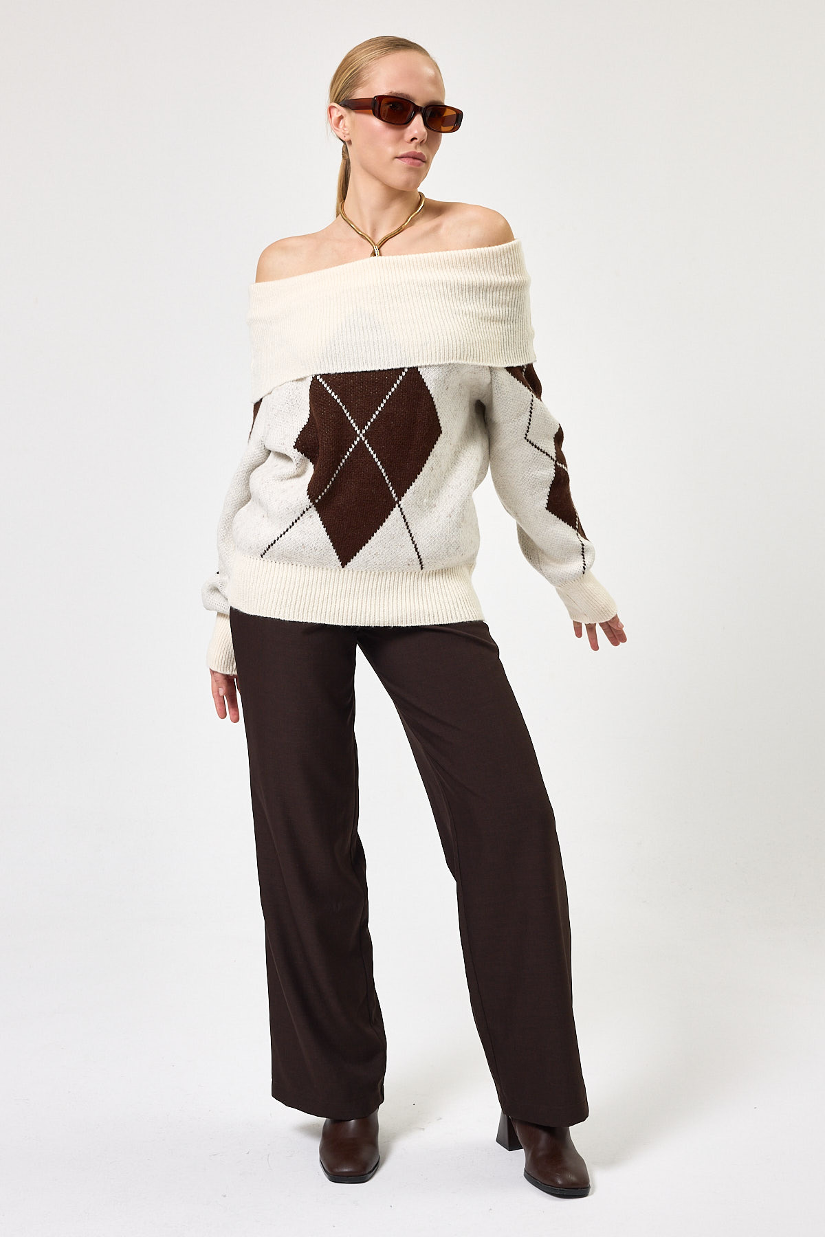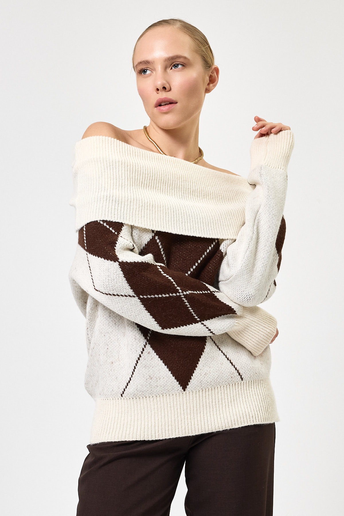 Ekru - Kahverengi Düşük Omuz Desenli Kadın Triko Kazak 2123
