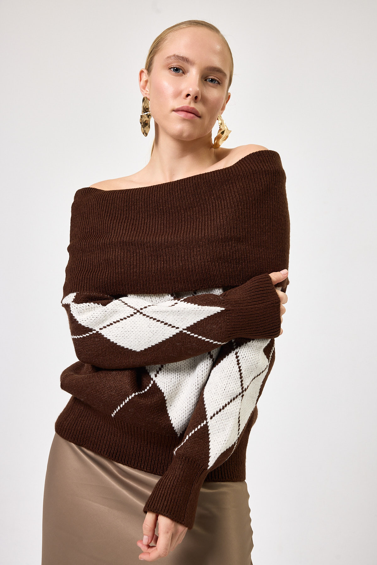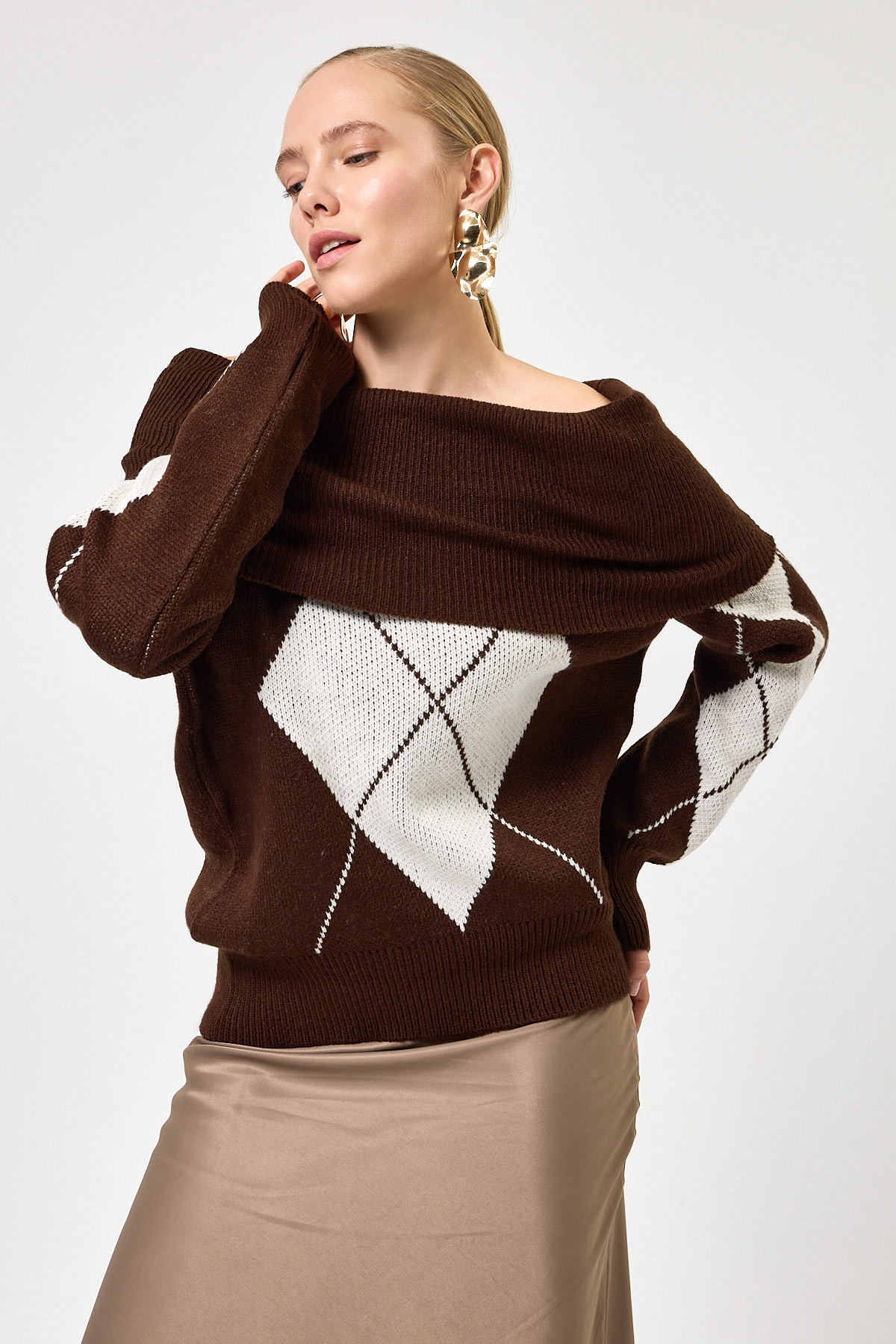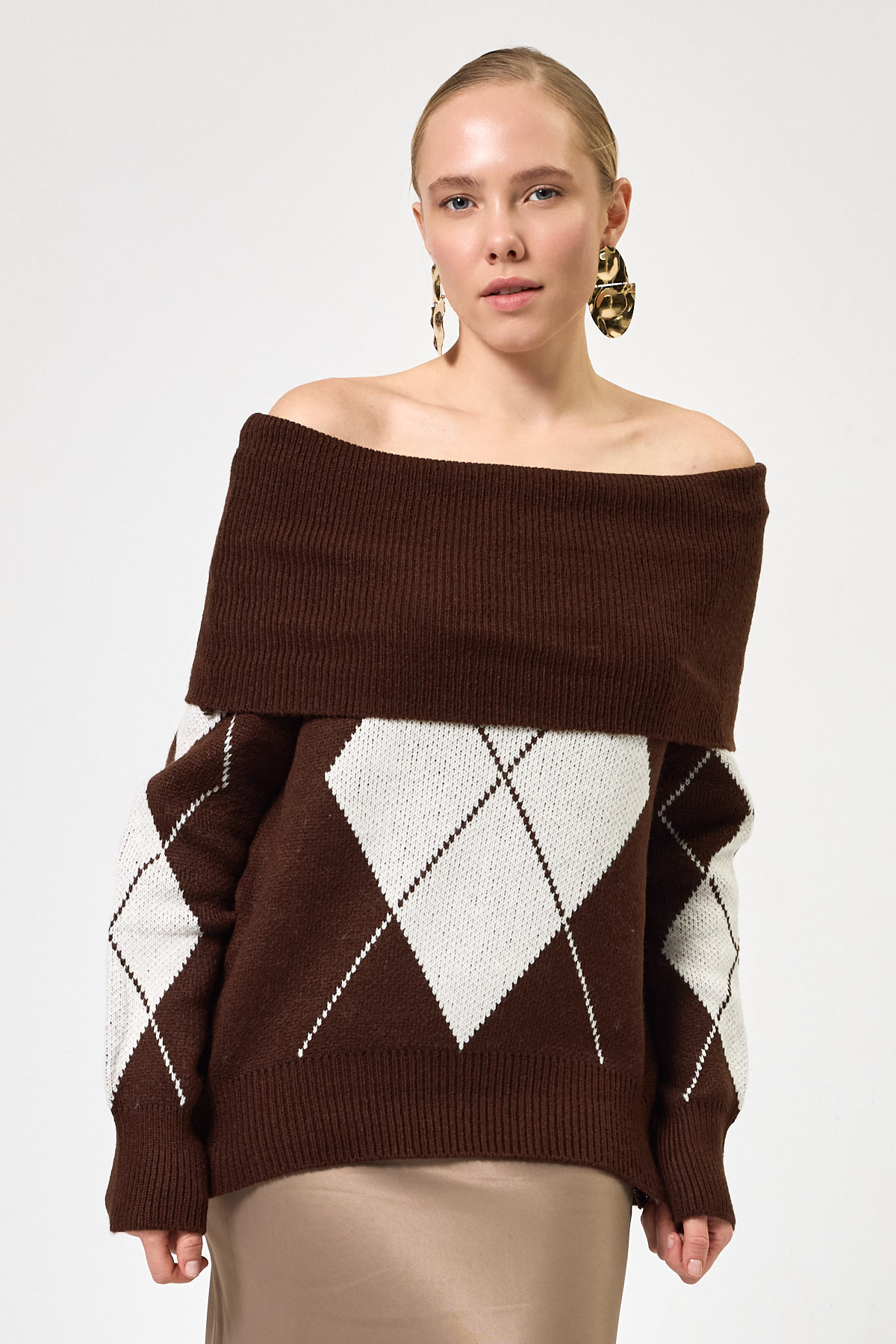 Kahverengi - Bej Düşük Omuz Desenli Kadın Triko Kazak 2123