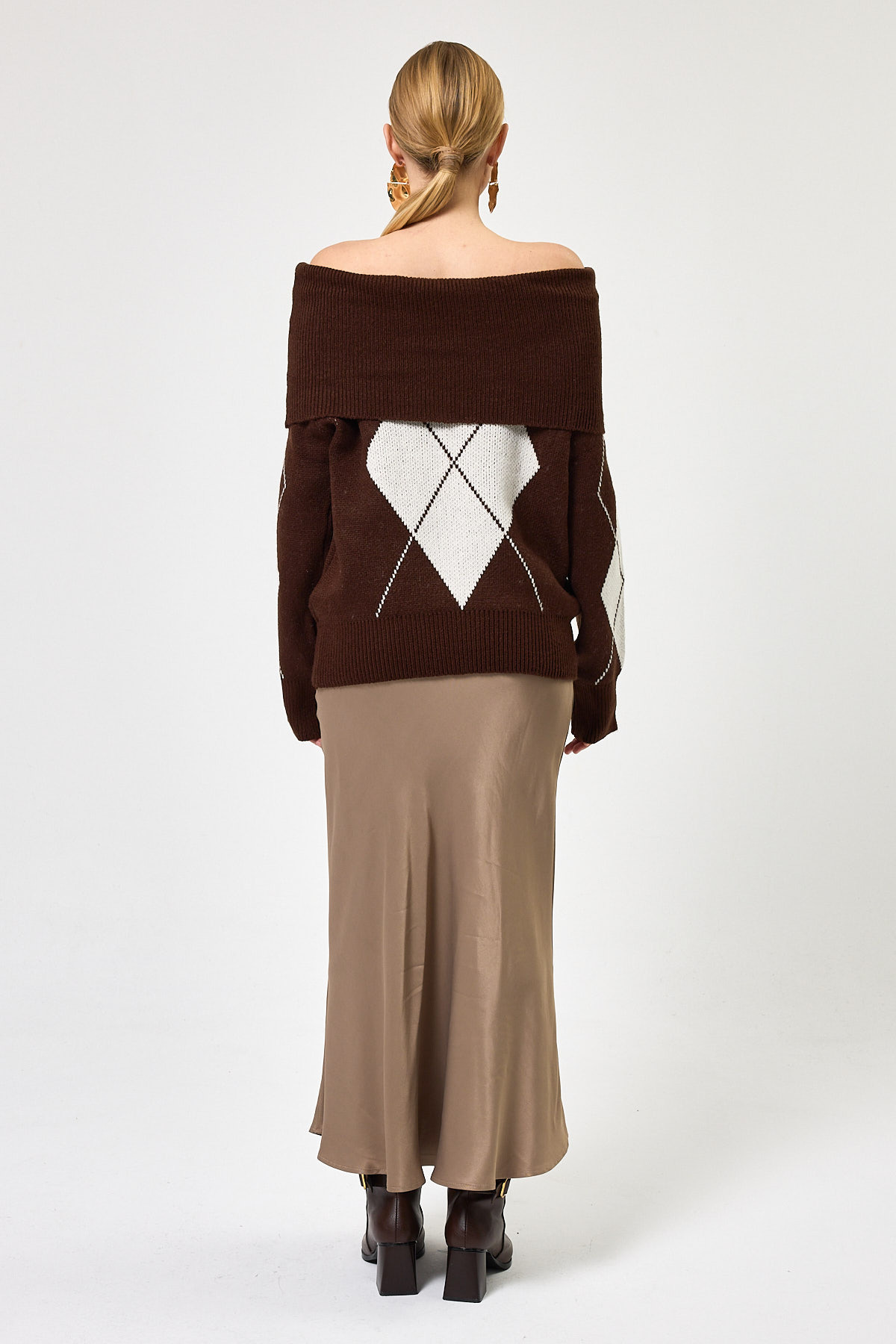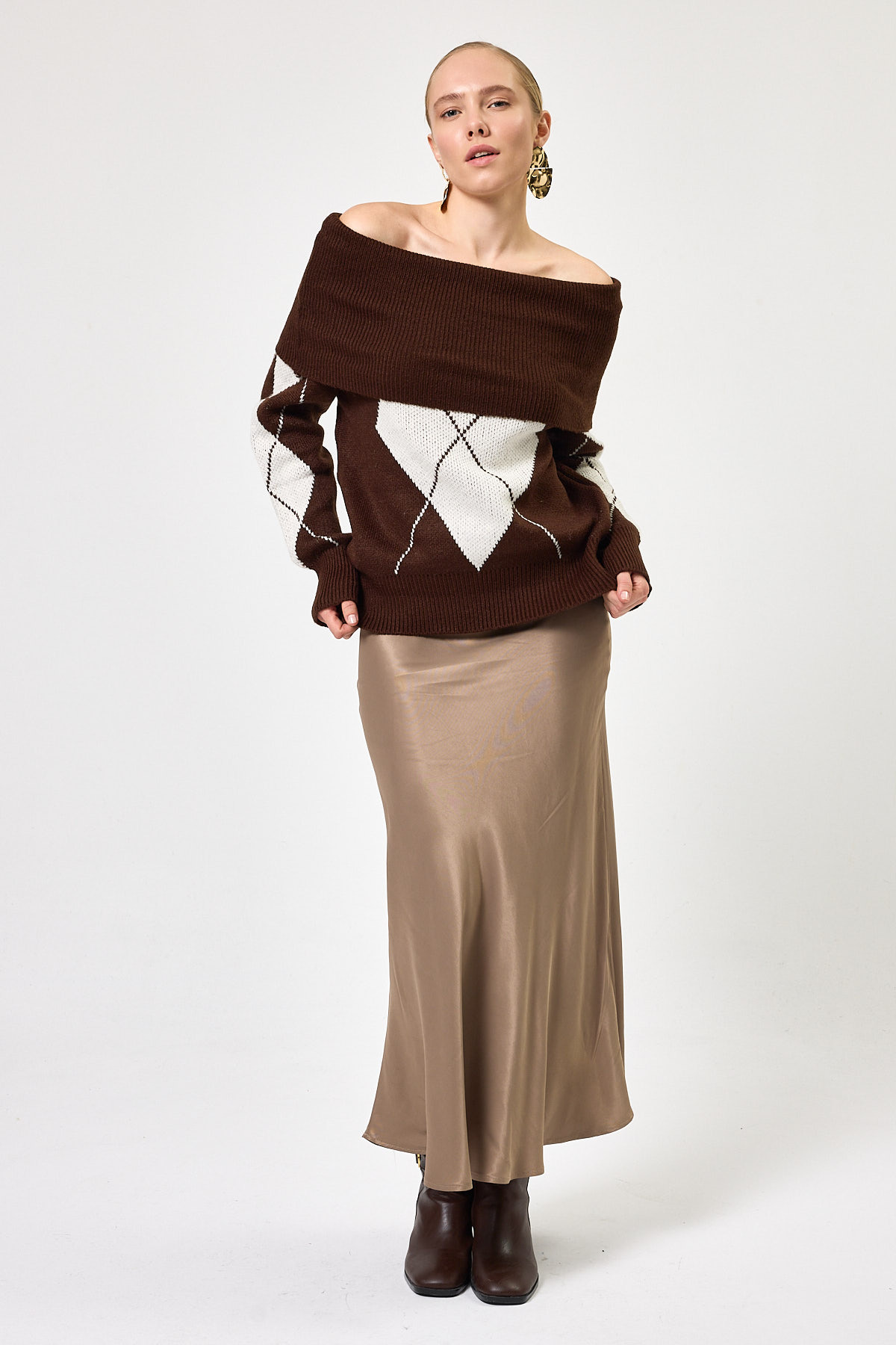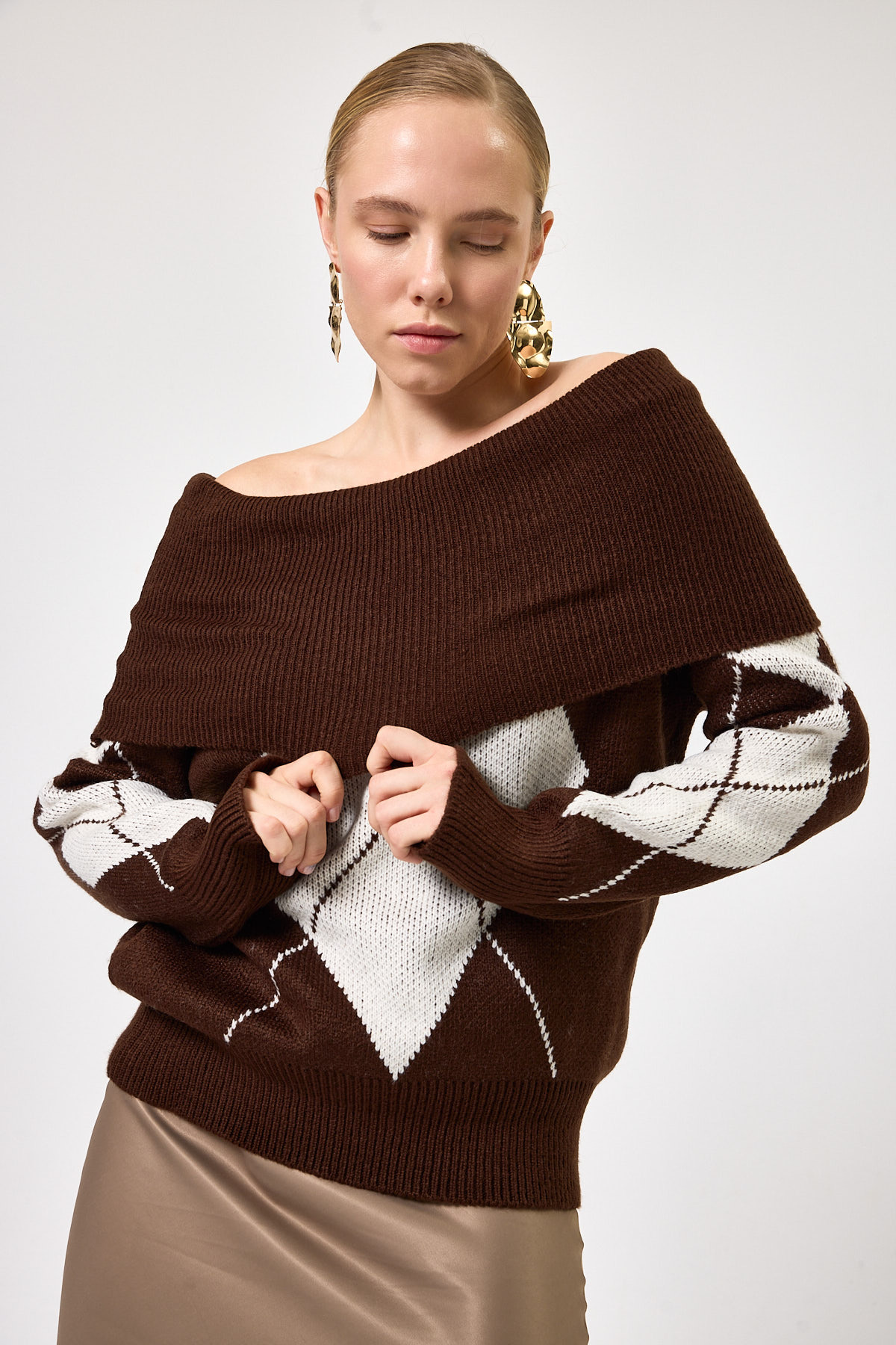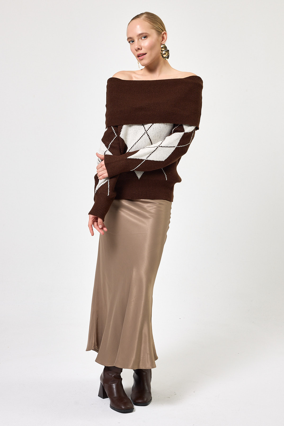 Kahverengi - Bej Düşük Omuz Desenli Kadın Triko Kazak 2123