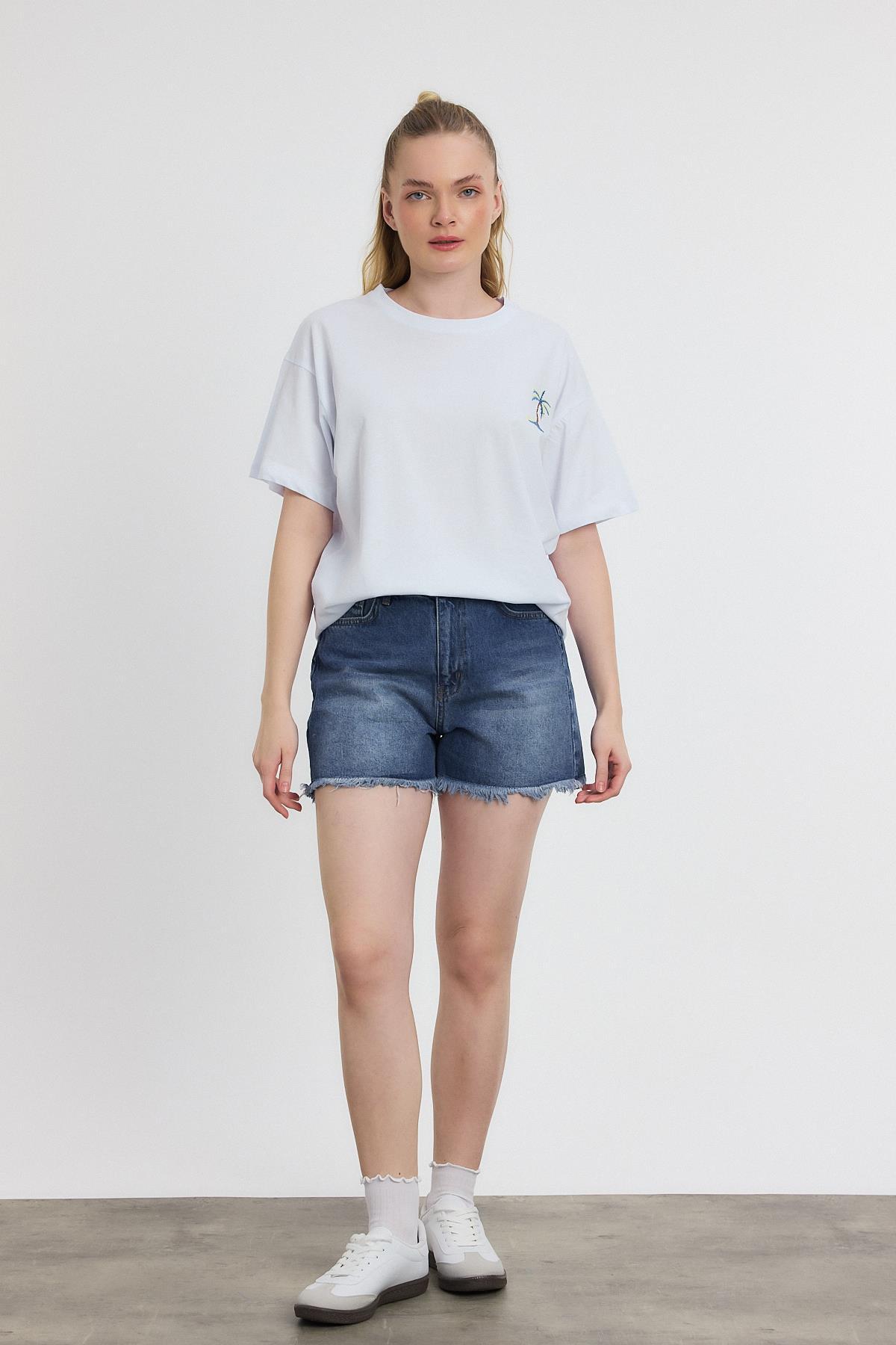 2150-16 Bisiklet Yaka Nakışlı Tişört Beyaz