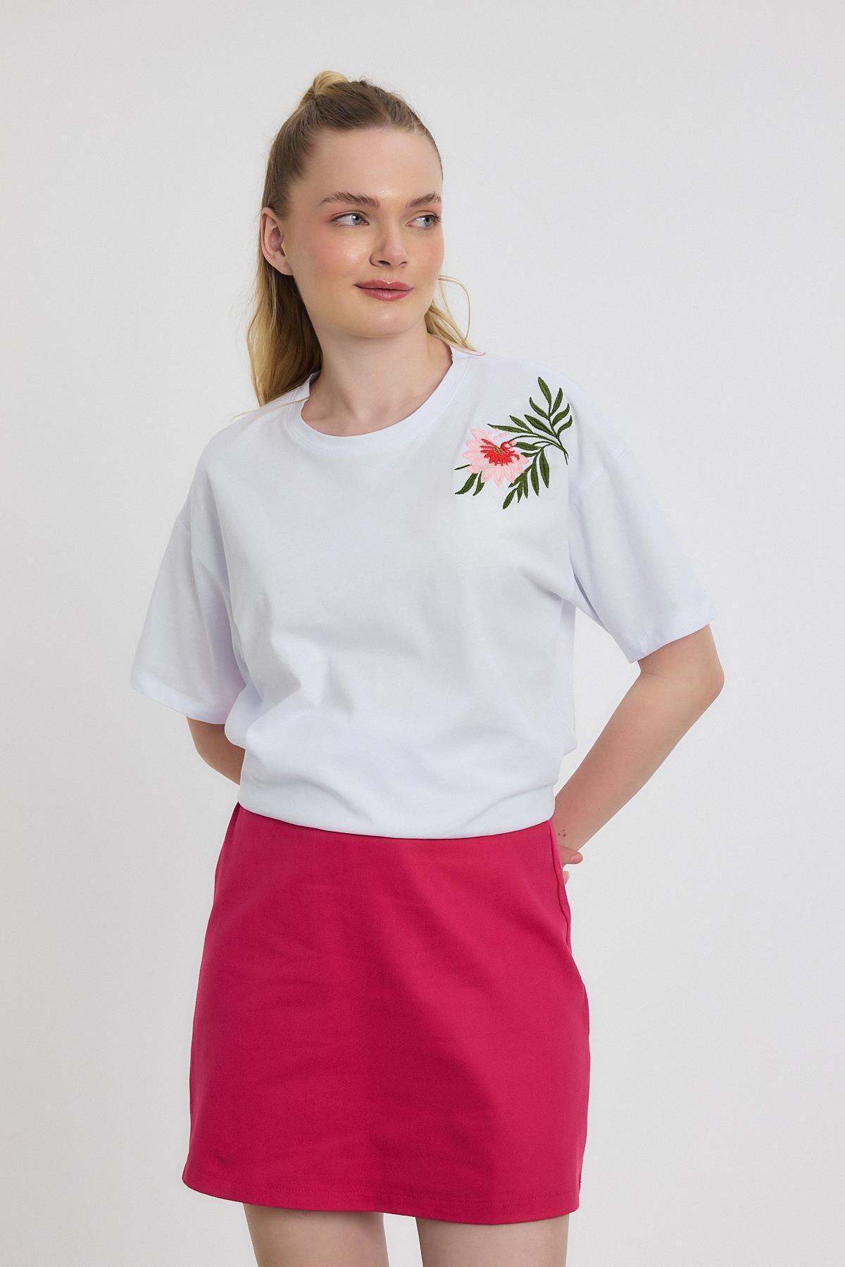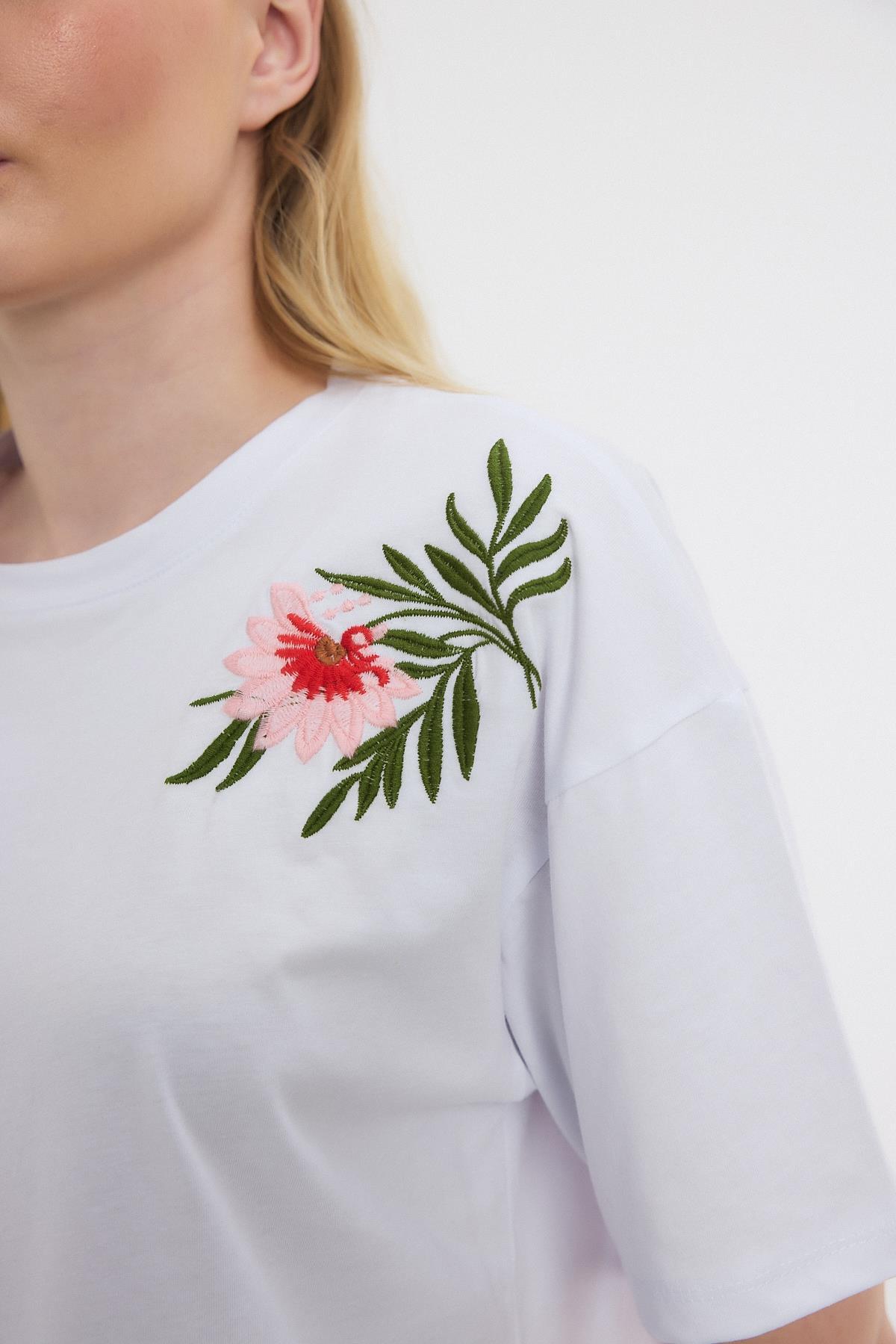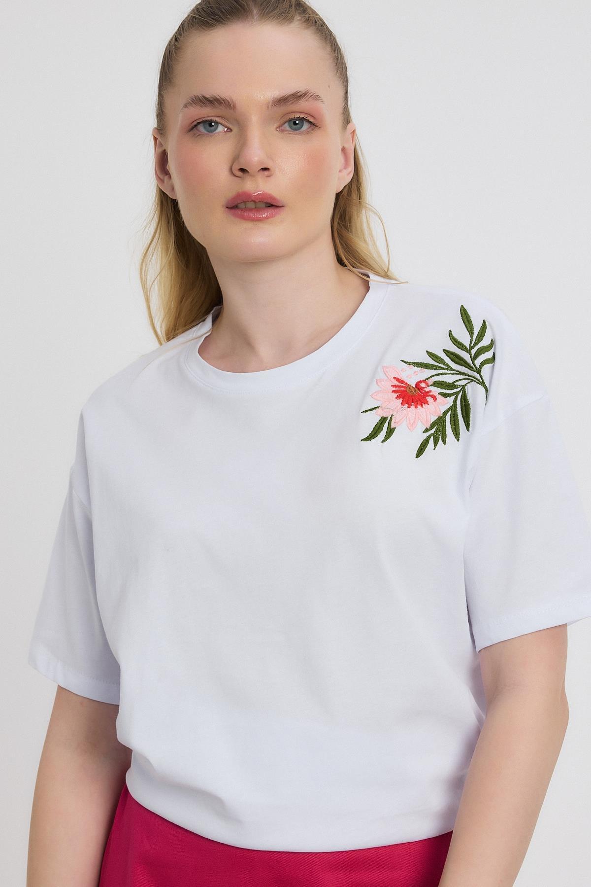 Beyaz Çiçek Nakışlı Tişört 2150-21M