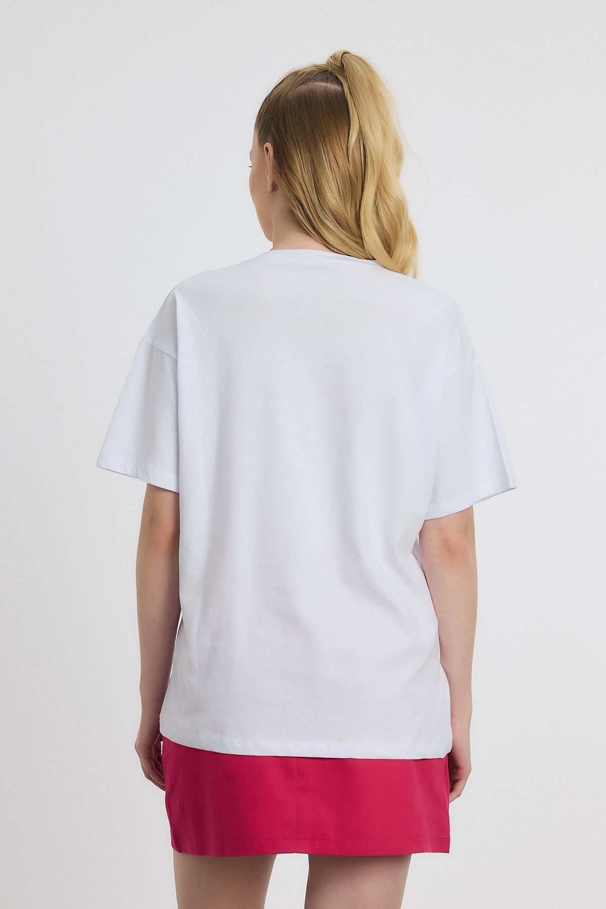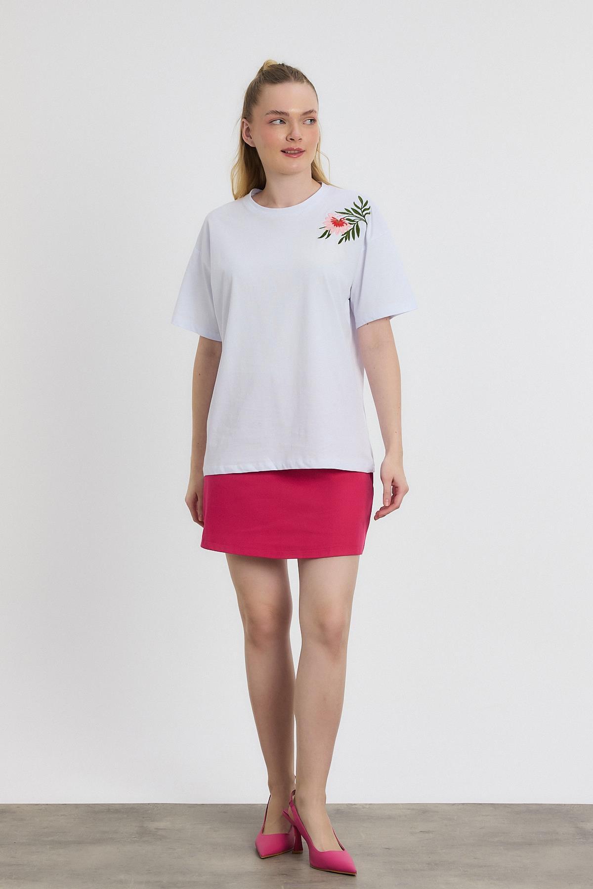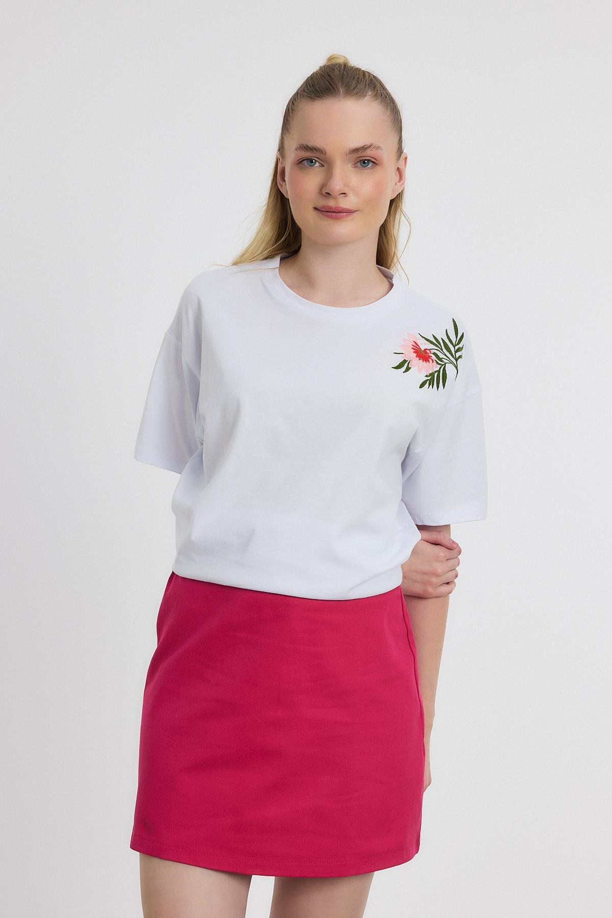 Beyaz Çiçek Nakışlı Tişört 2150-21M