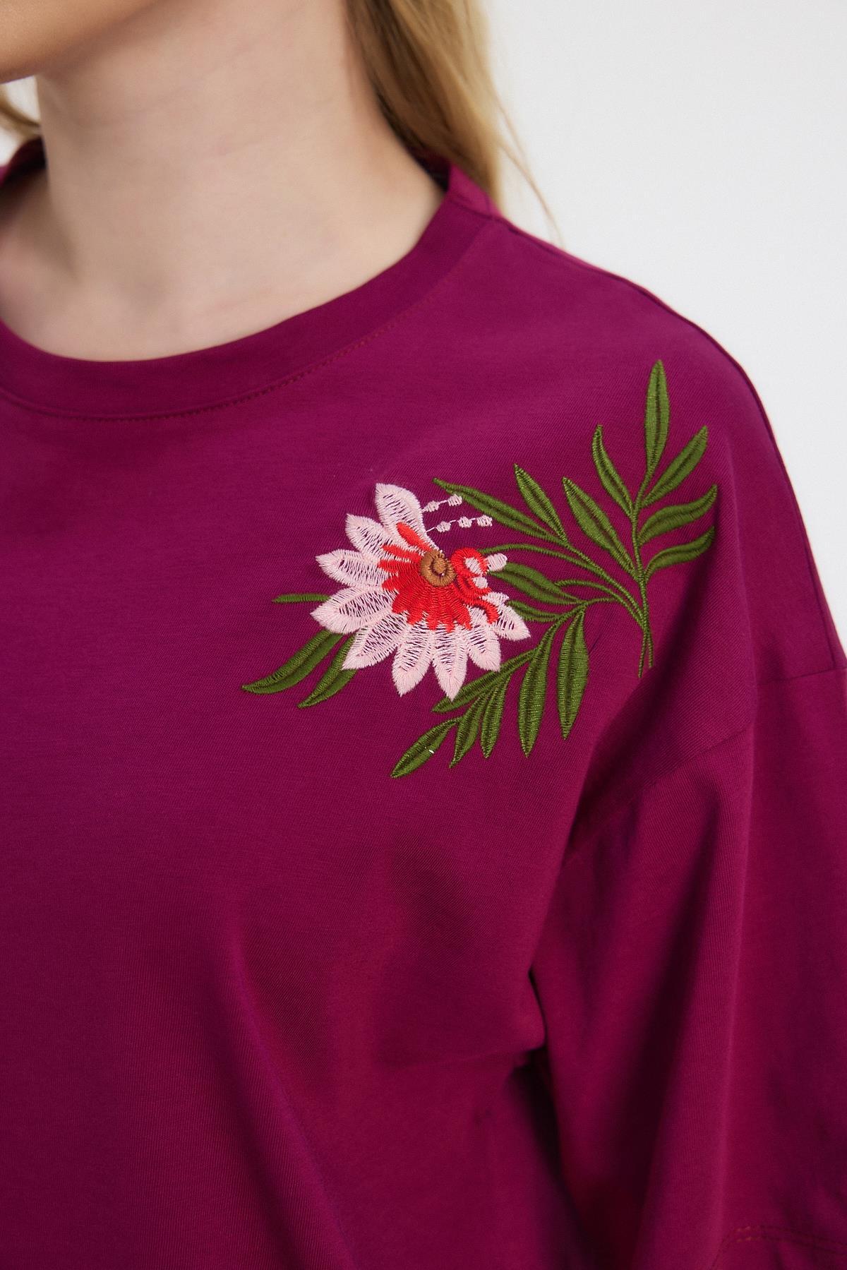 Bordo Çiçek Nakışlı Tişört 2150-21M