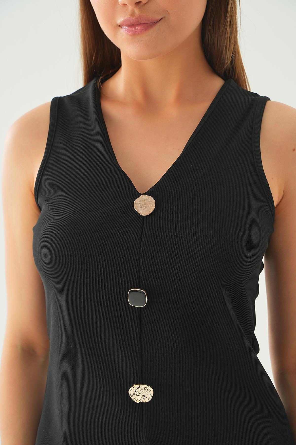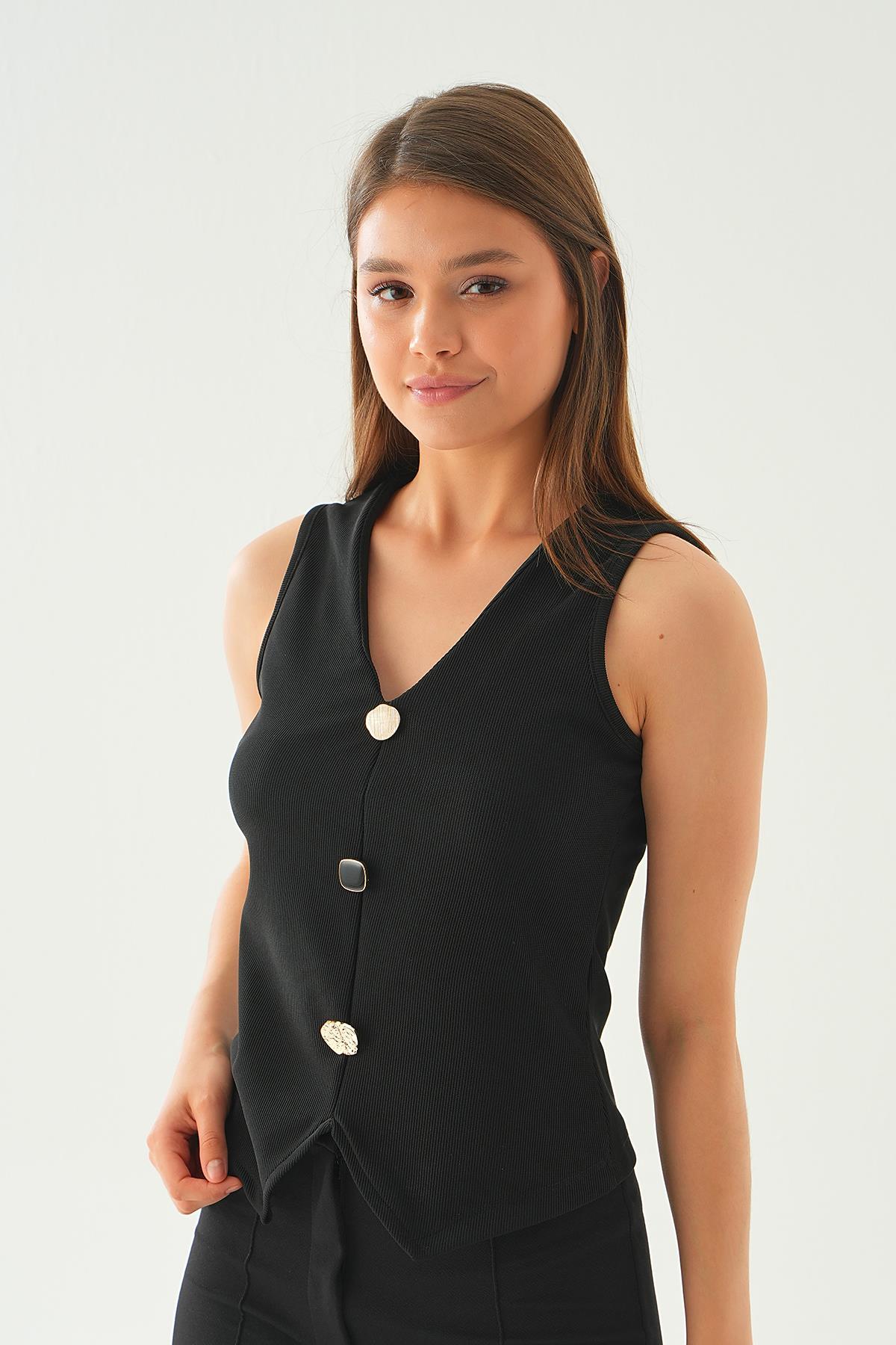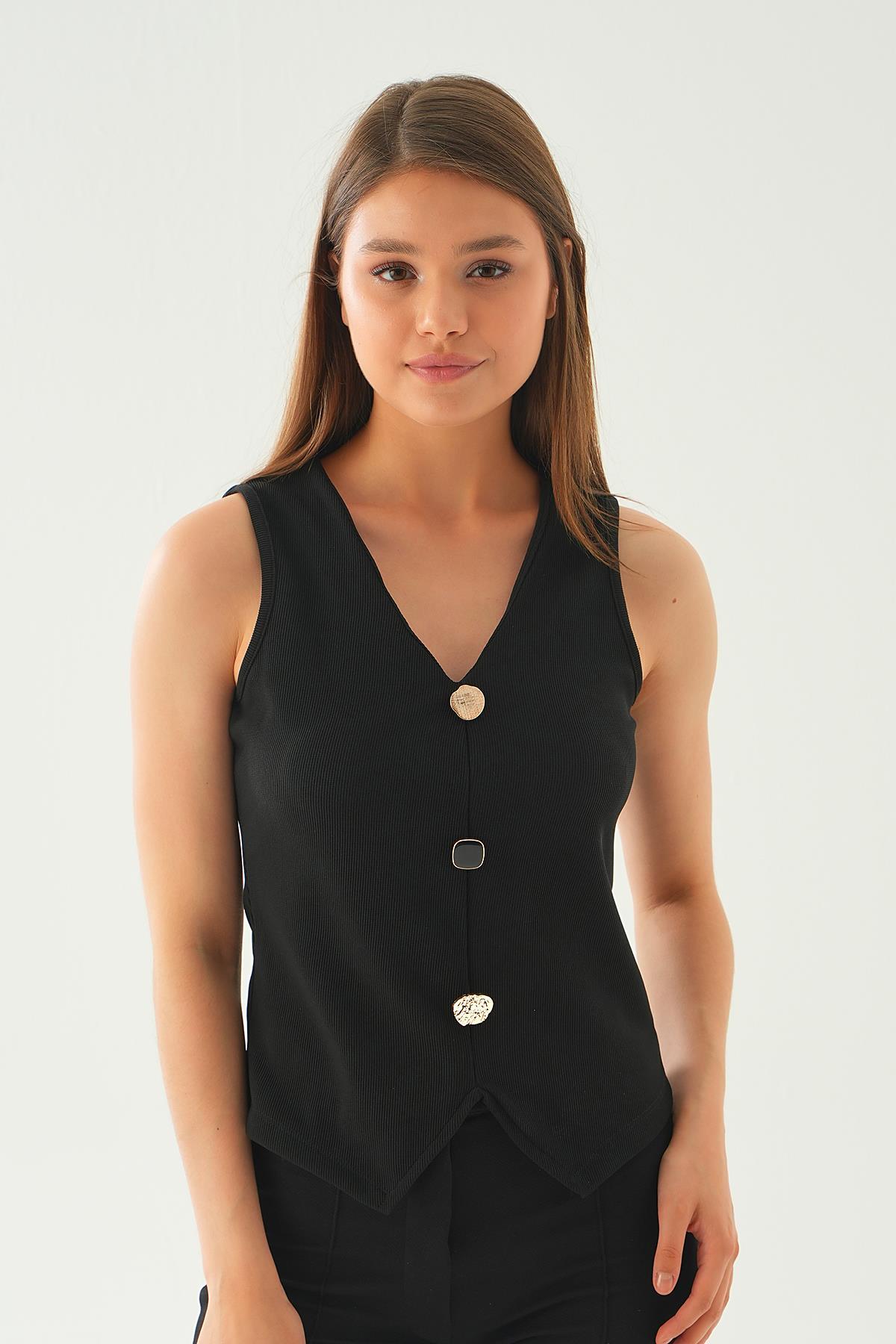 Siyah Düğme Detay Kolsuz Bluz 21535