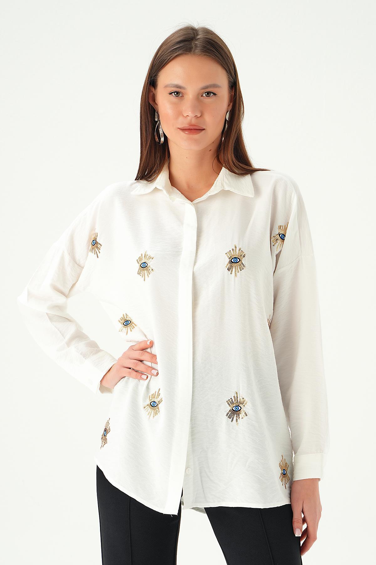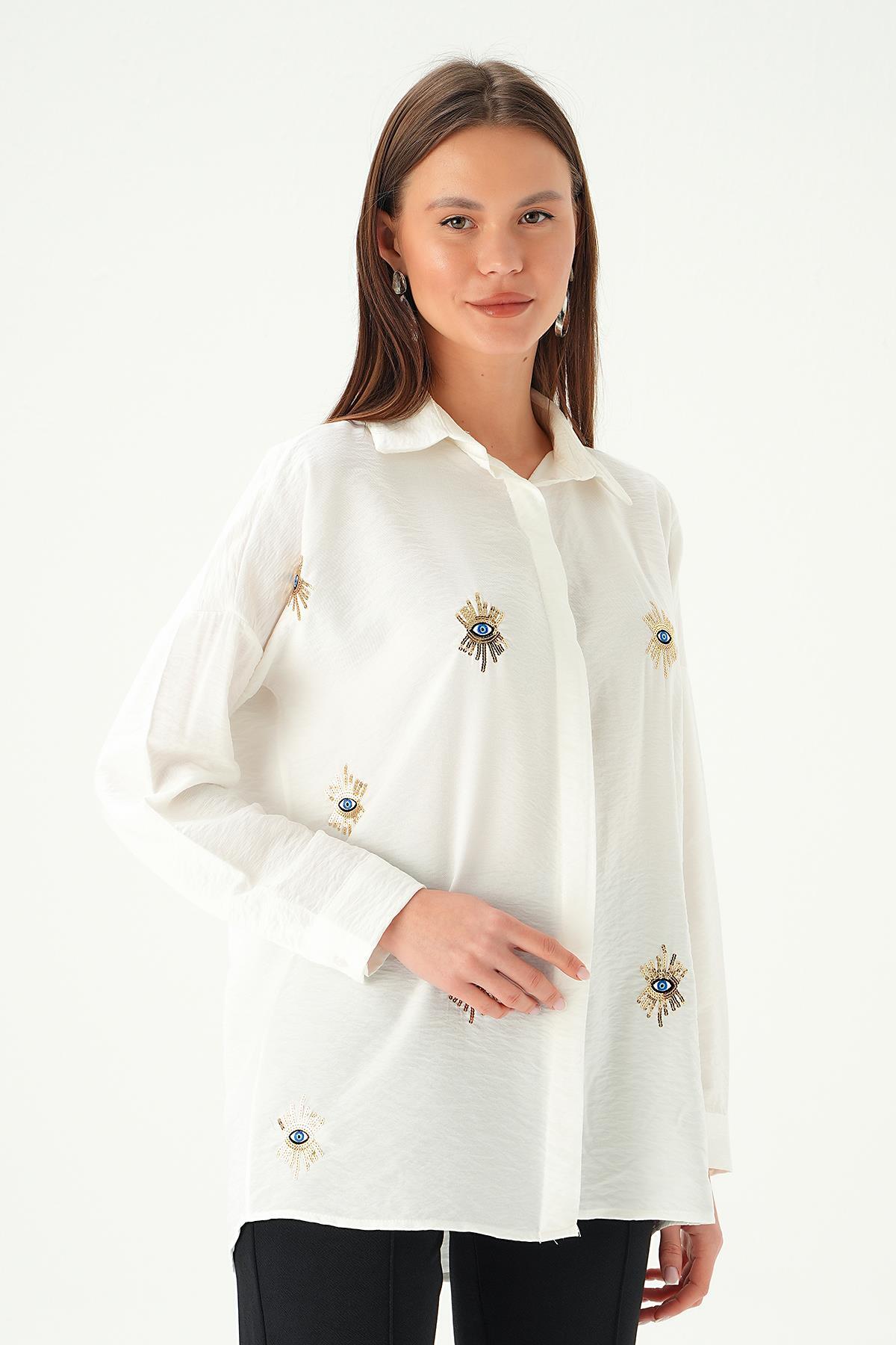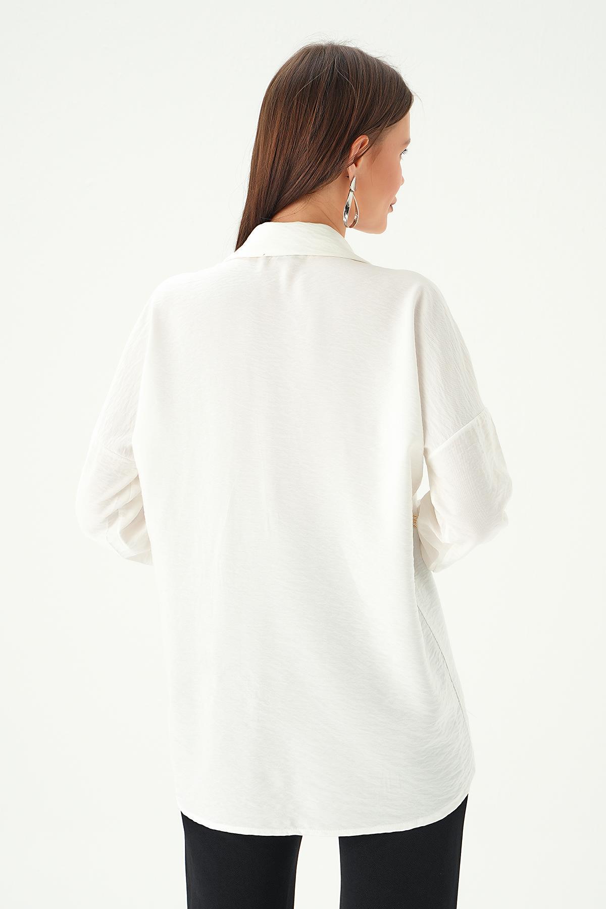 Bej Üçgen Fularlı Oversize Ekose Gömlek 5484