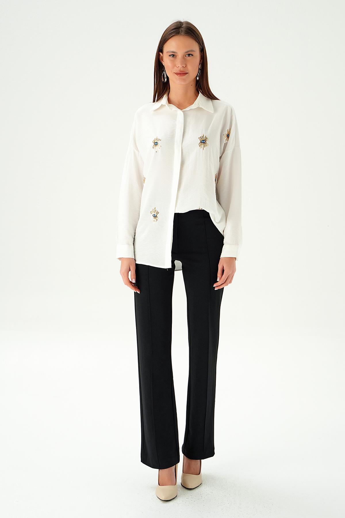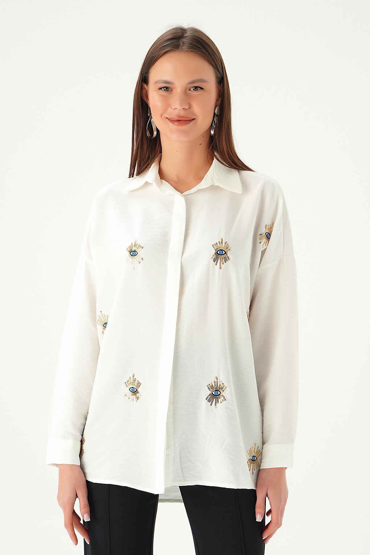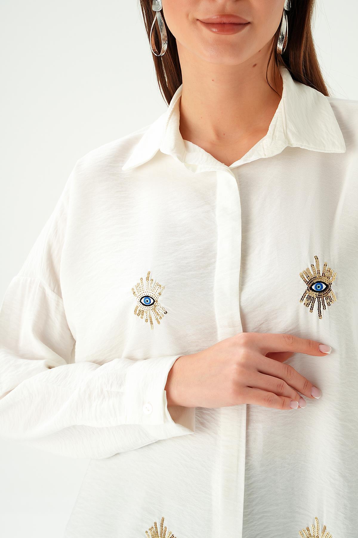 Bej Üçgen Fularlı Oversize Ekose Gömlek 5484