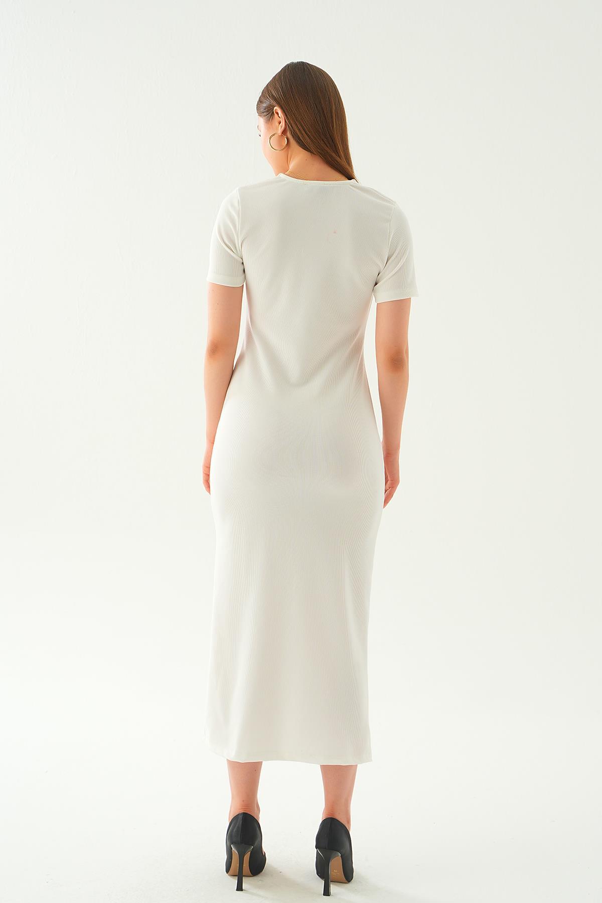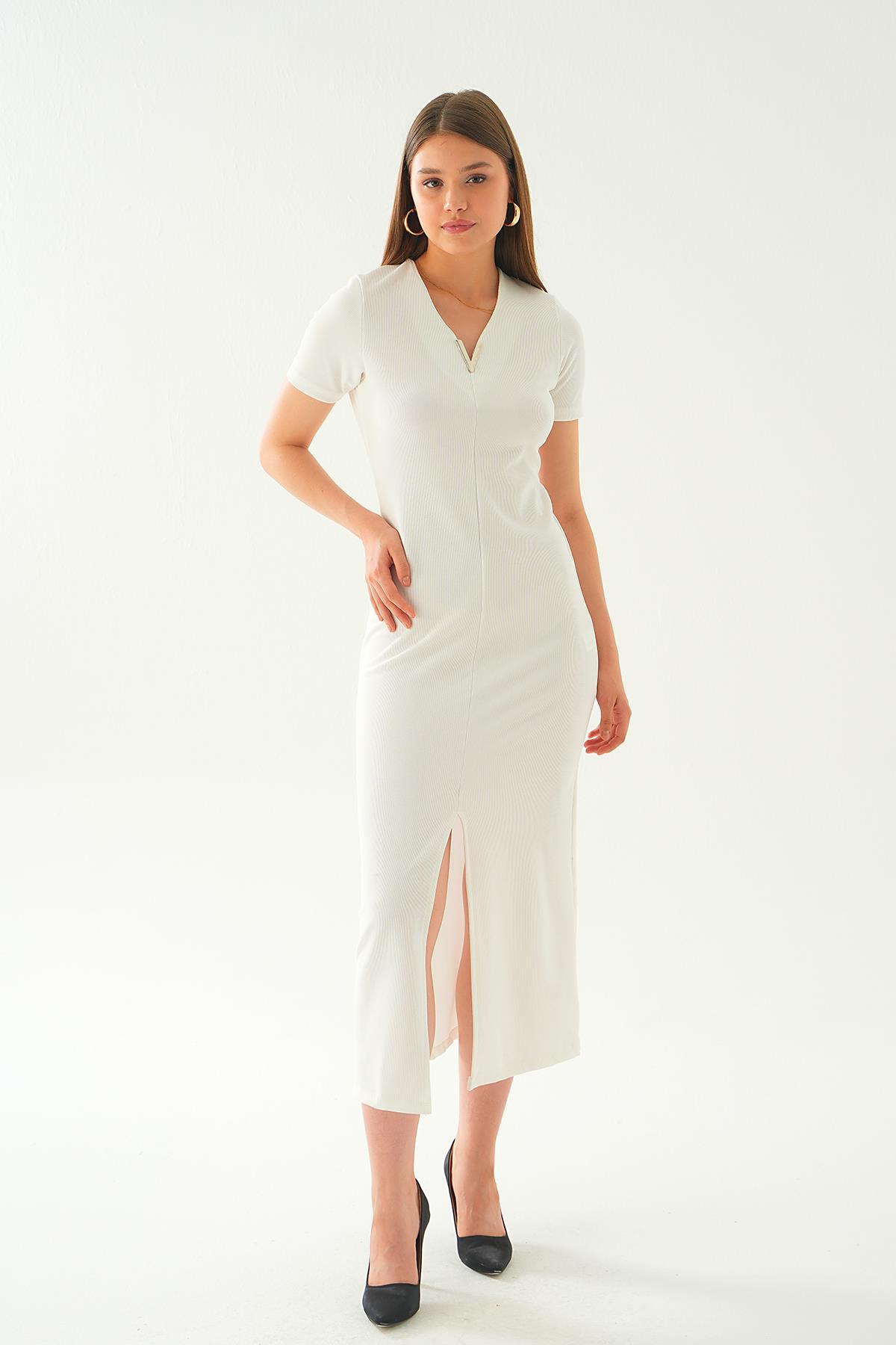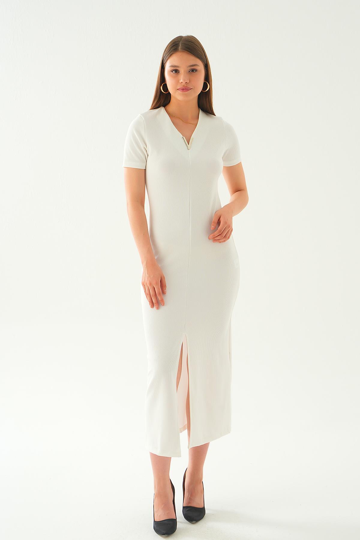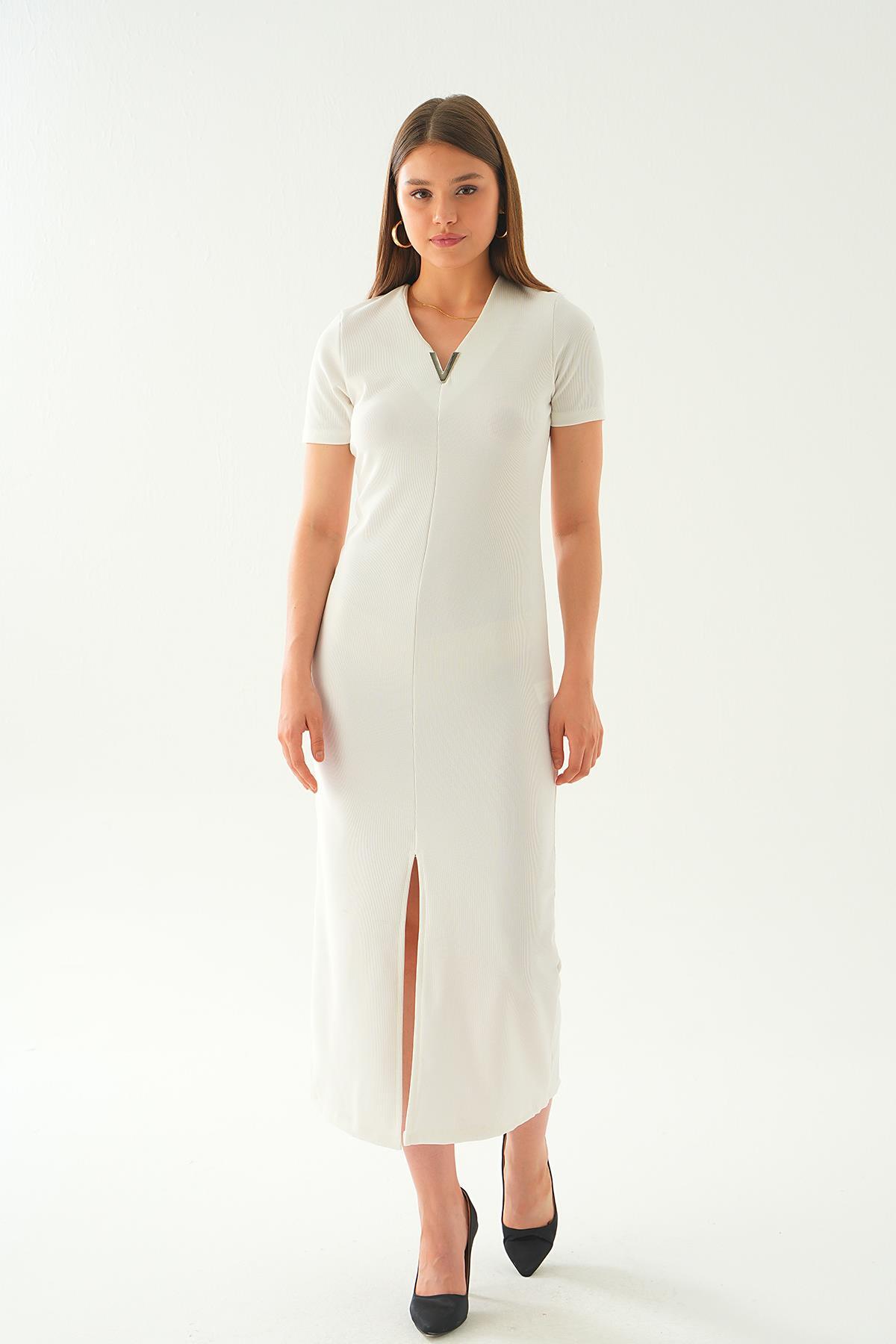 21561 V Yaka Aksesuarlı Elbise Beyaz