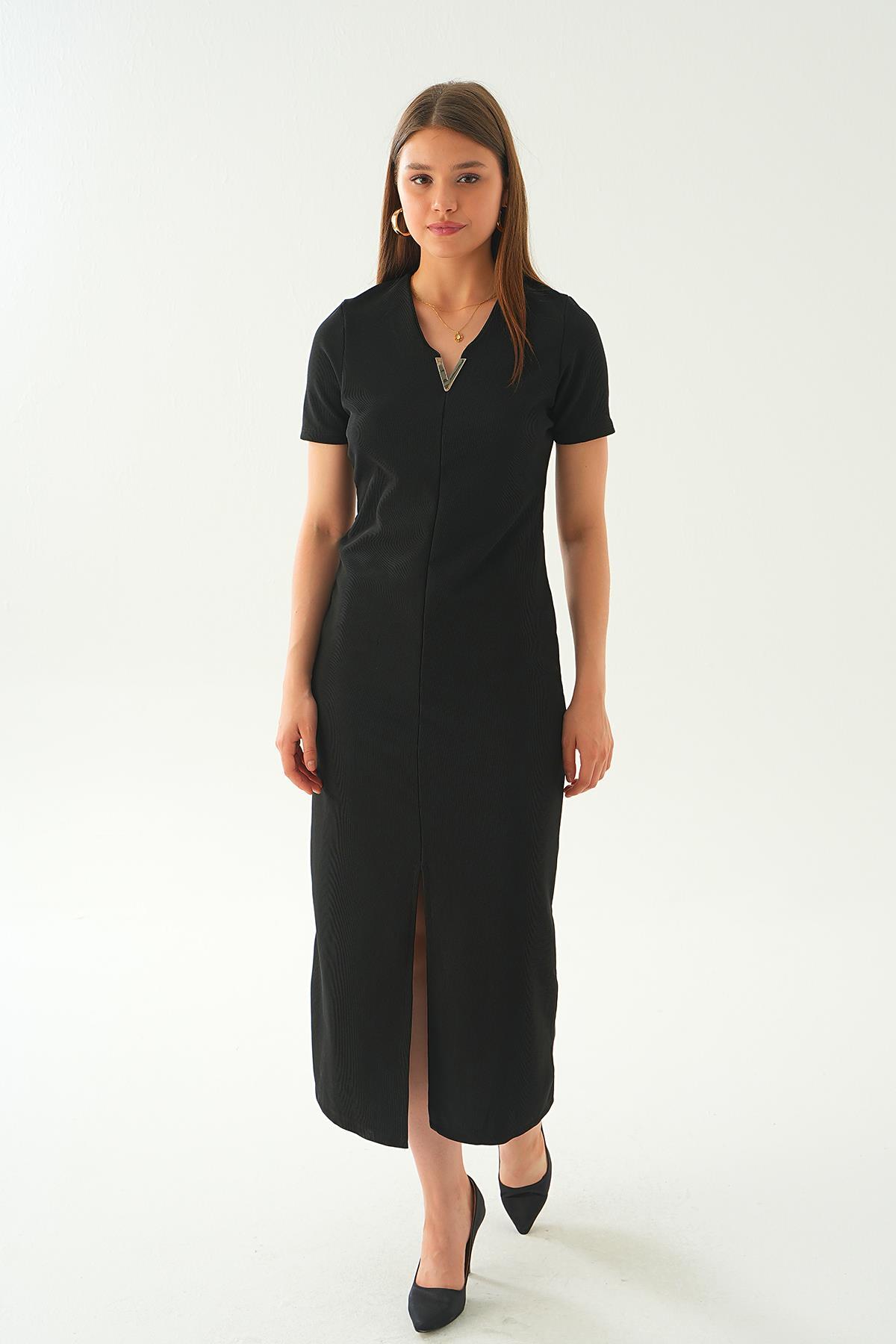 Siyah V Yaka Aksesuarlı Elbise 21561