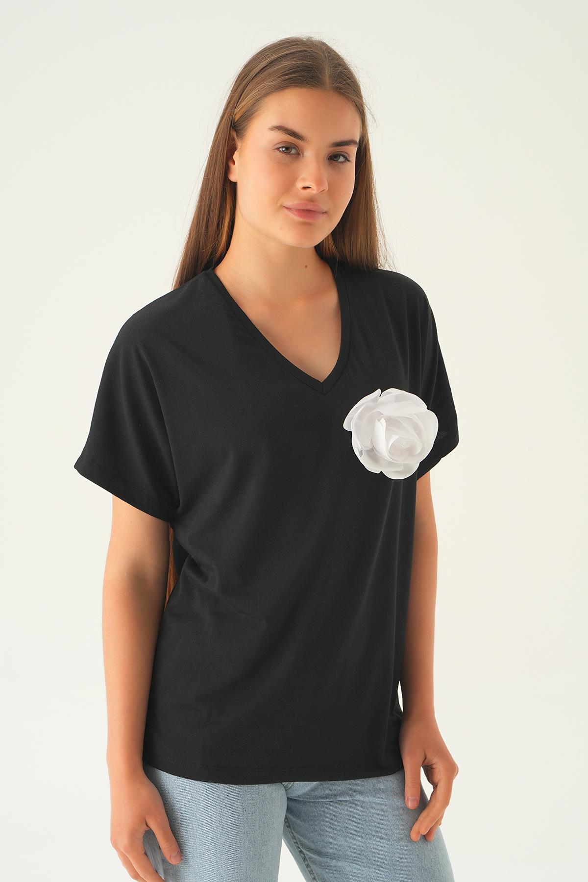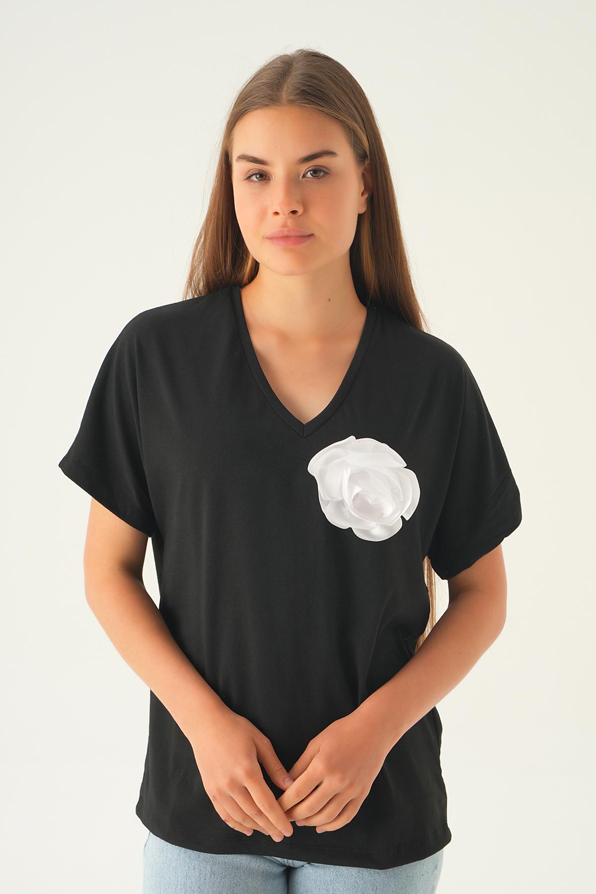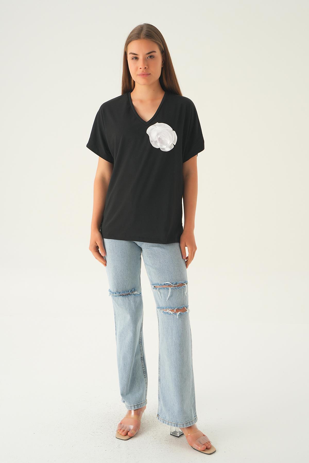Siyah Çiçek Detaylı Tişört 21568