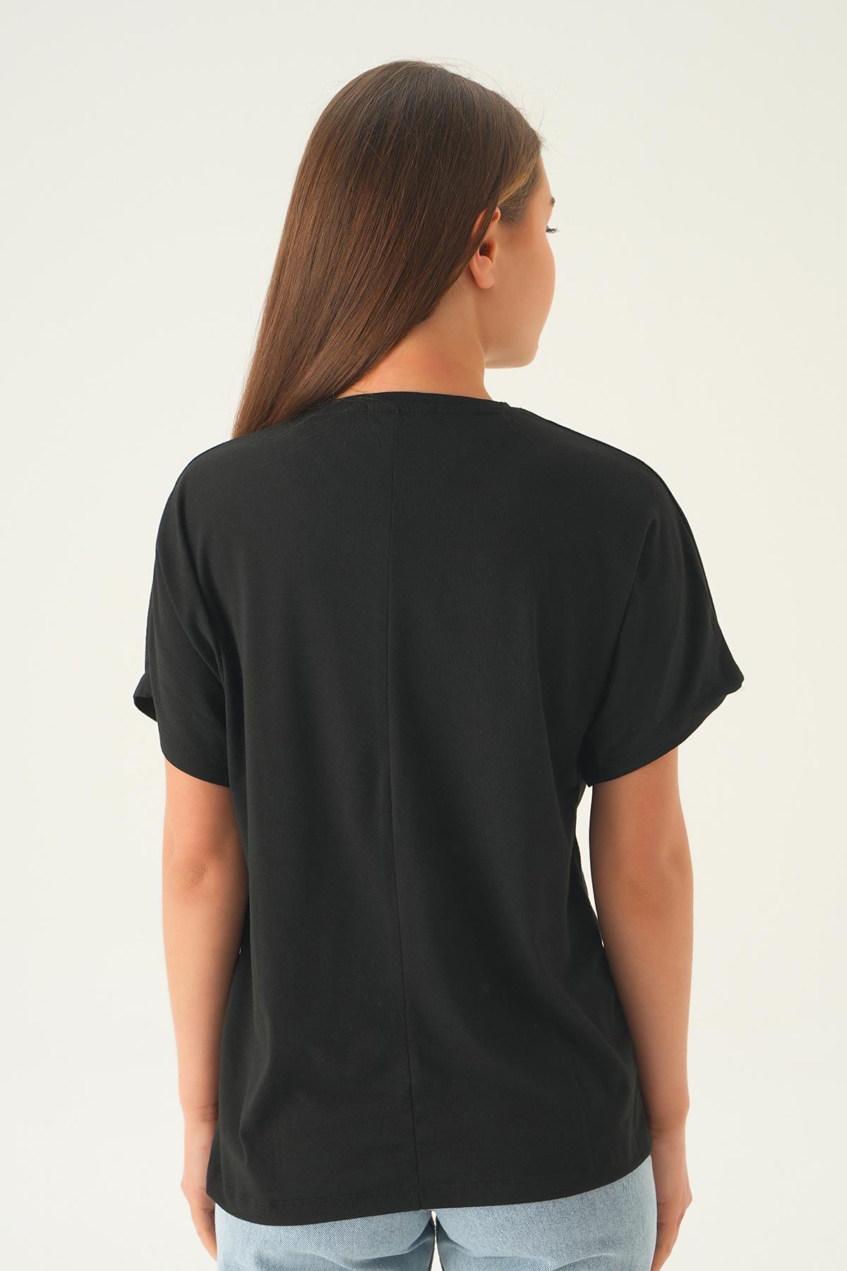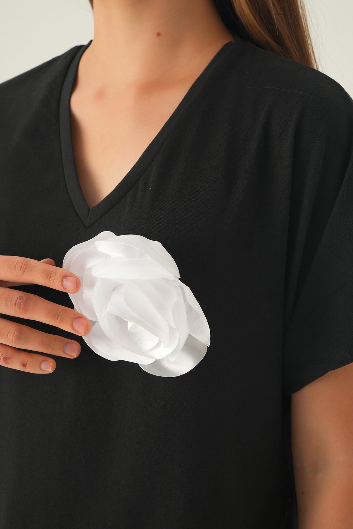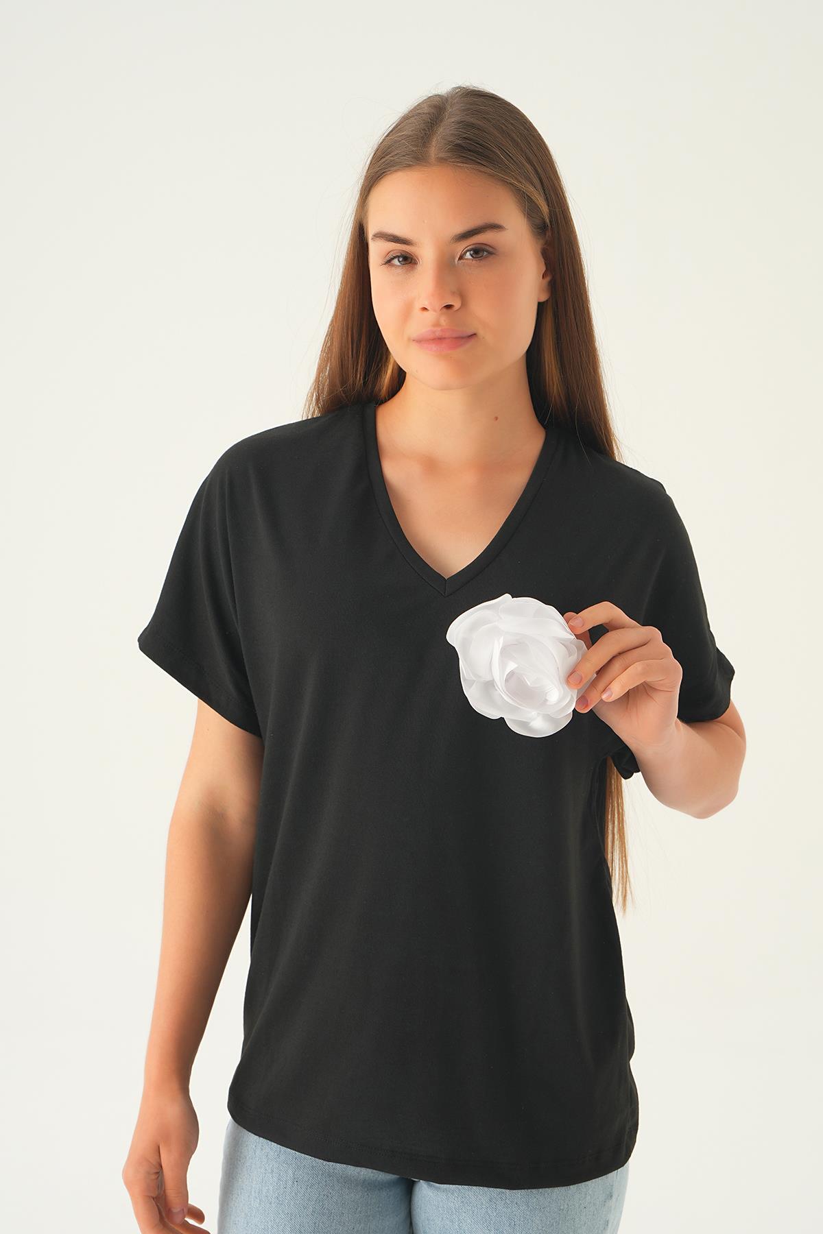 Siyah Çiçek Detaylı Tişört 21568