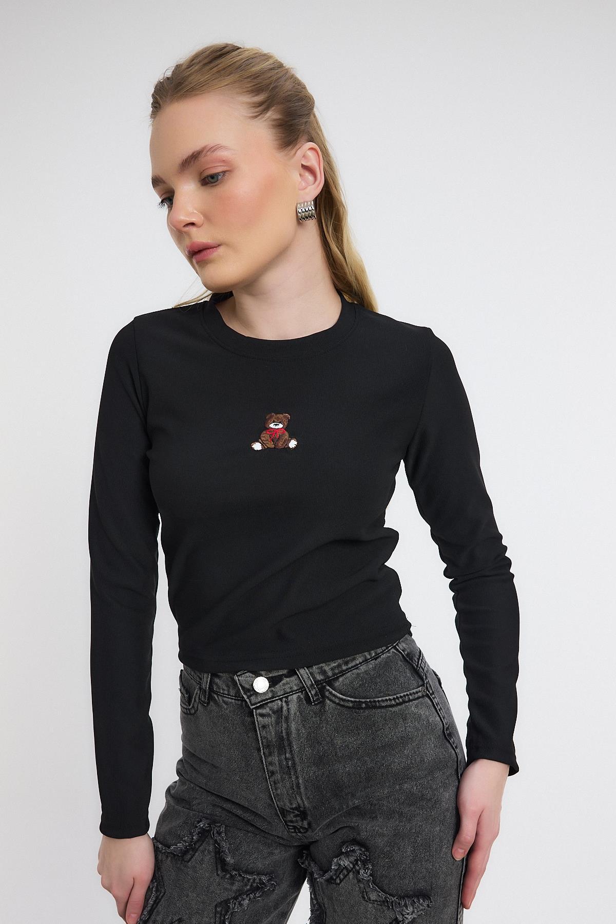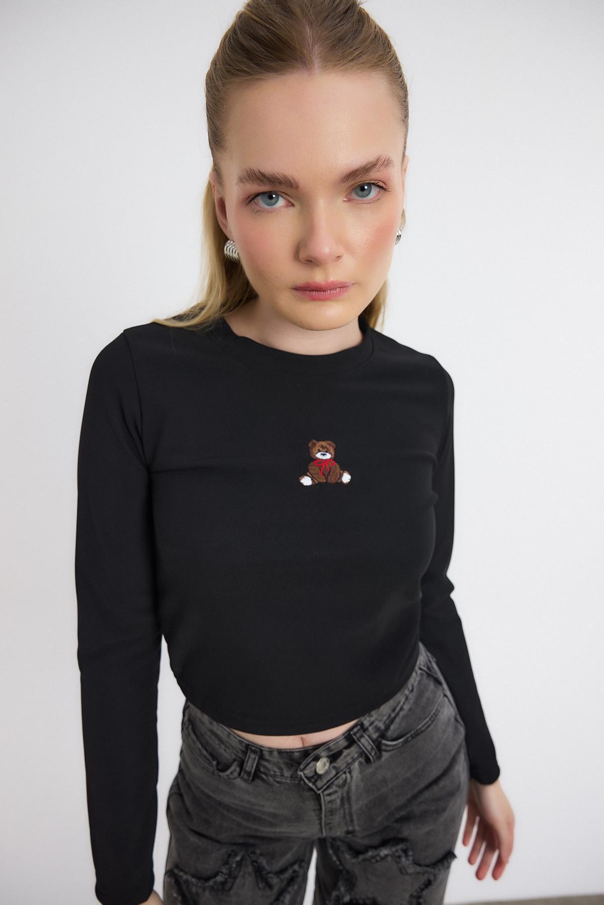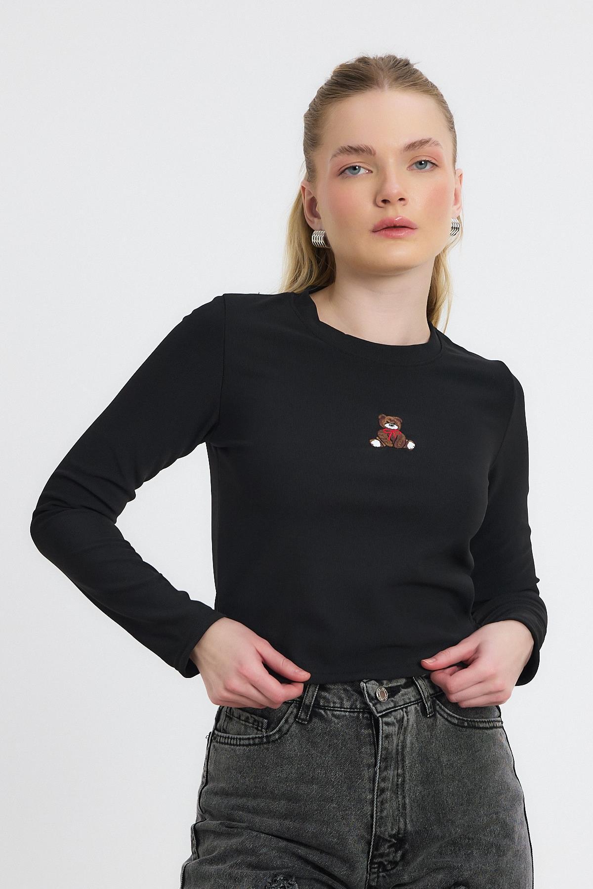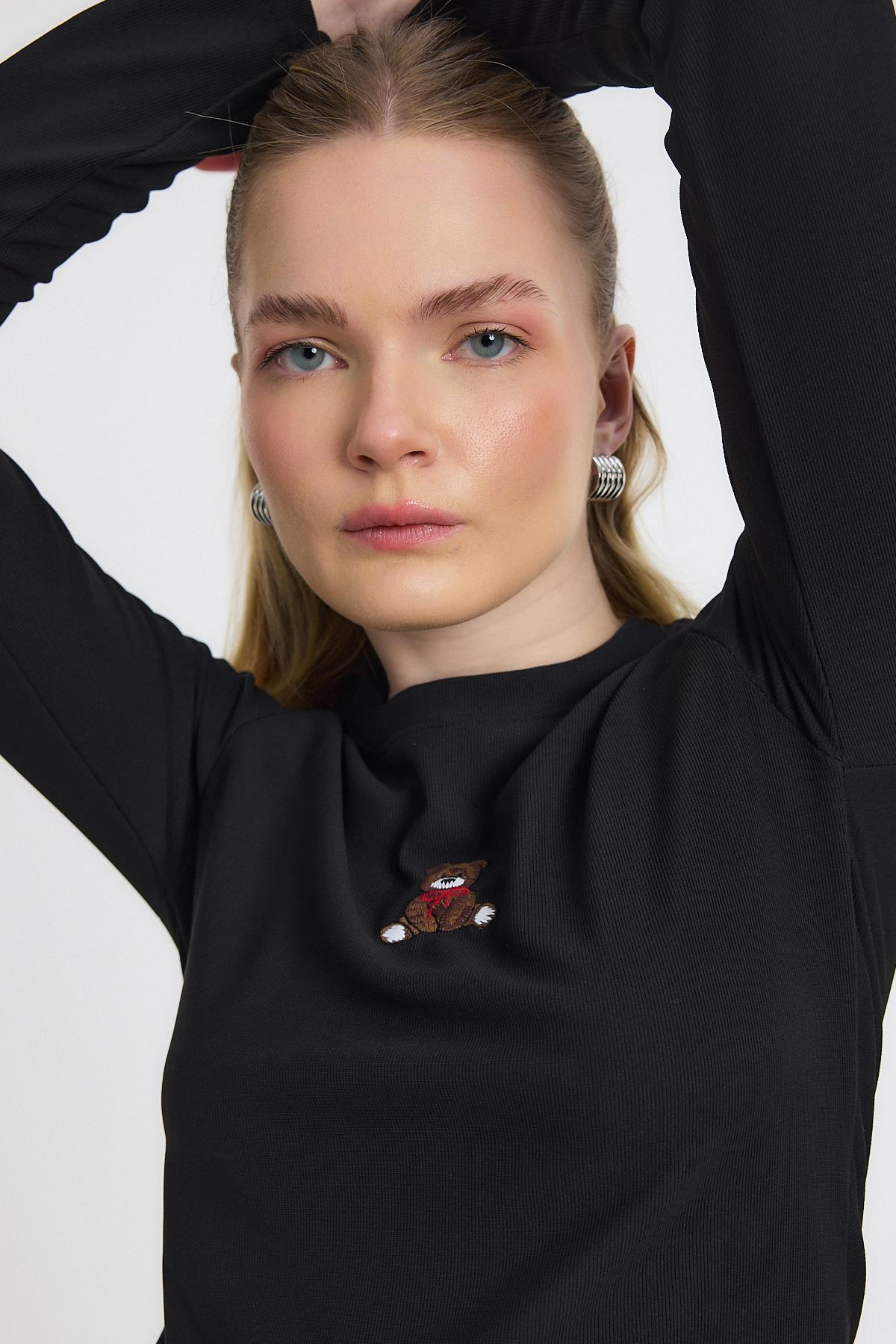 Siyah Ayıcık Nakışlı Bisiklet Yaka Bluz 2200
