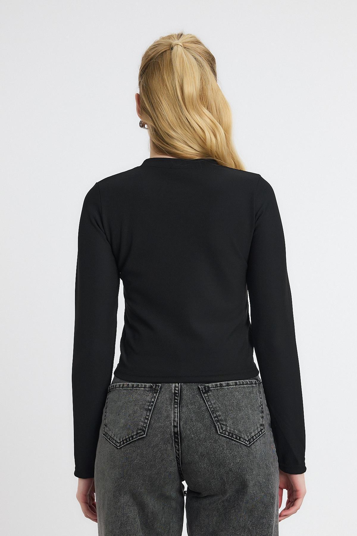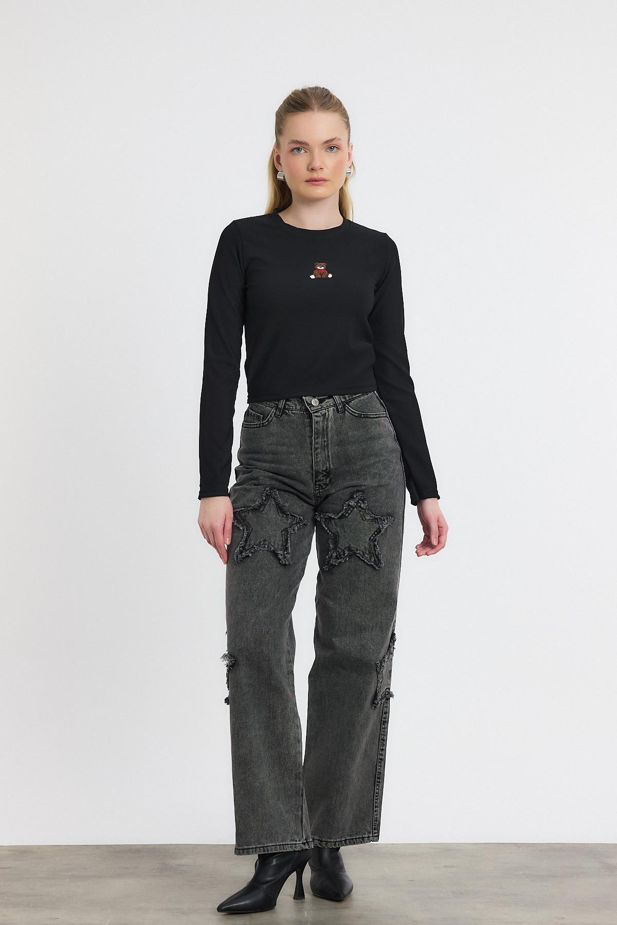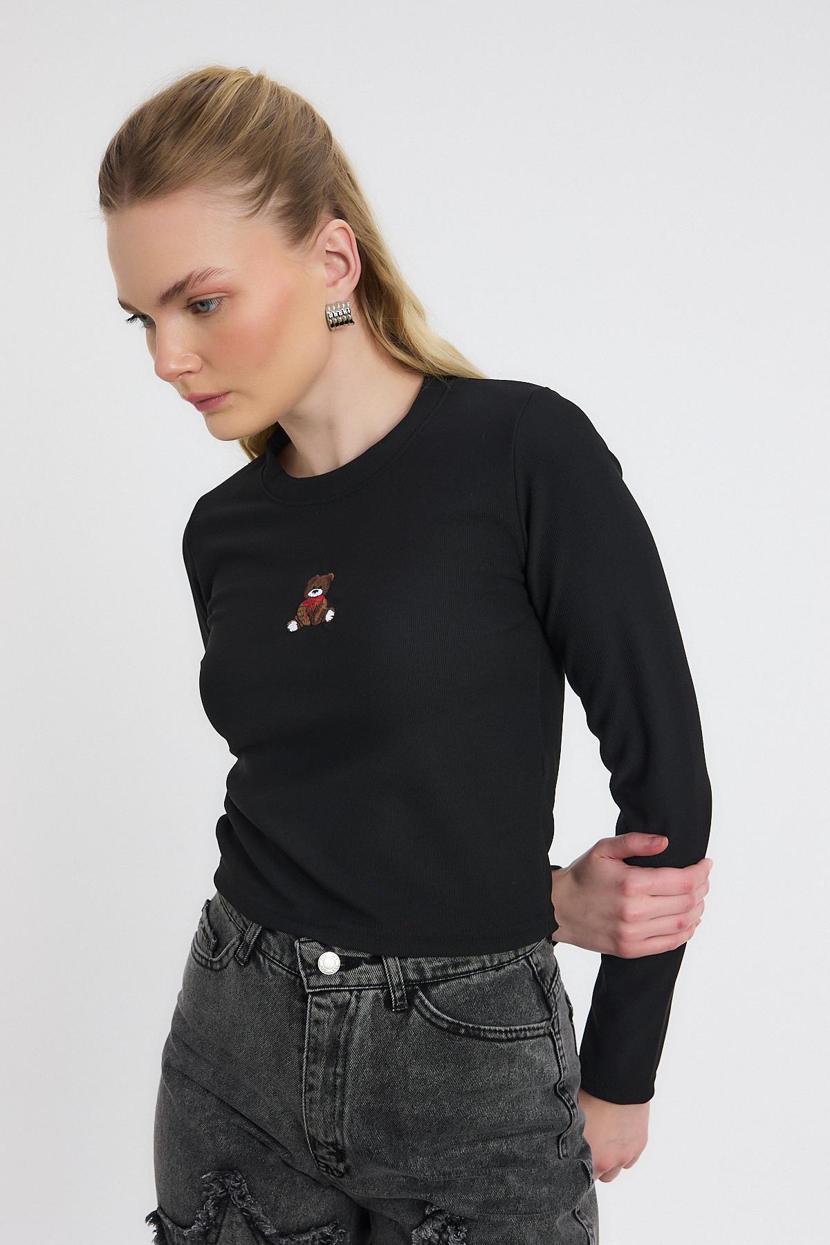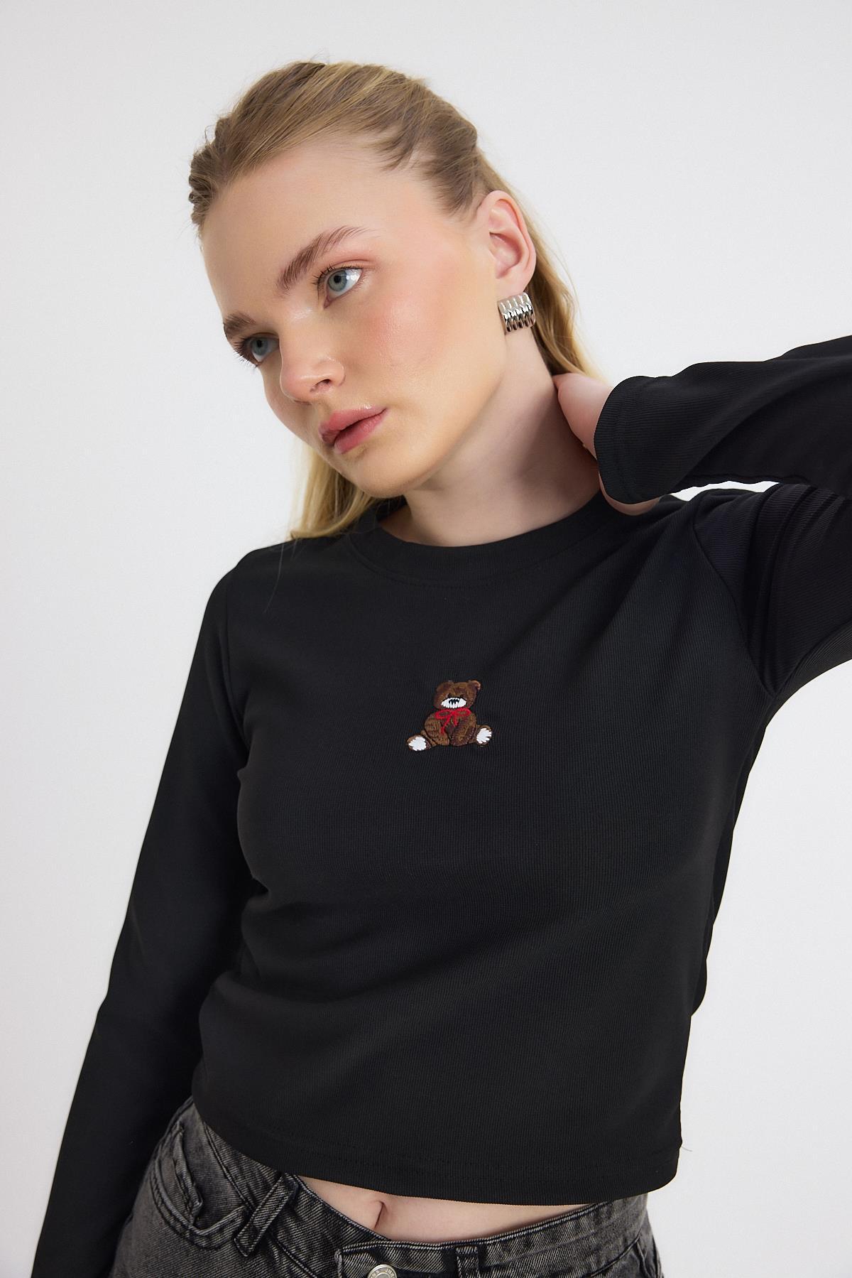 Siyah Ayıcık Nakışlı Bisiklet Yaka Bluz 2200