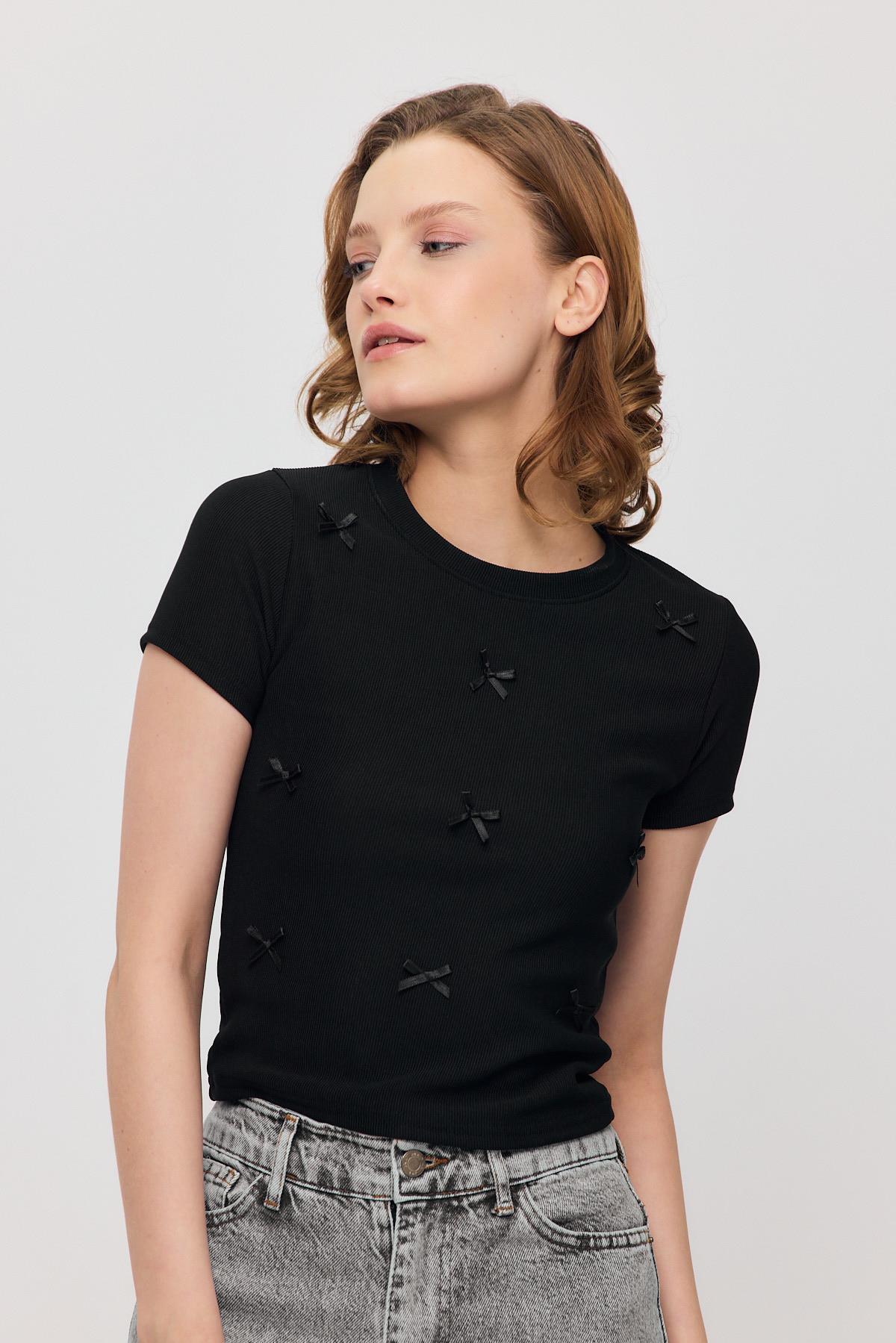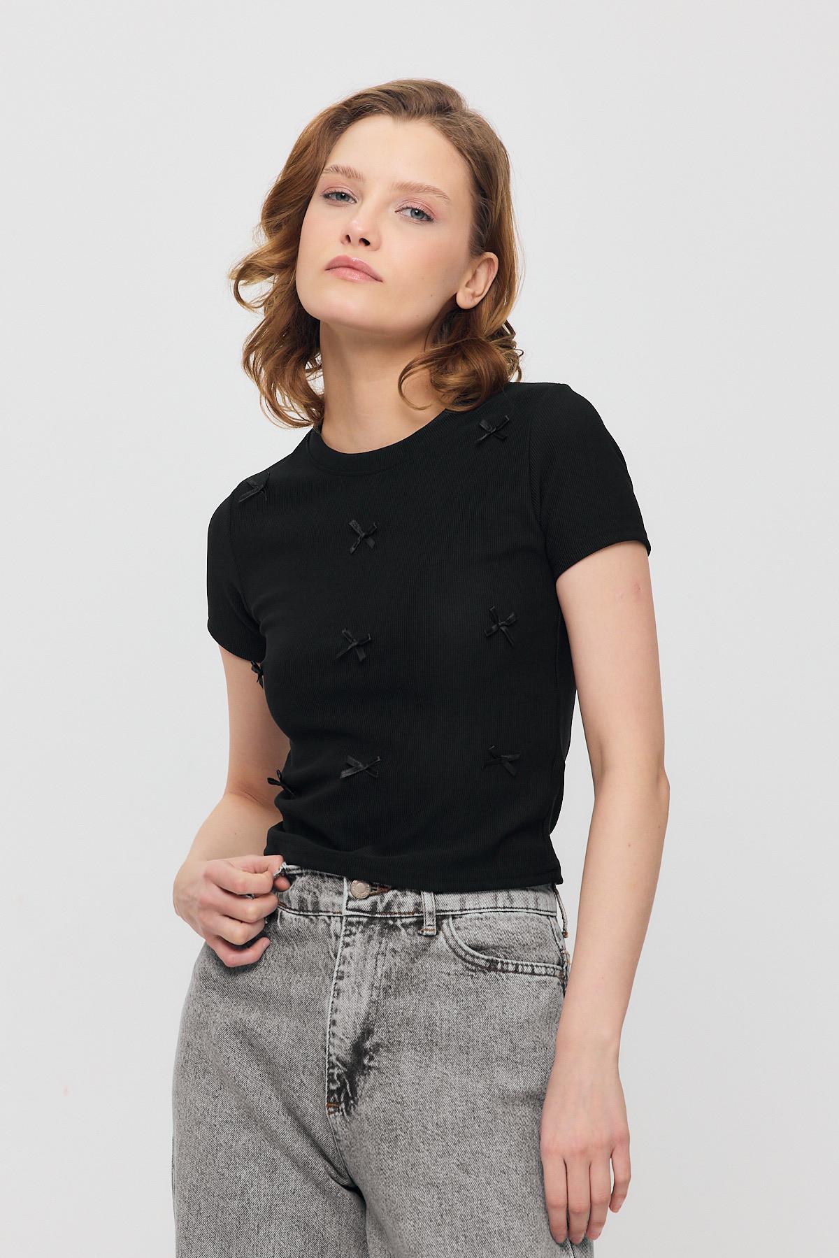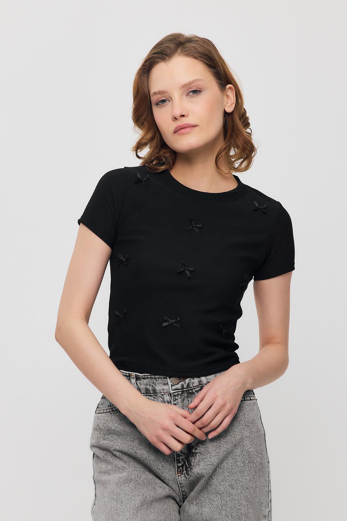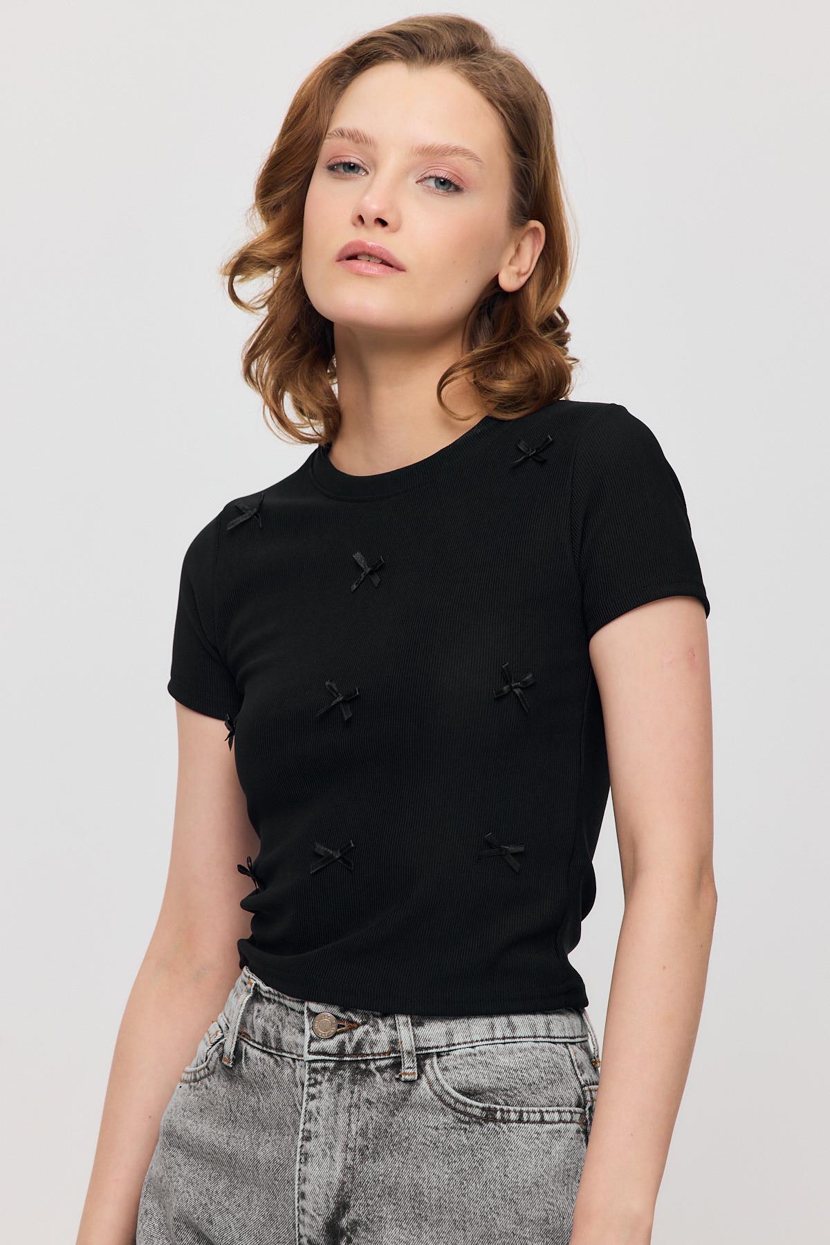 Siyah Kurdele Detay Kısa Kol Tişört 2202