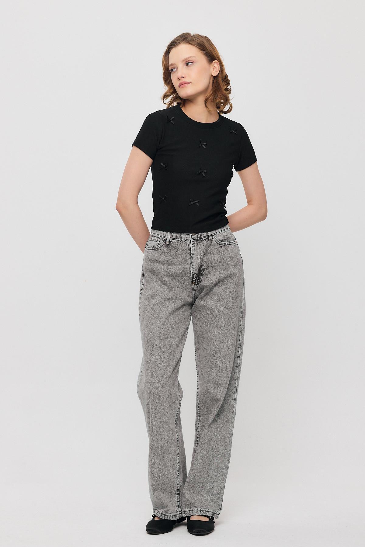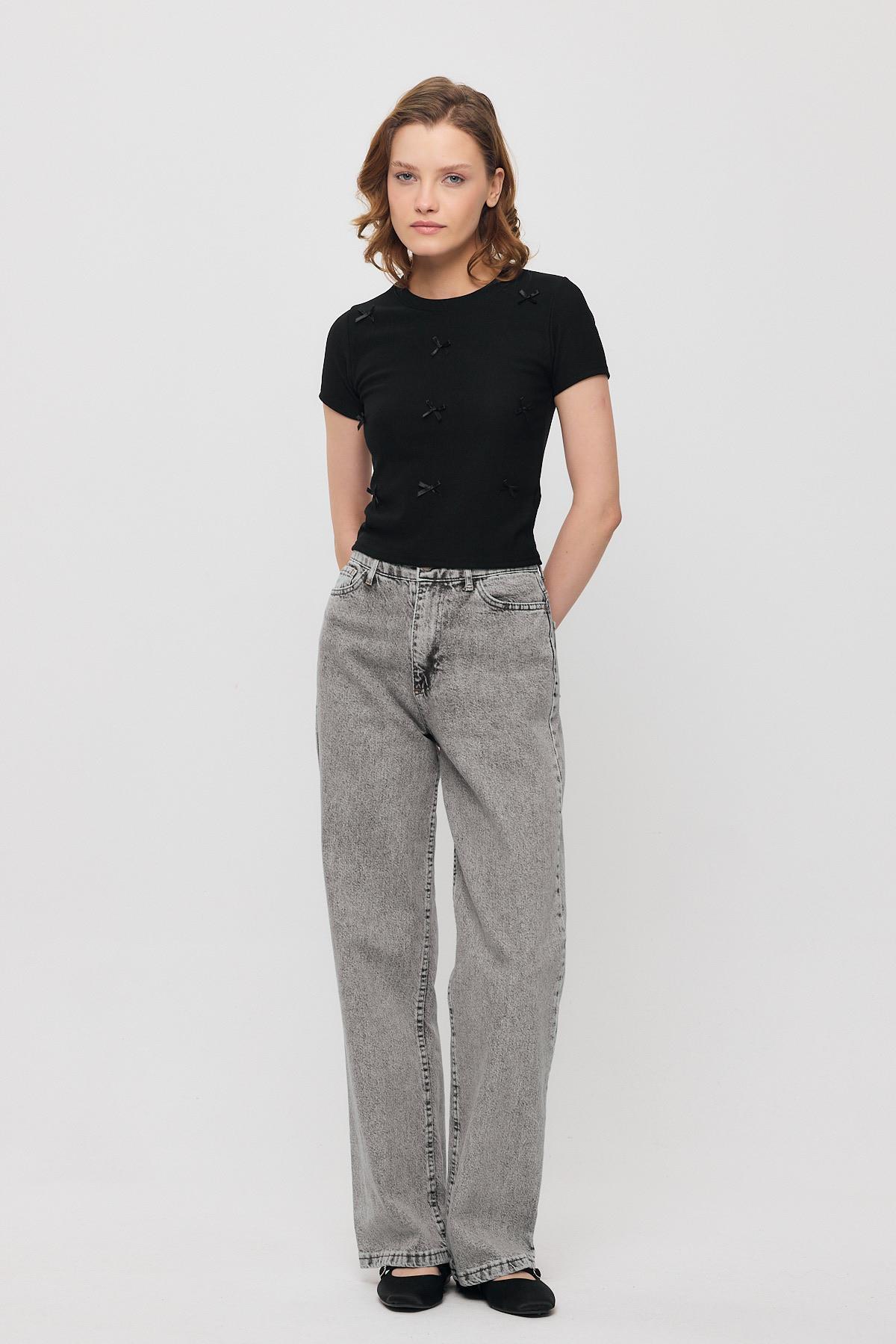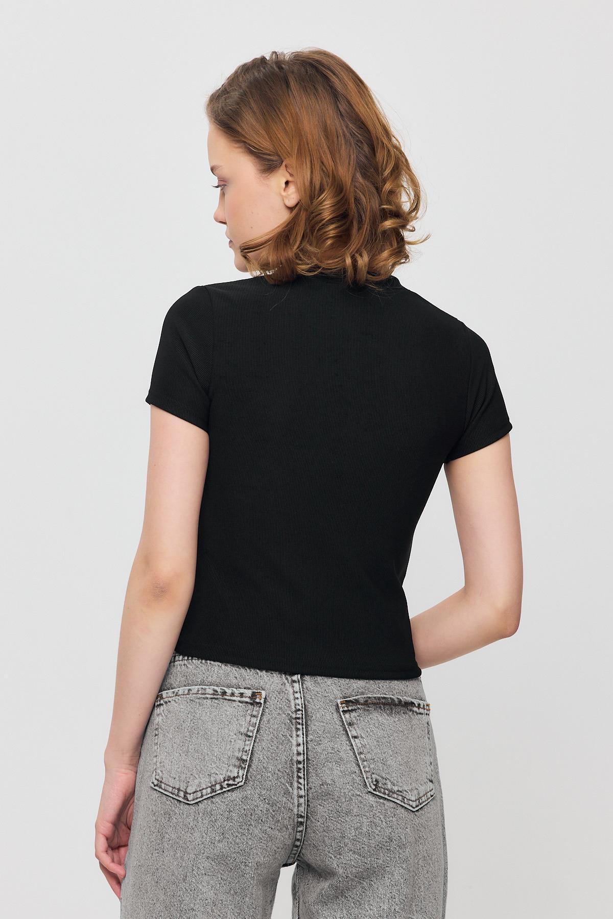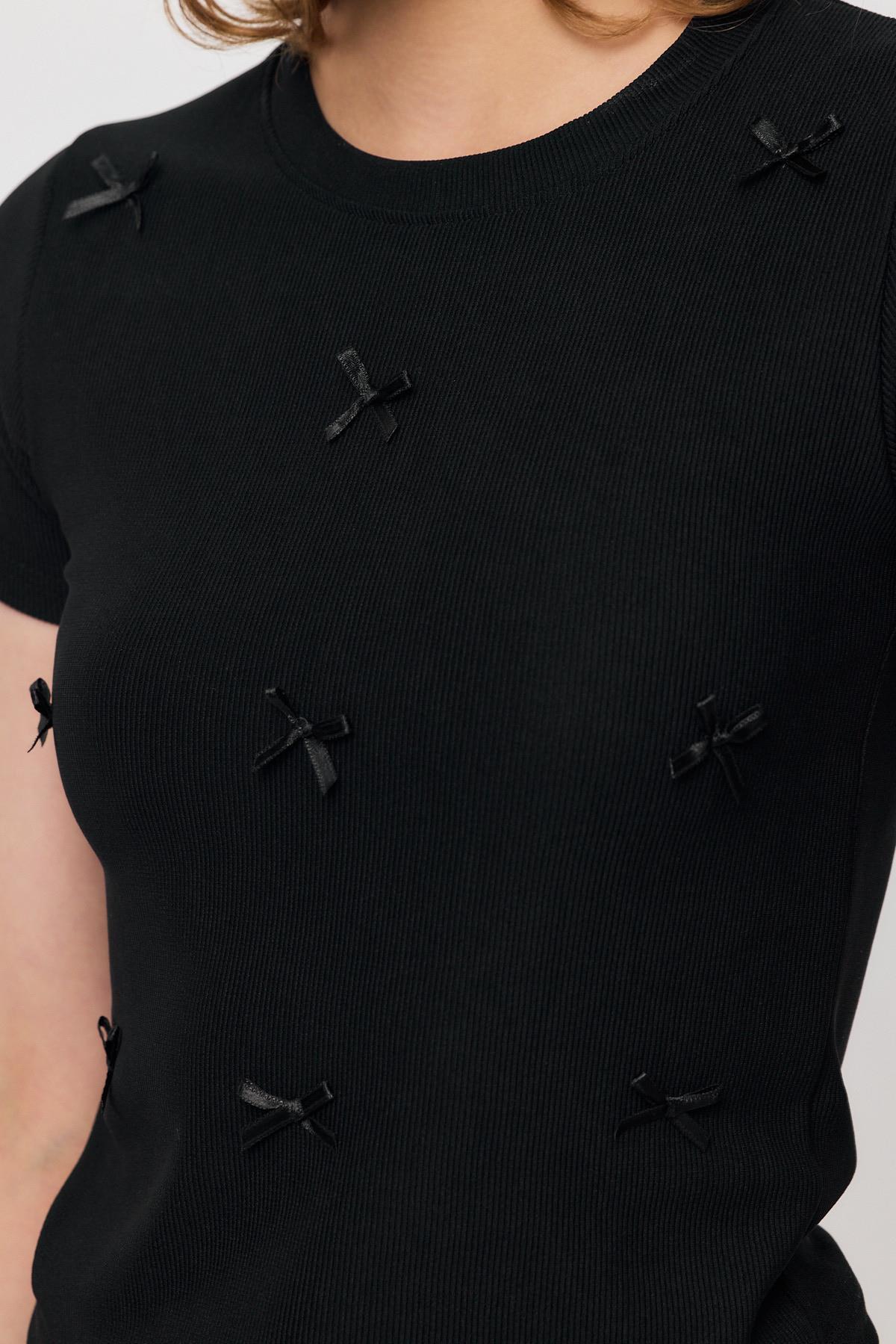 Siyah Kurdele Detay Kısa Kol Tişört 2202