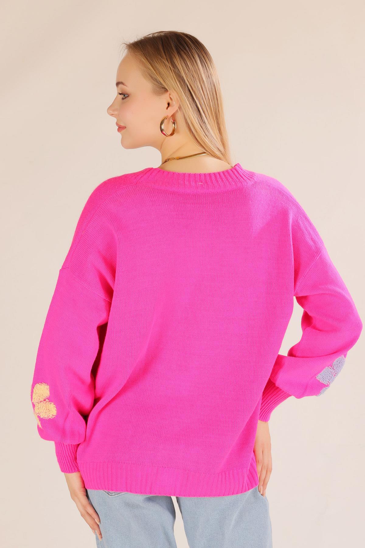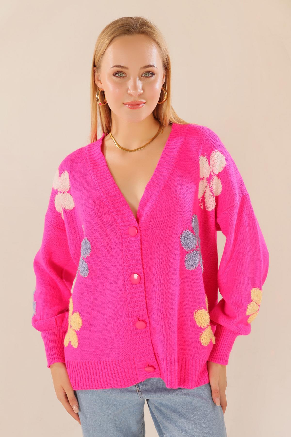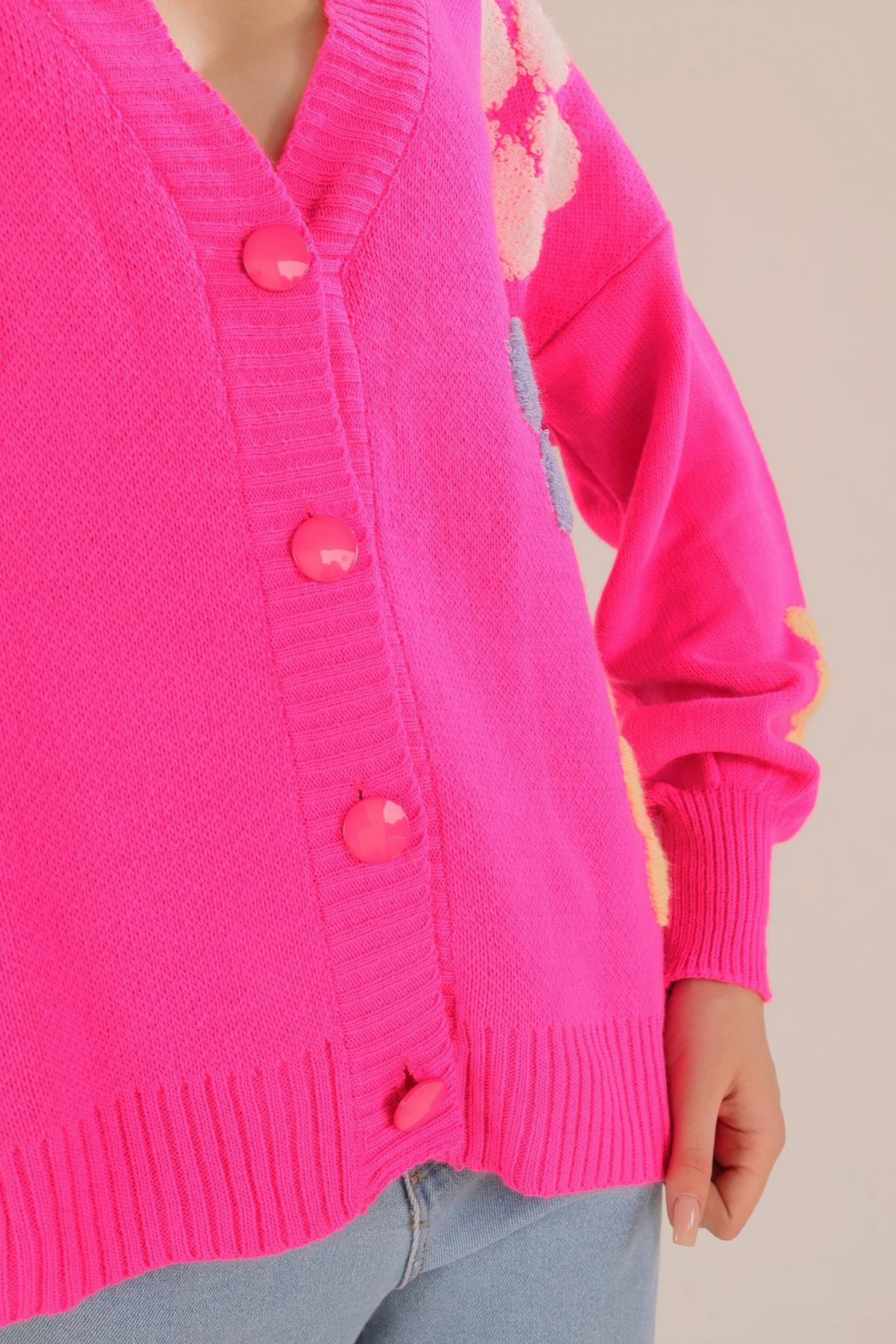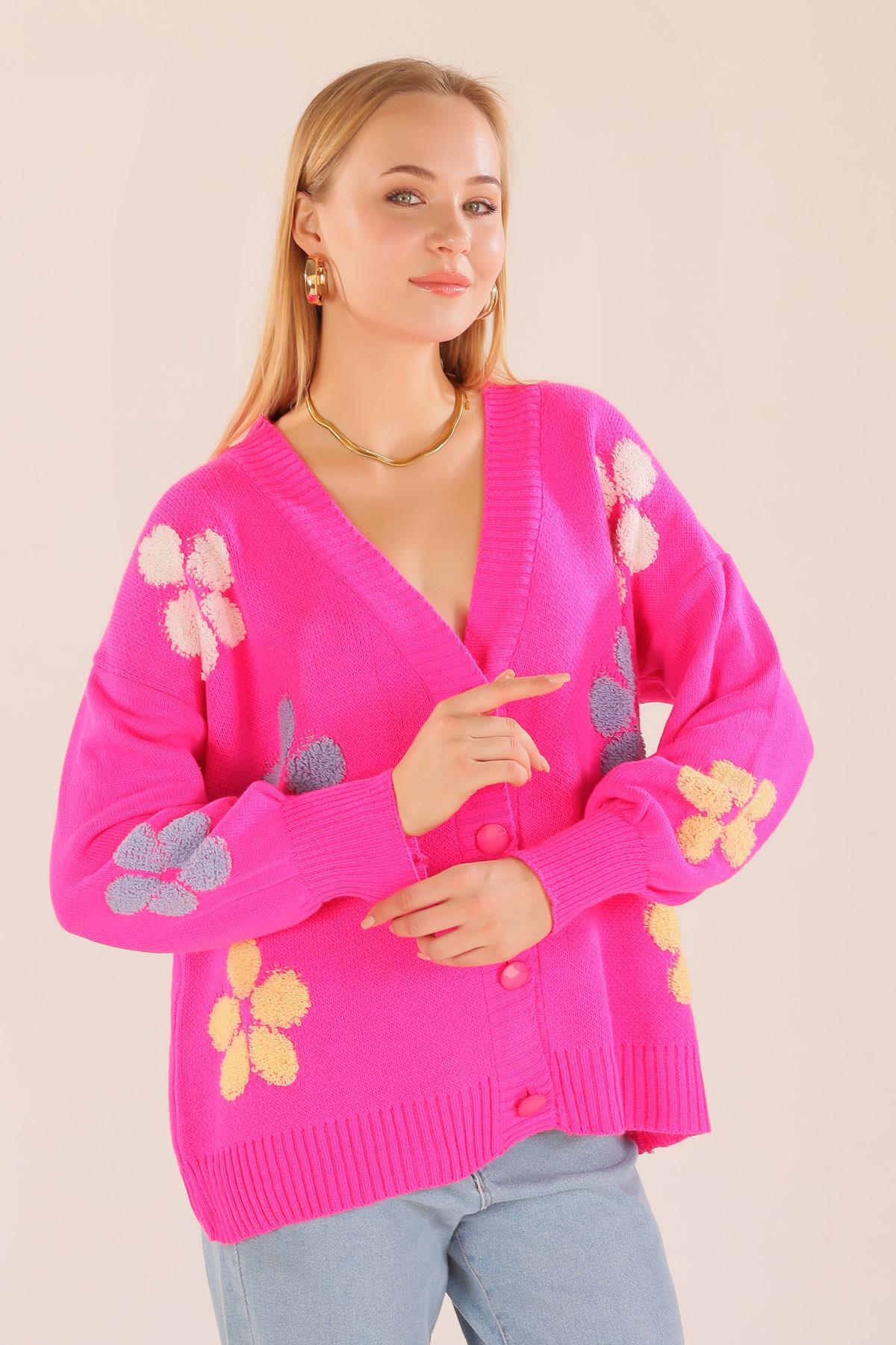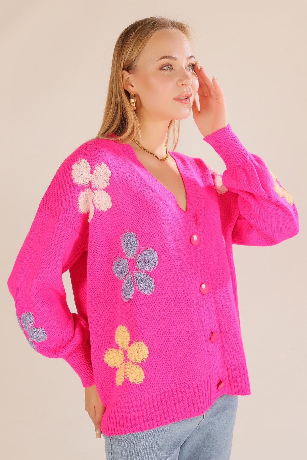 Fuşya Çiçek Nakışlı Balon Kol Hırka 2208