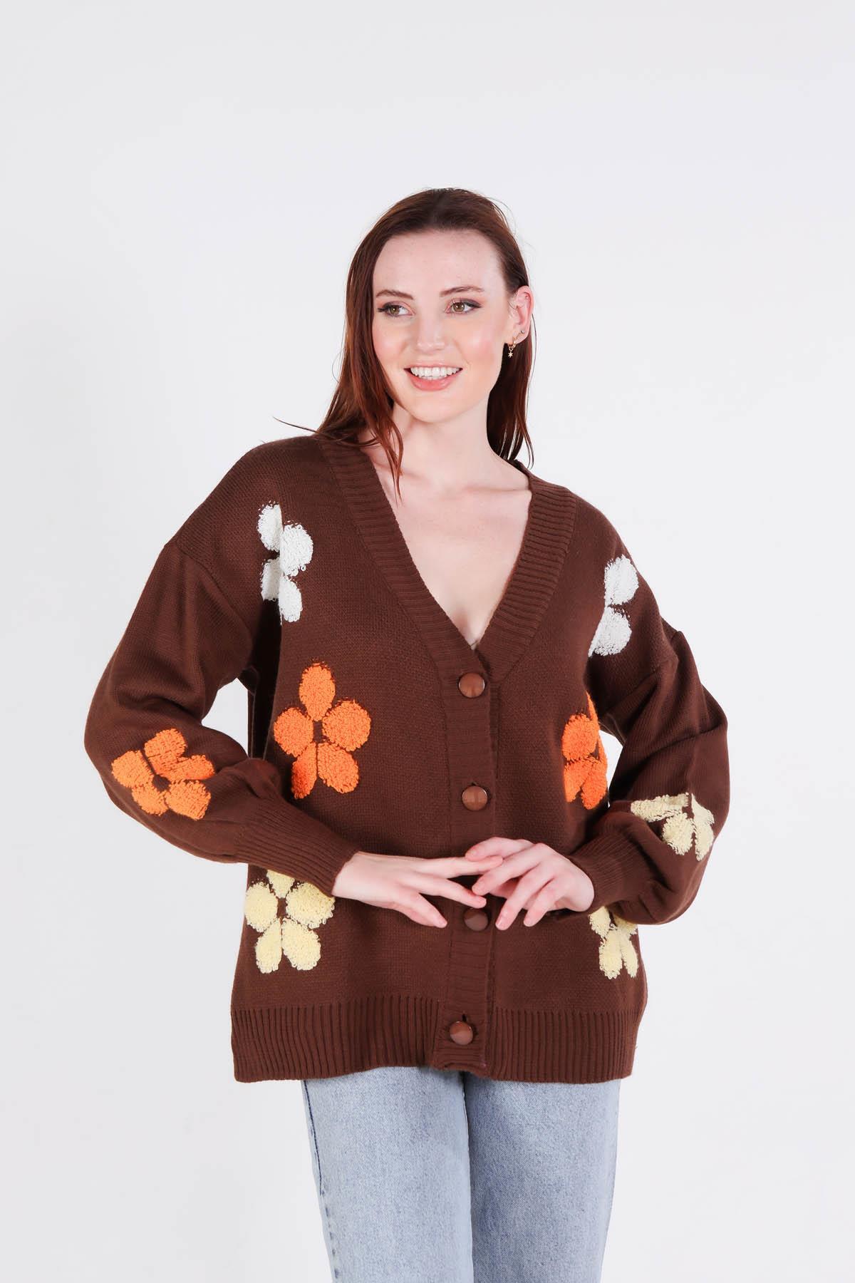 2208 Çiçek Nakışlı Balon Kol Hırka Kahve