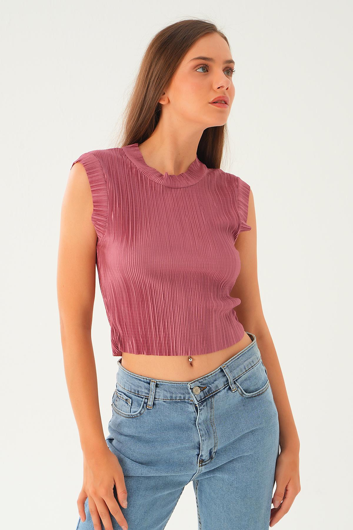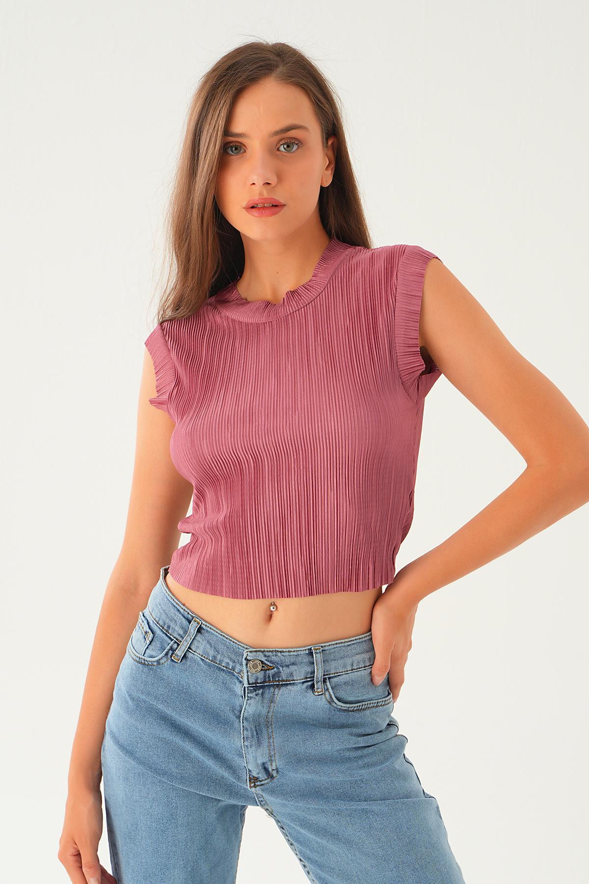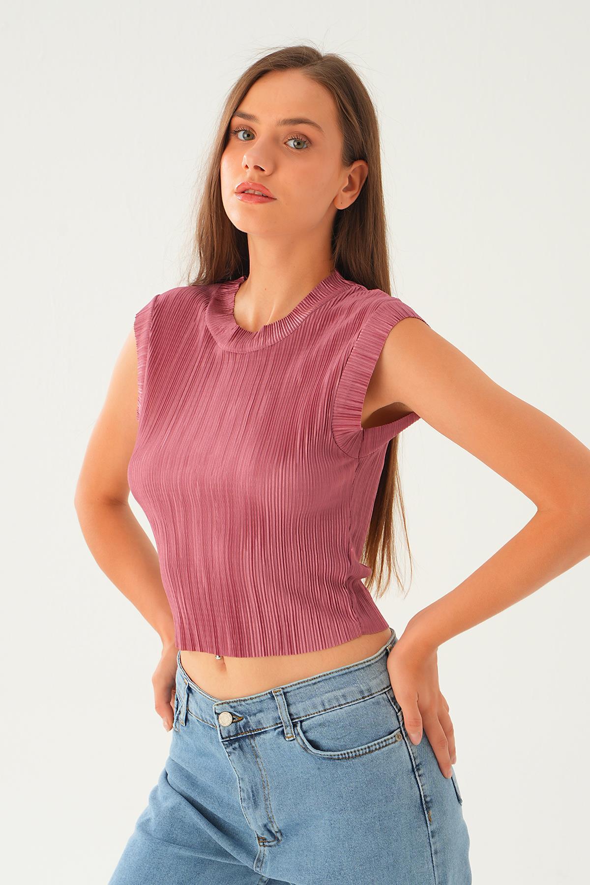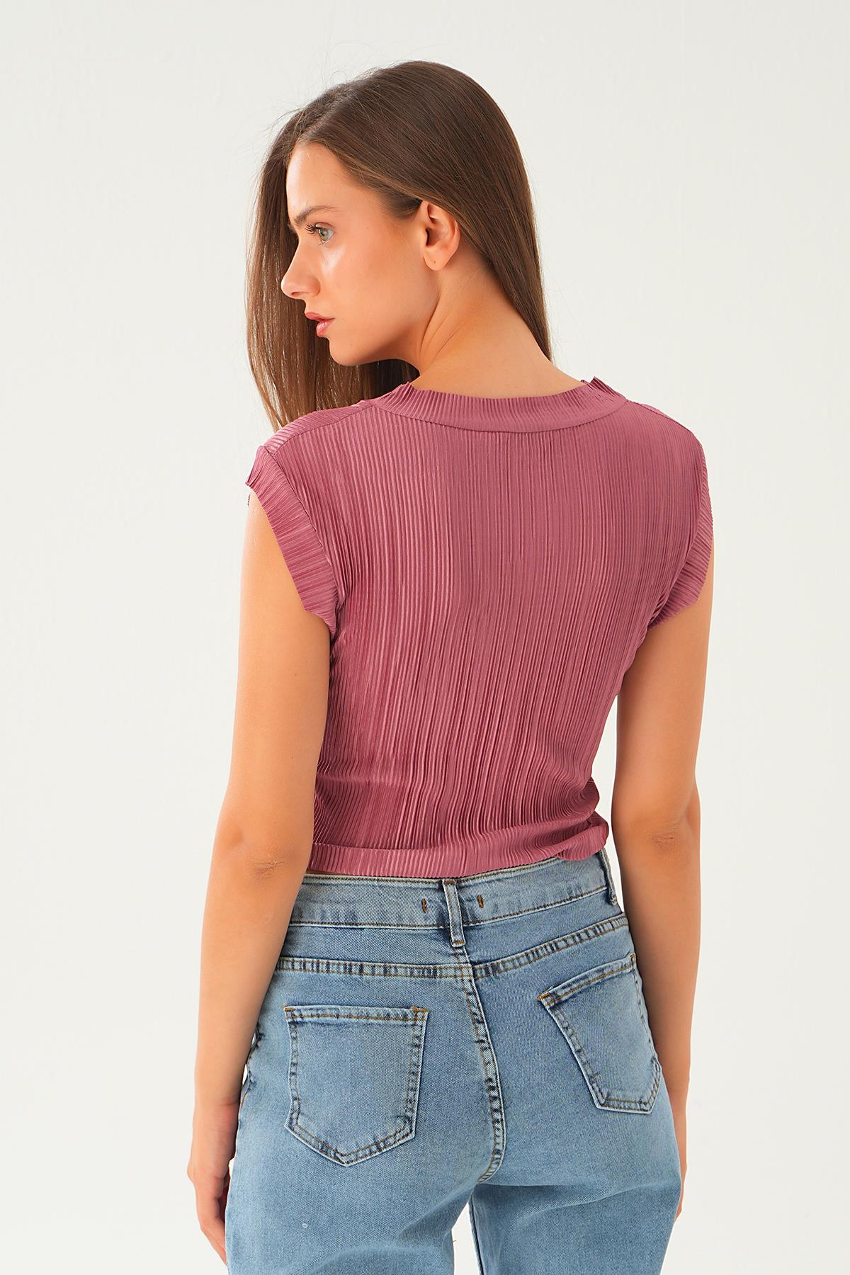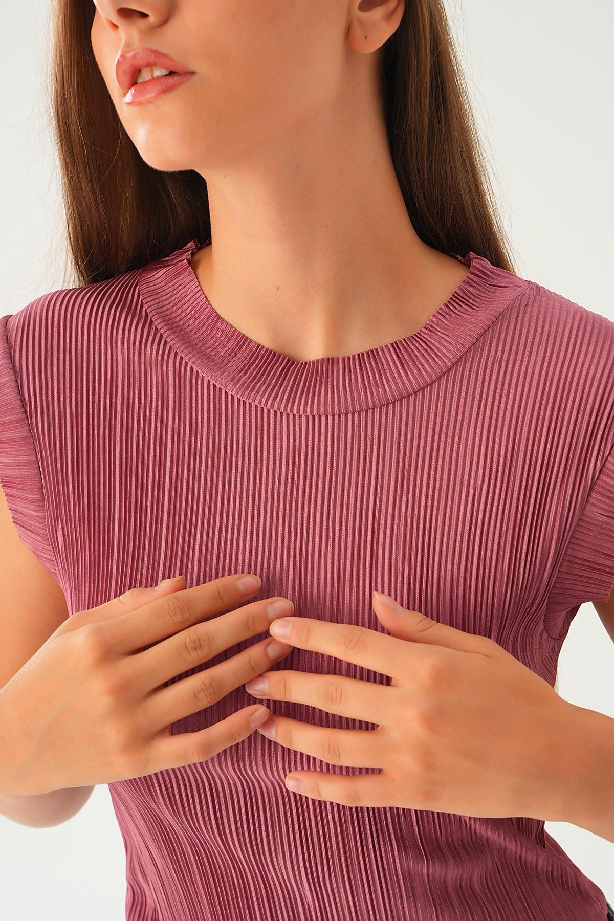 Gül Sıfır Kol Pliseli Tişört 221