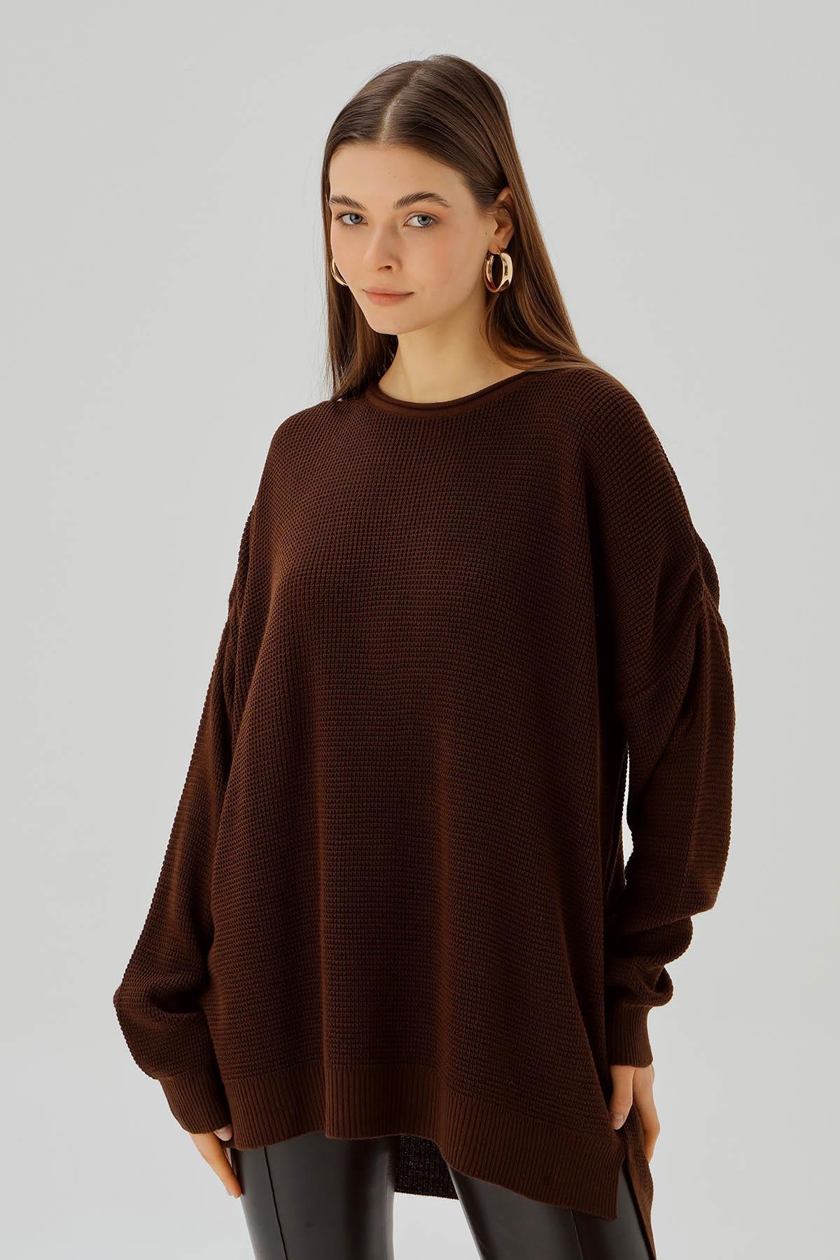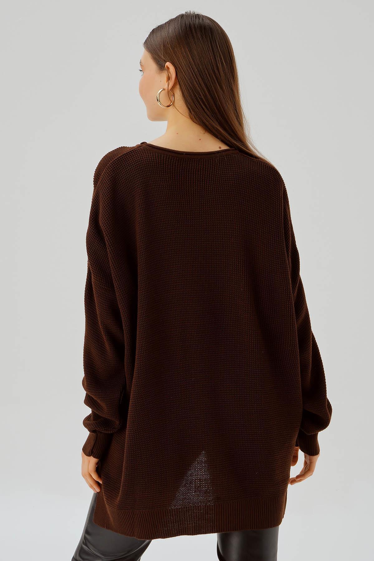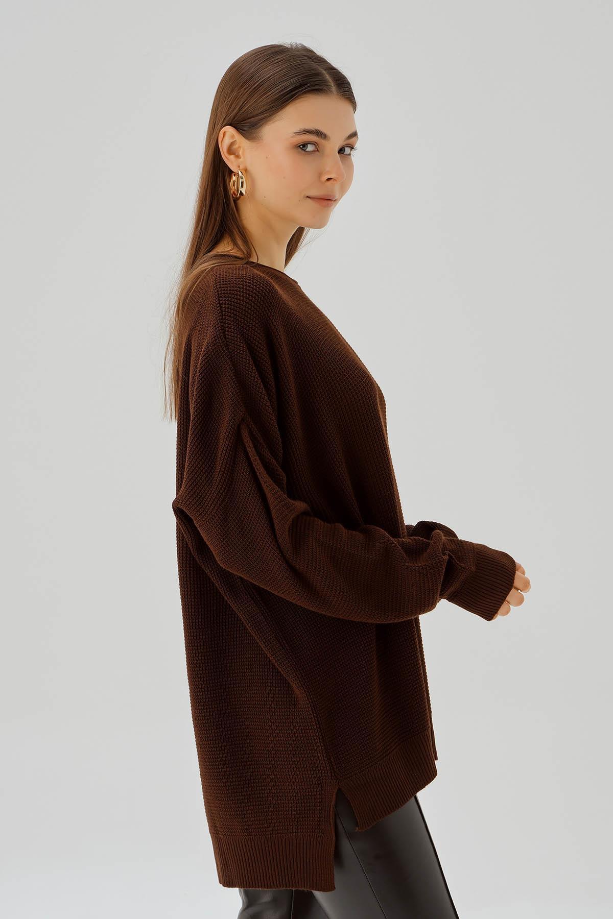 Kahve Bisiklet Yaka Yırtmaçlı Kazak 2210