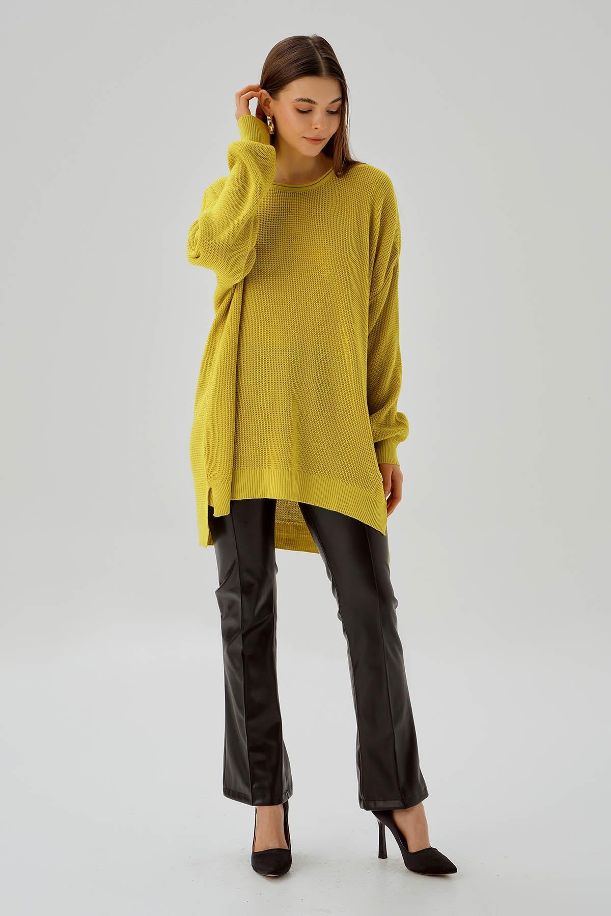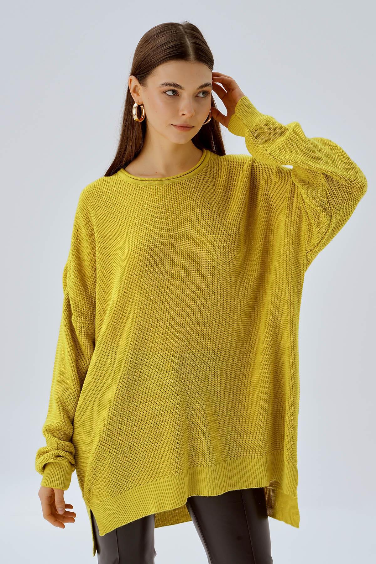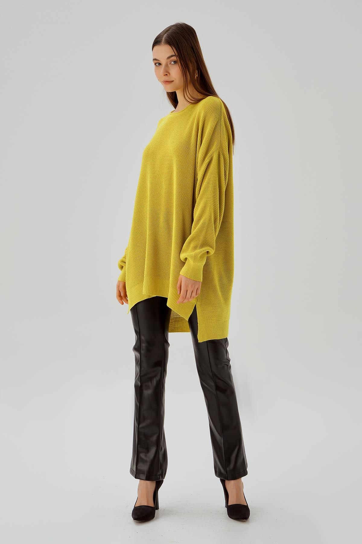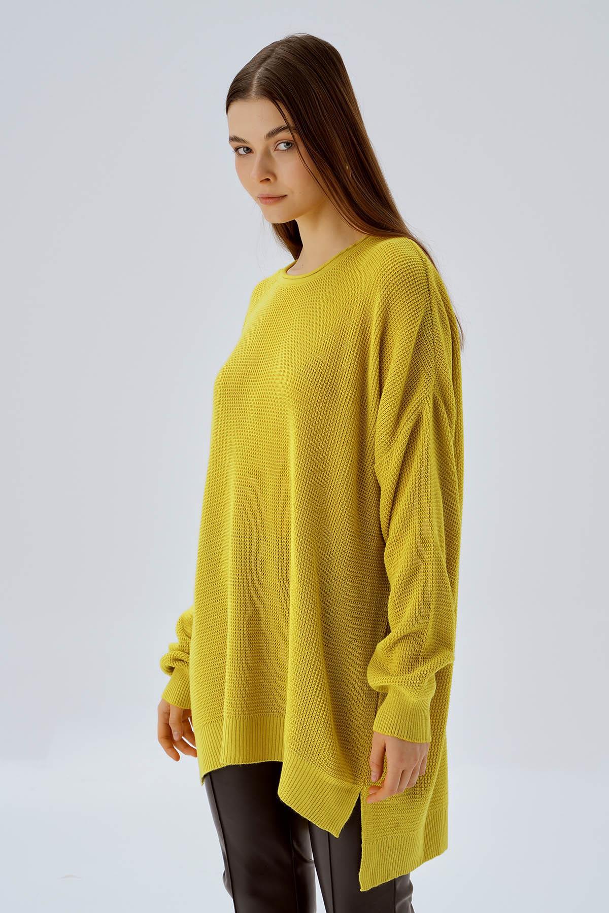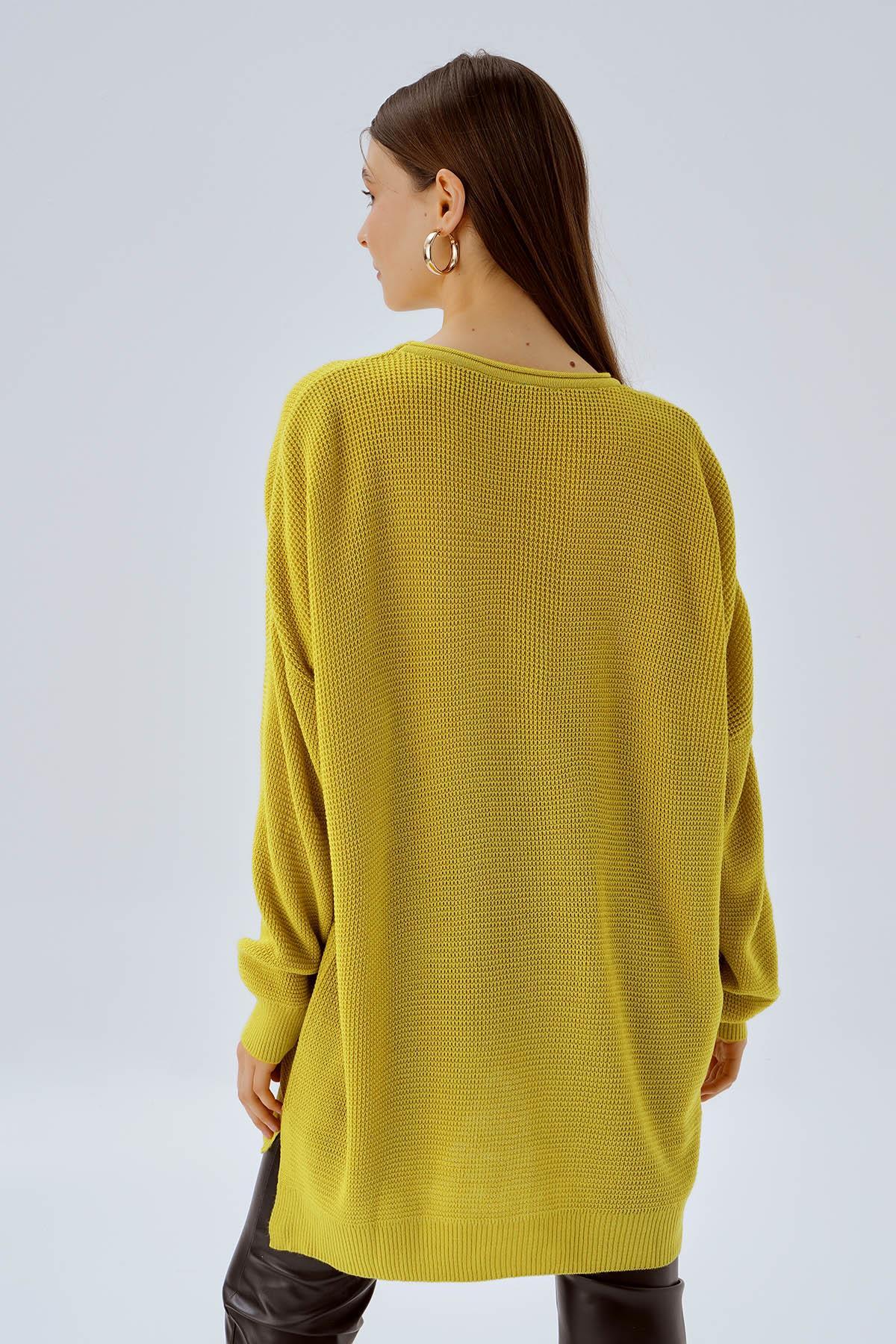 Yağ Yeşili Bisiklet Yaka Yırtmaçlı Kazak 2210