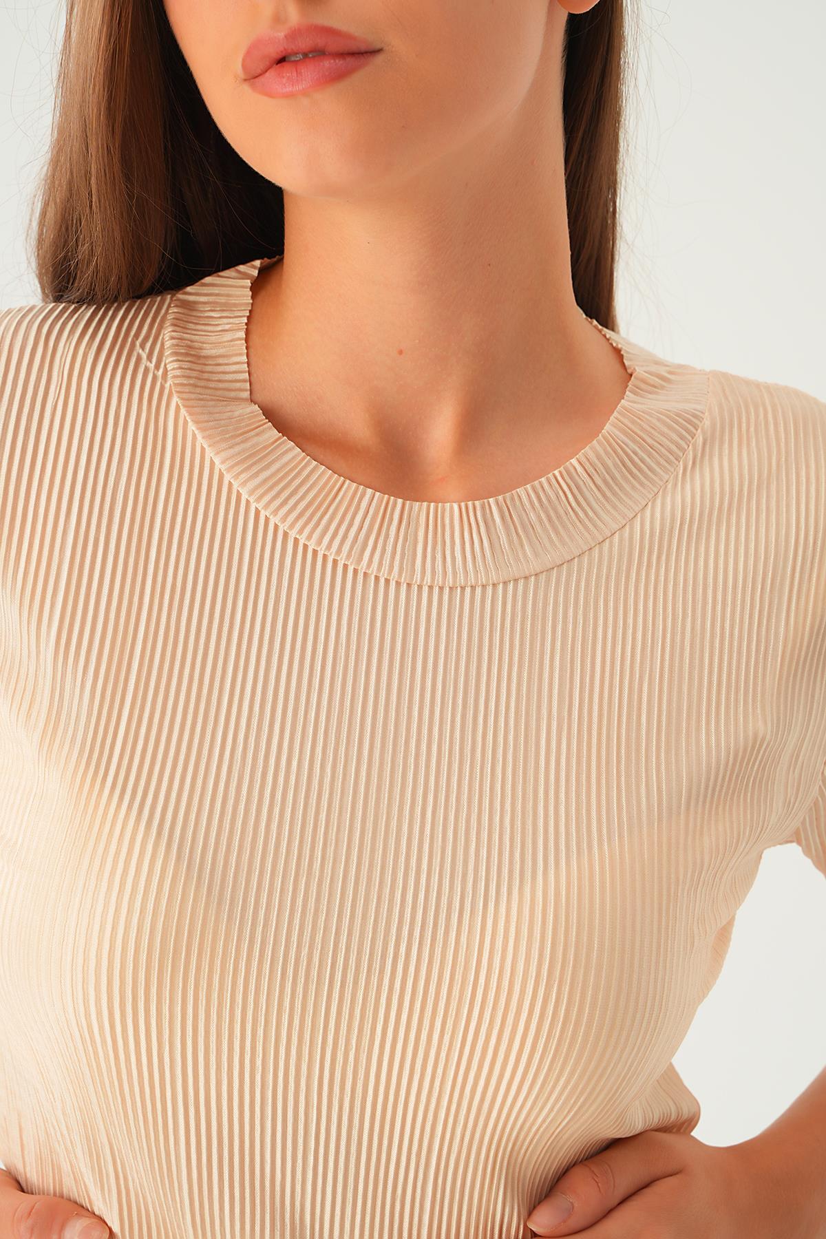 Krem Kısa Kol Pliseli Tişört 223