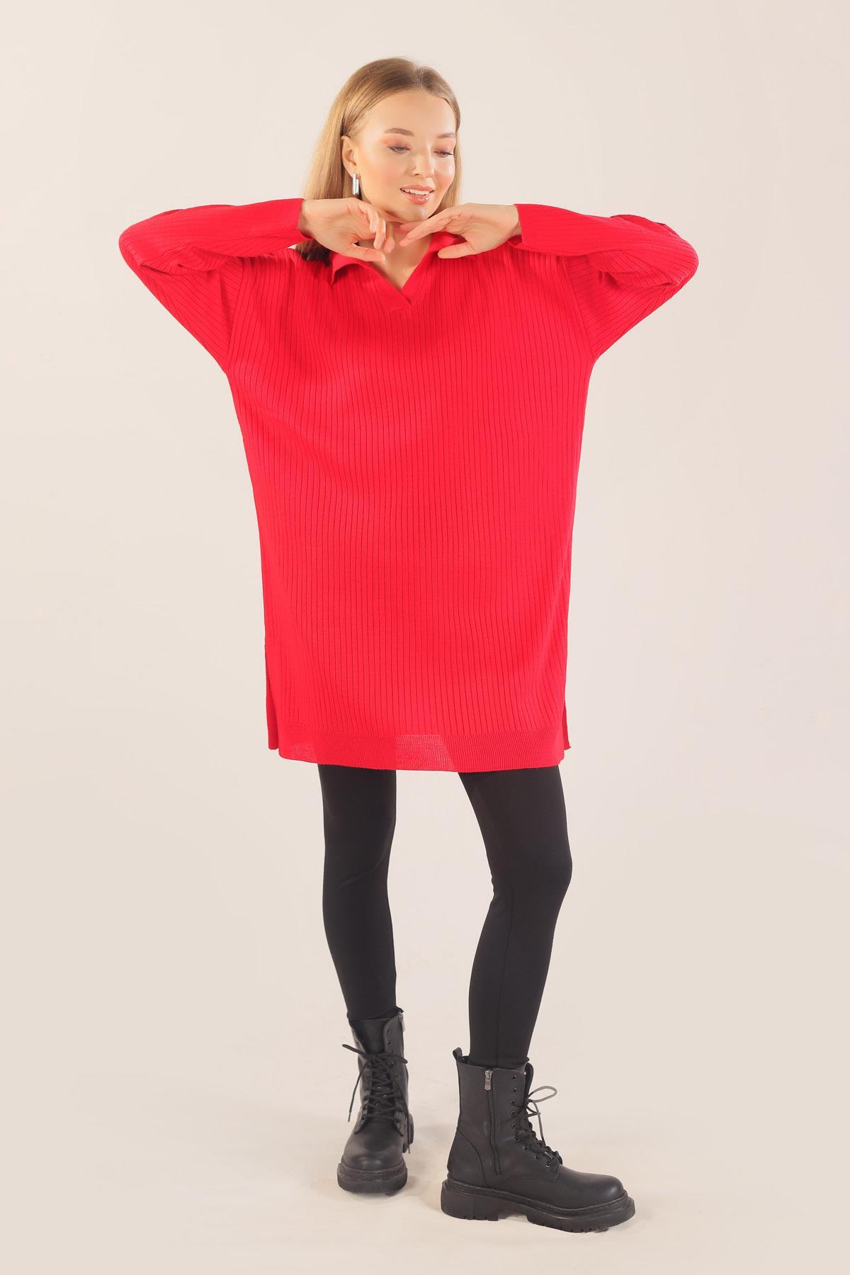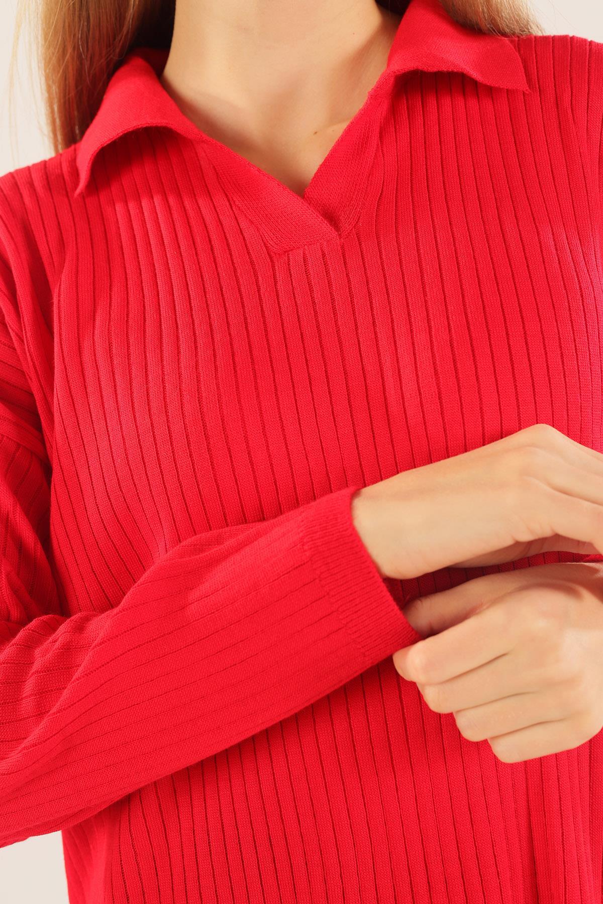 Kırmızı Polo Yaka Fitilli Kazak 23214