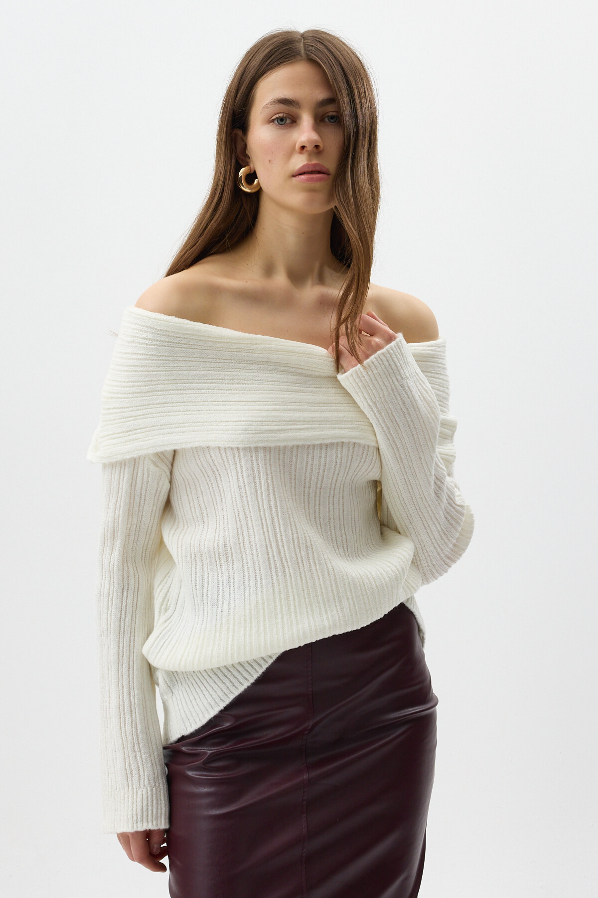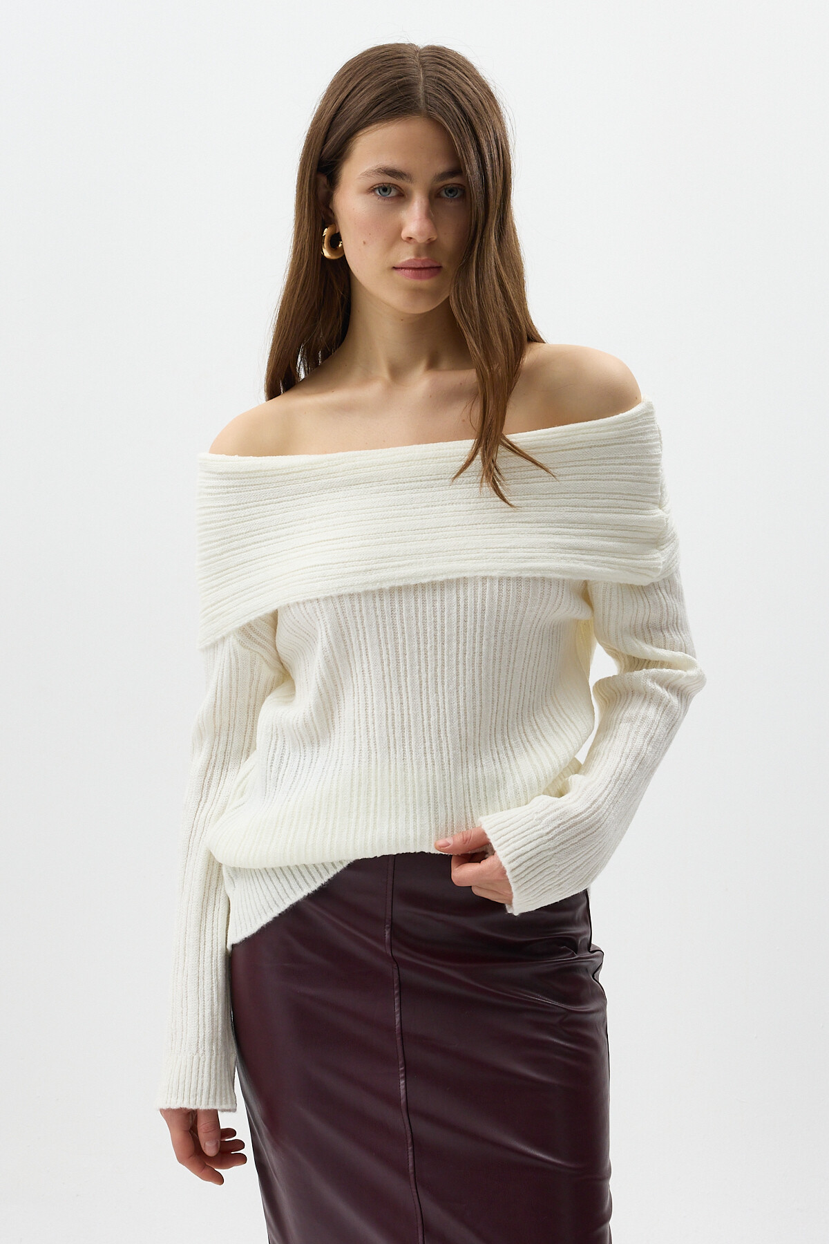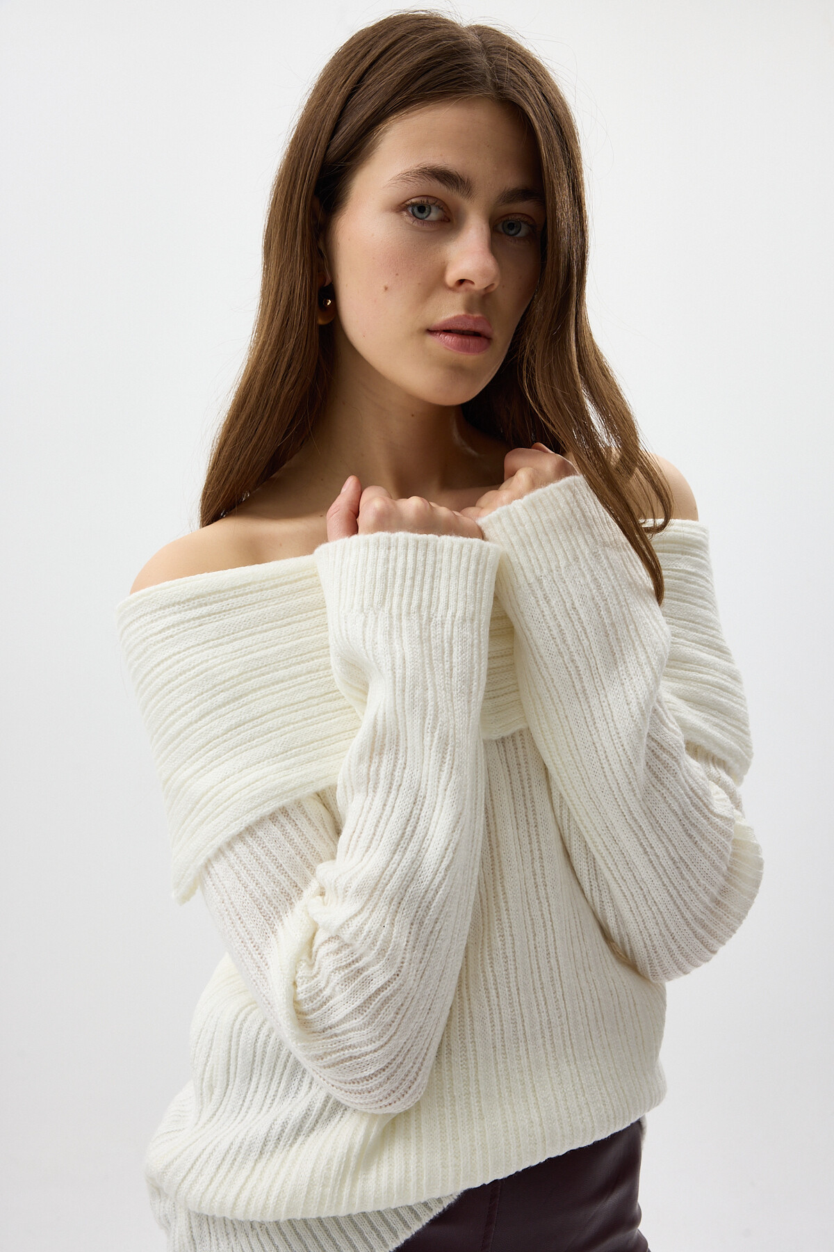 Ekru Fitilli Kayık Yaka Kadın Kazak 2324
