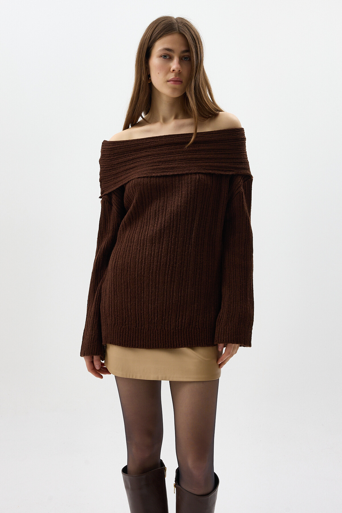 Kahverengi Fitilli Kayık Yaka Kadın Kazak 2324