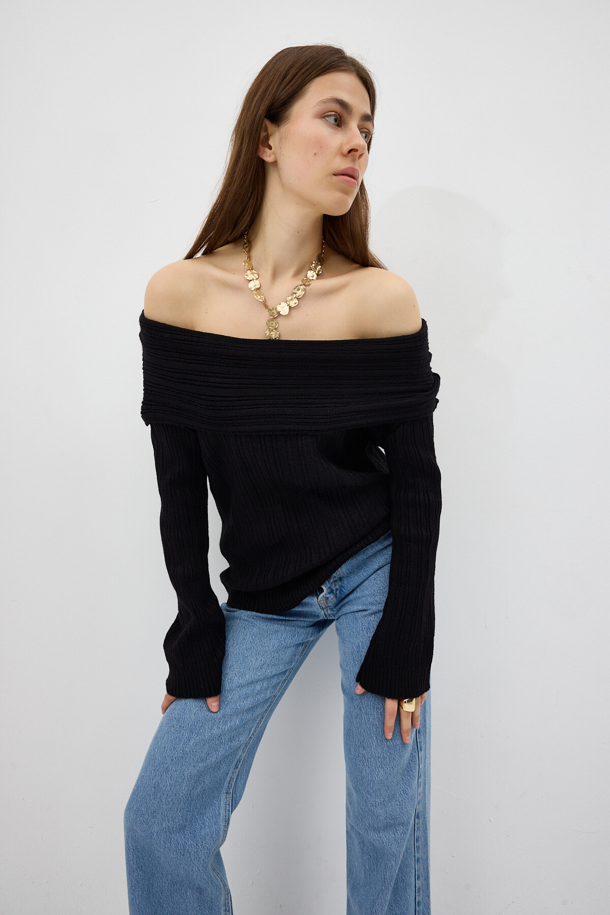 Siyah Fitilli Kayık Yaka Kadın Kazak 2324