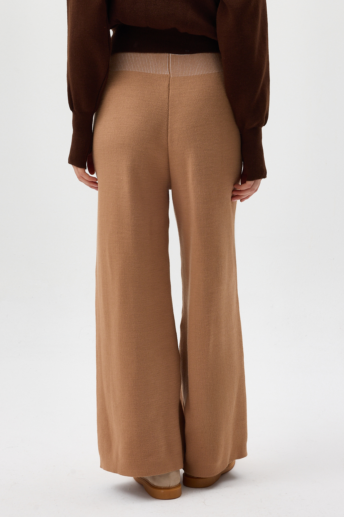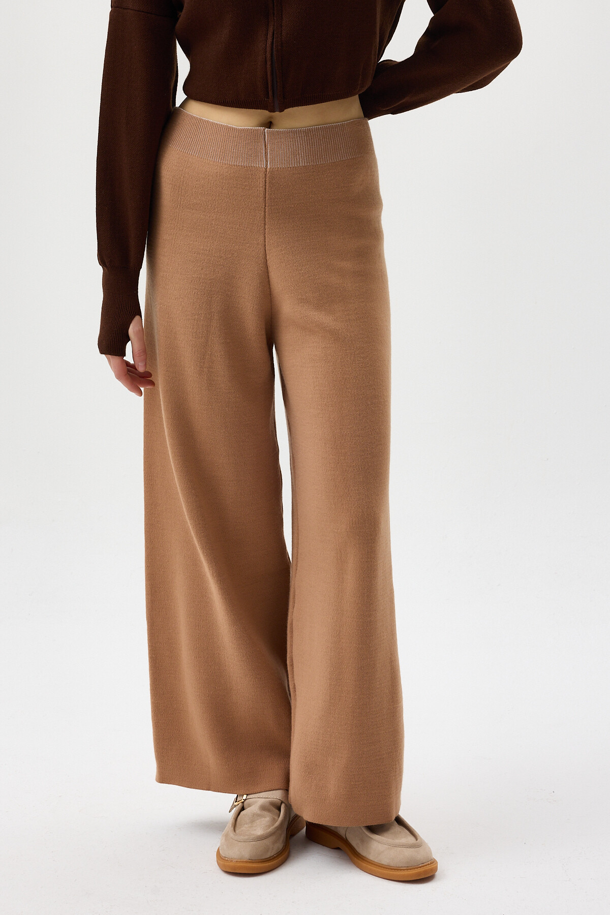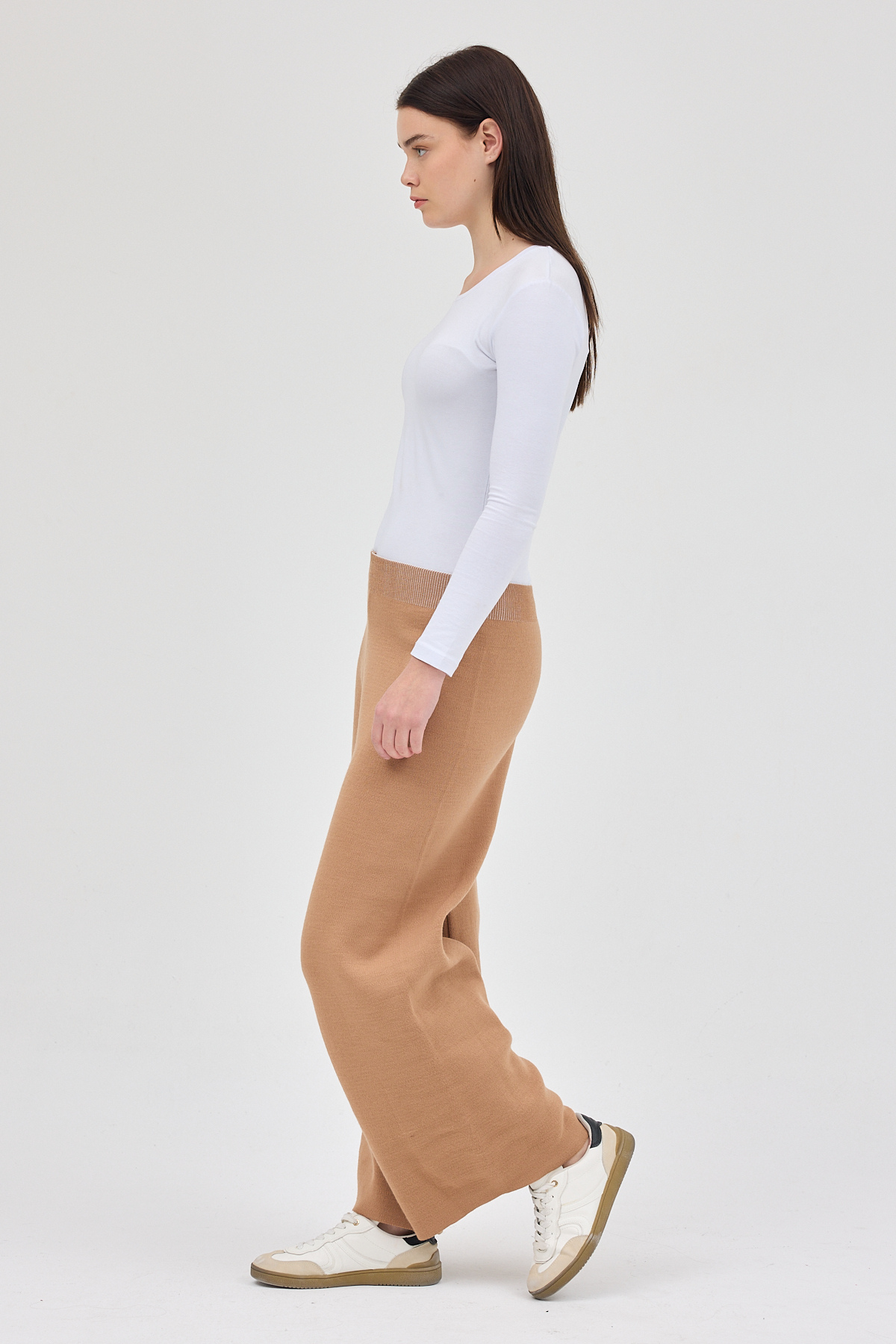 Koyu Bej Geniş Paça Triko Kadın Pantolon 23274