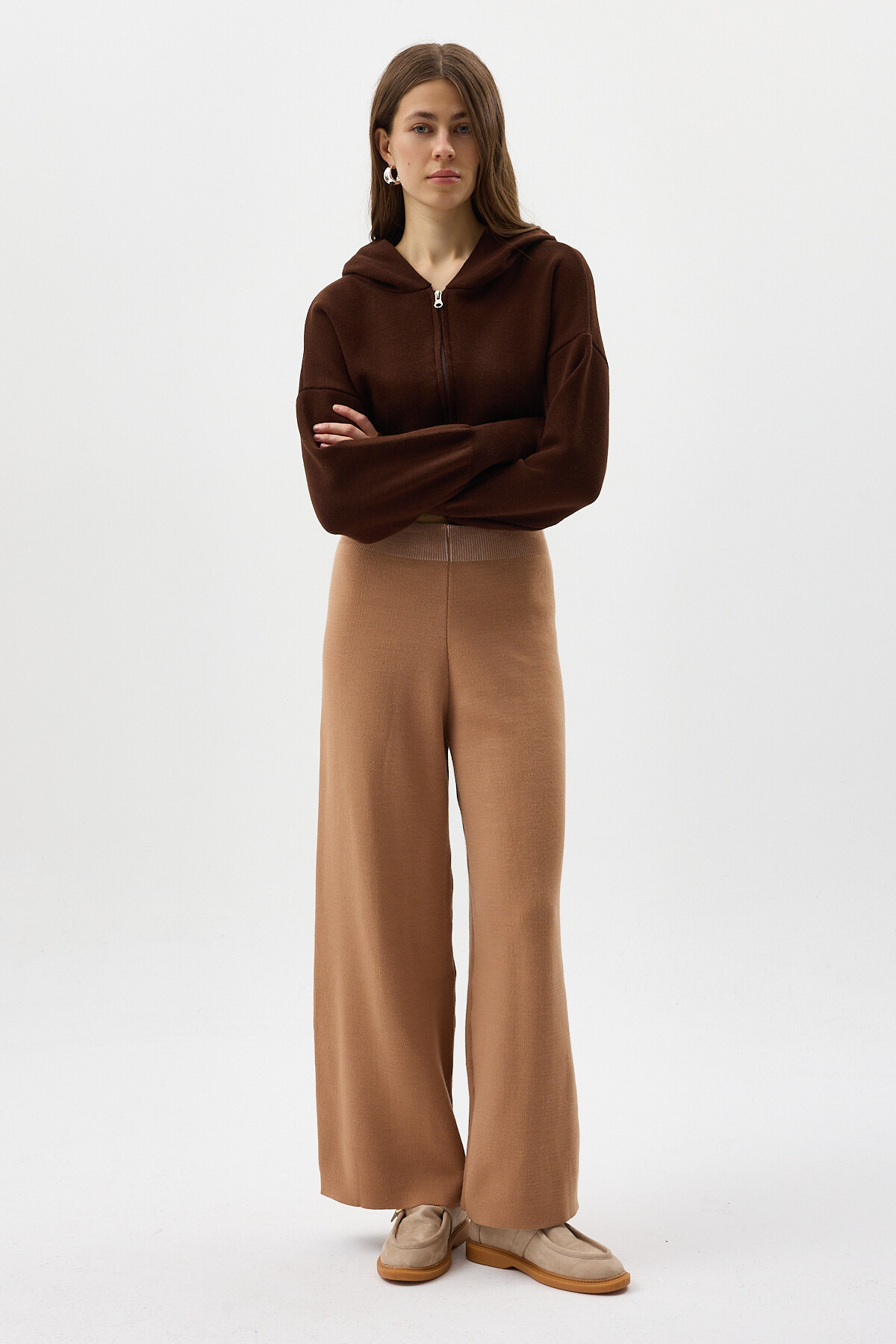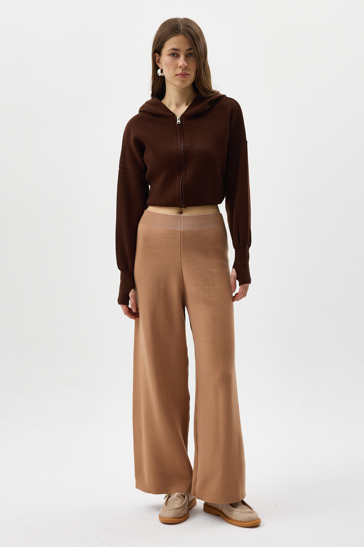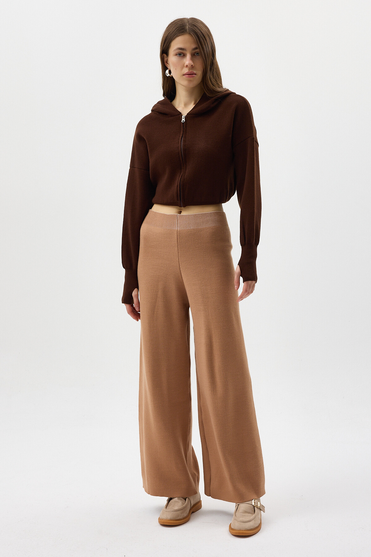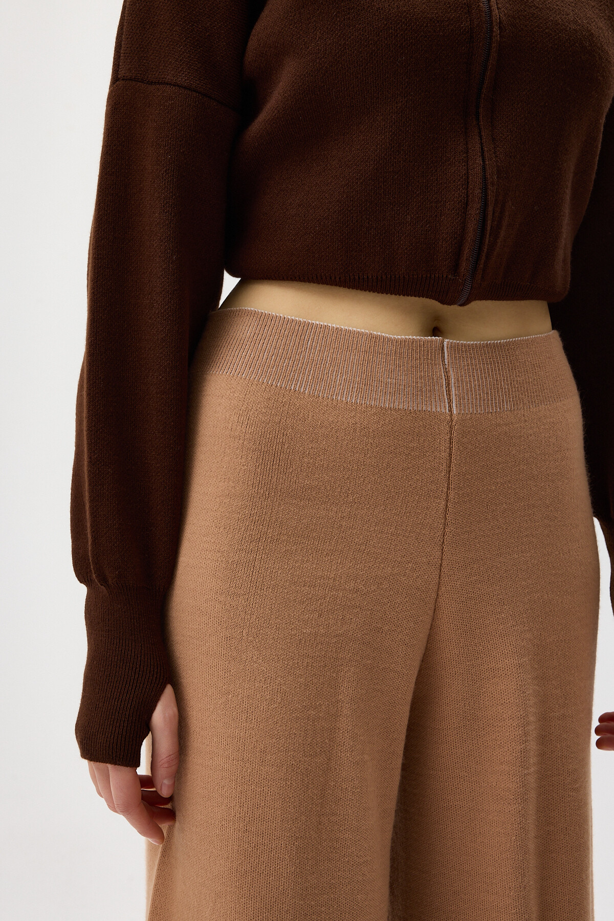 Koyu Bej Geniş Paça Triko Kadın Pantolon 23274
