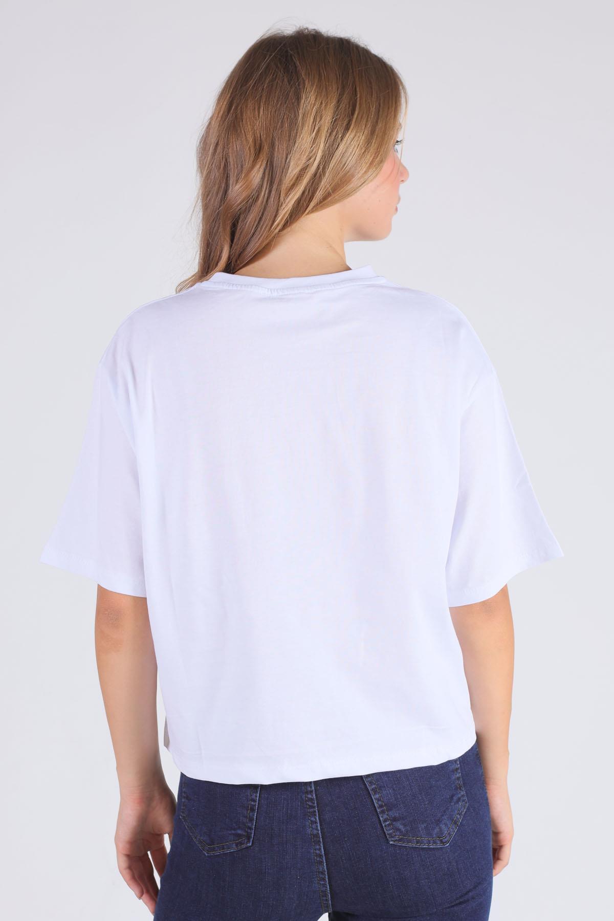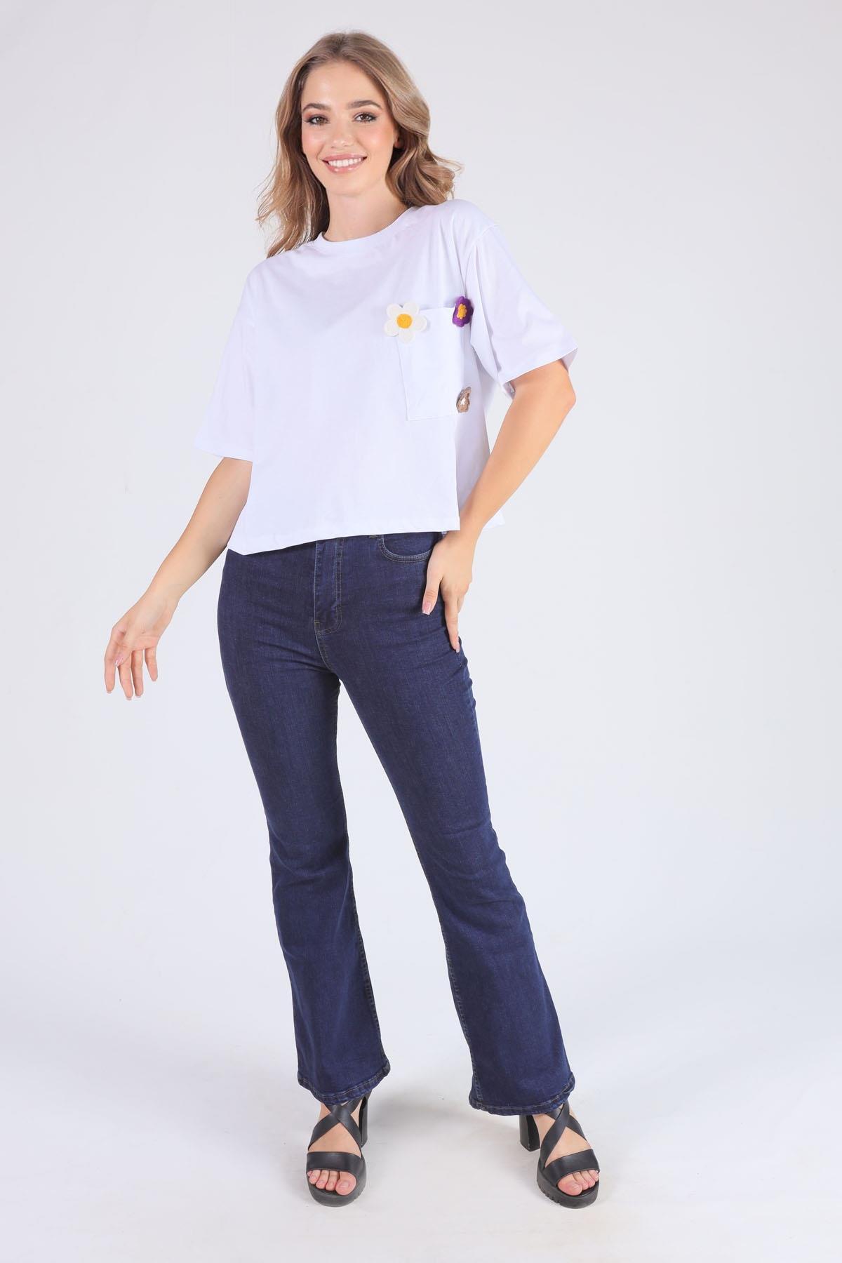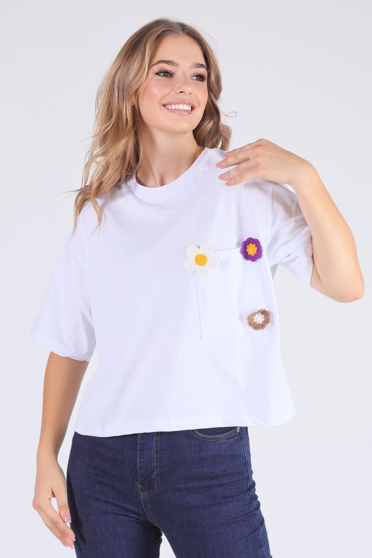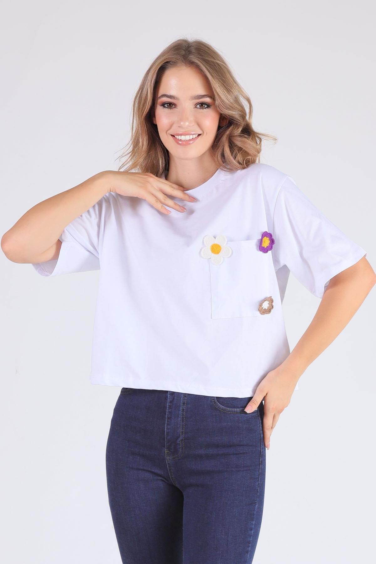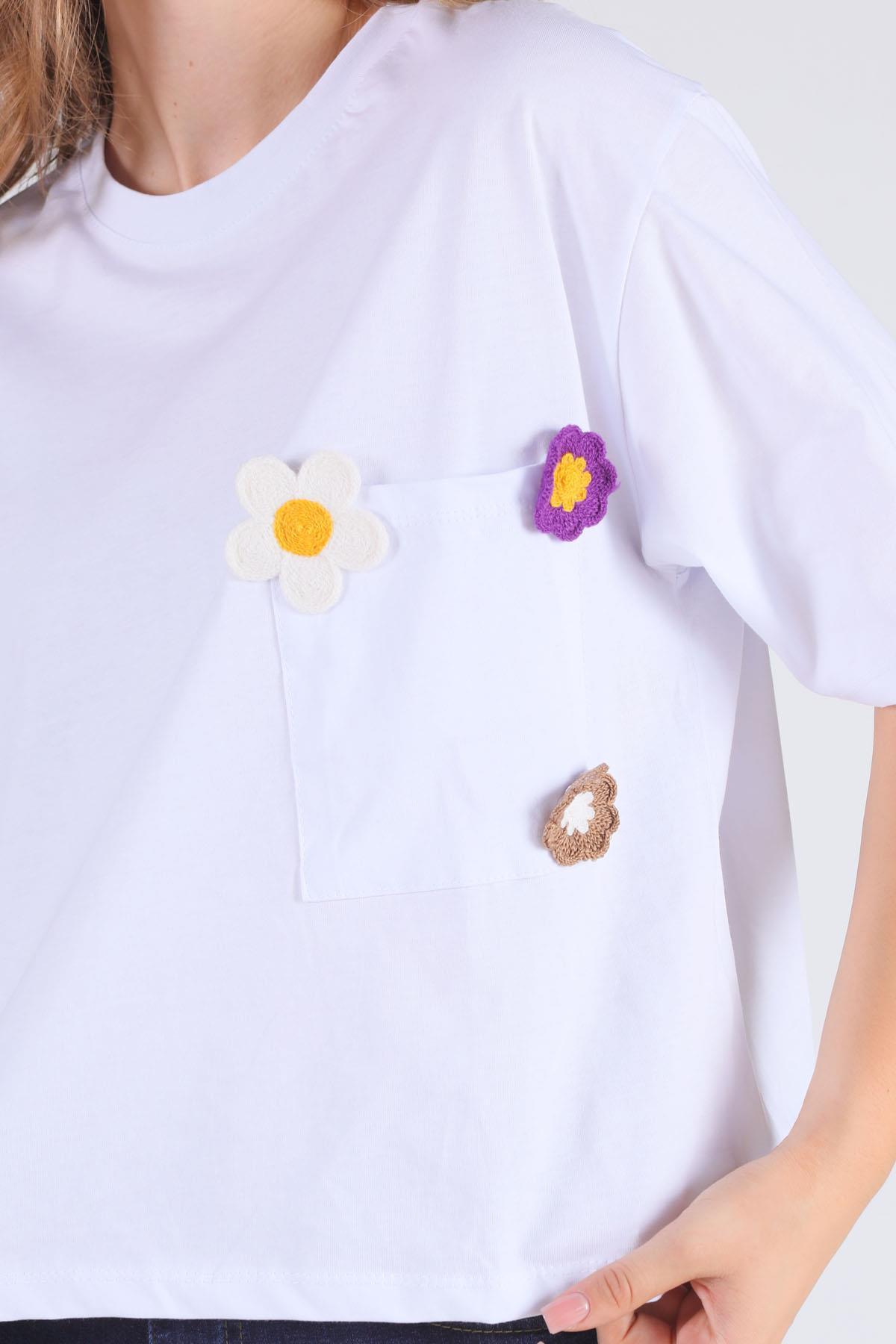 Beyaz Cep Papatya Detaylı Tişört 23304