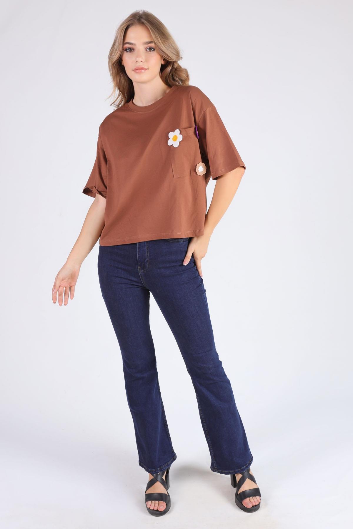 Kahve Cep Papatya Detaylı Tişört 23304