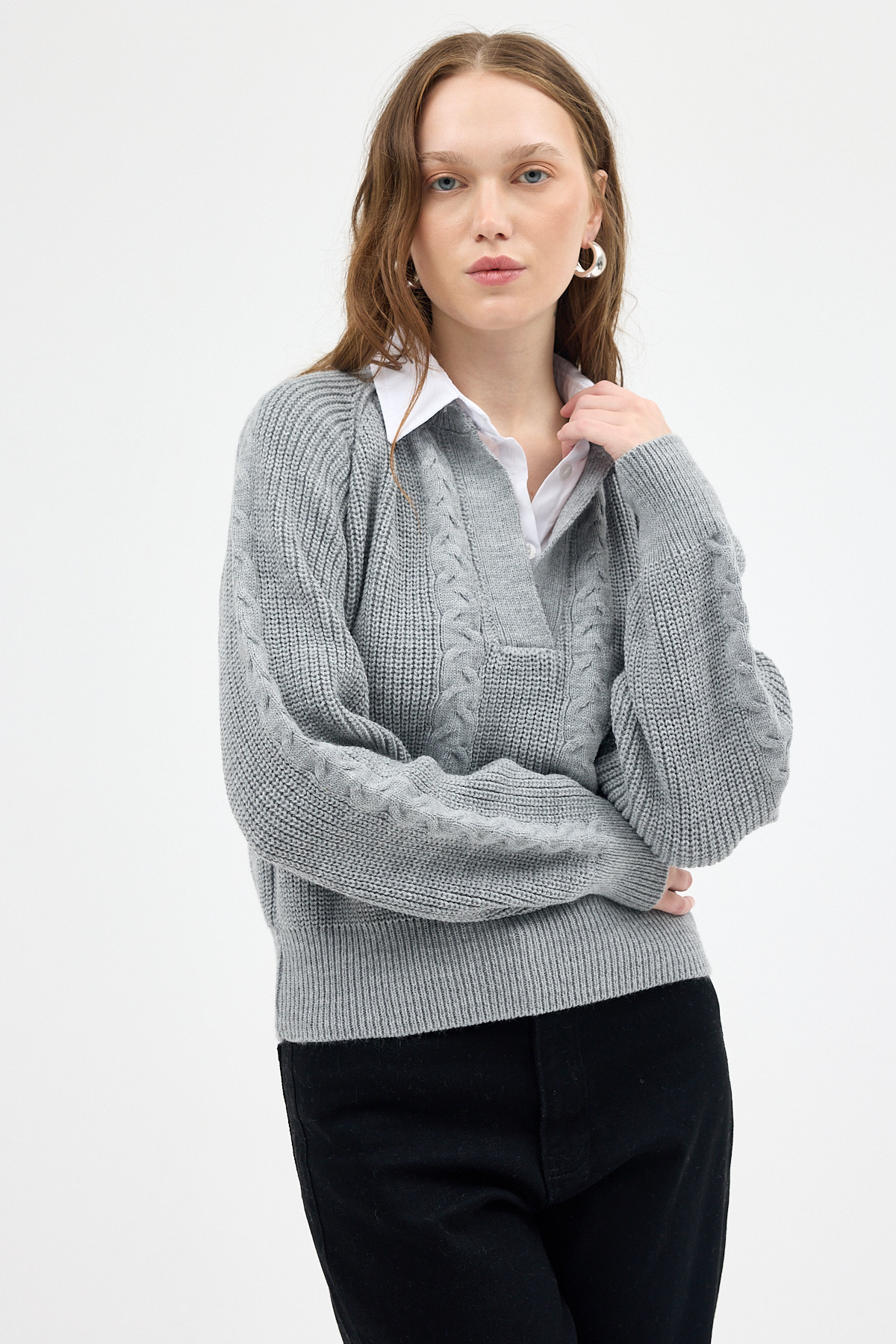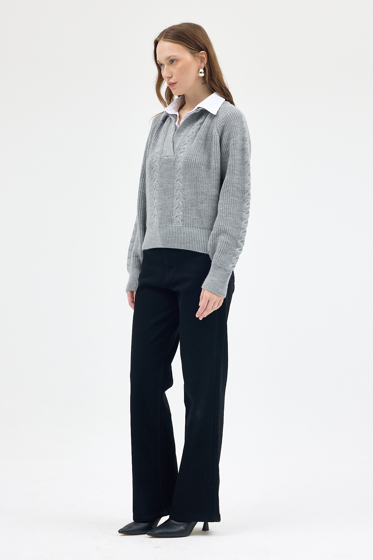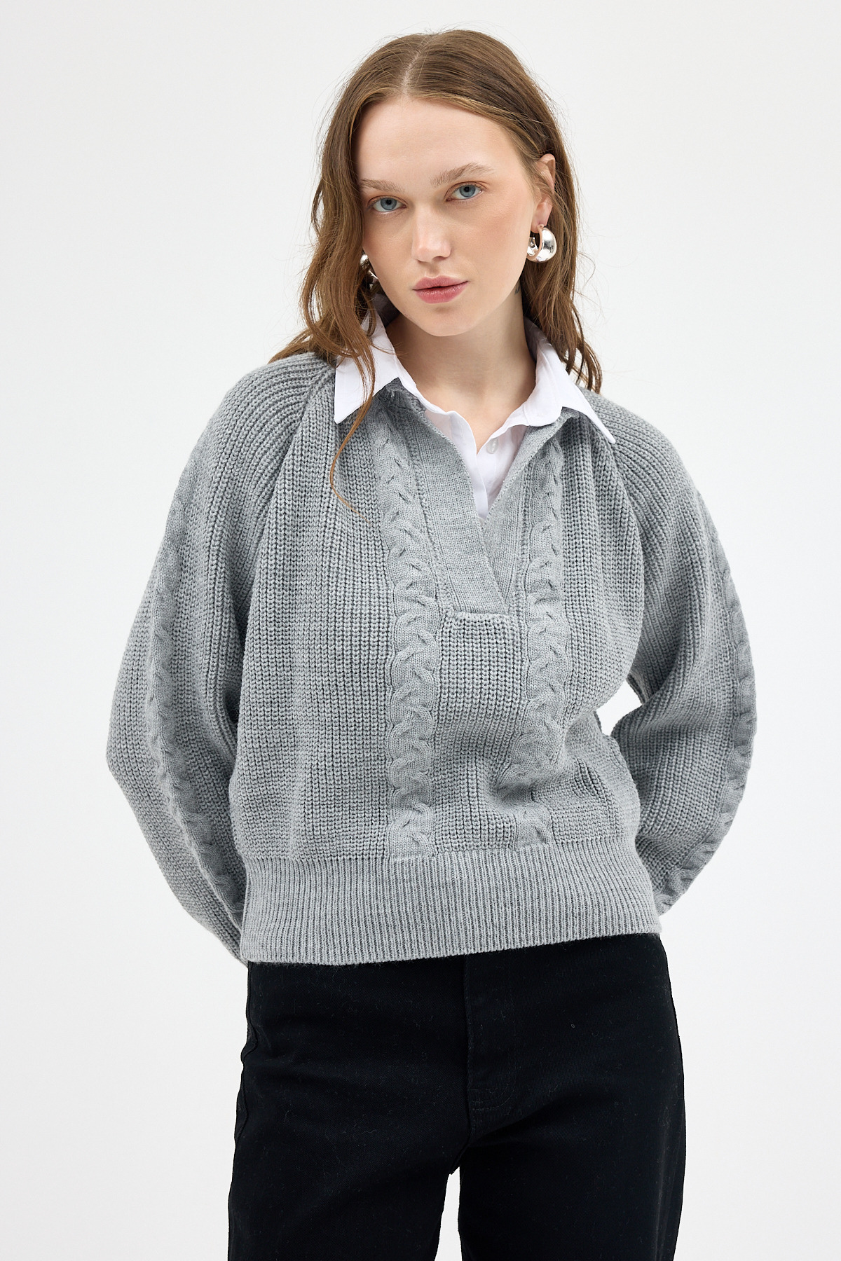 Açık Gri Gömlek Yakalı Örgü Kadın Kazak 2335