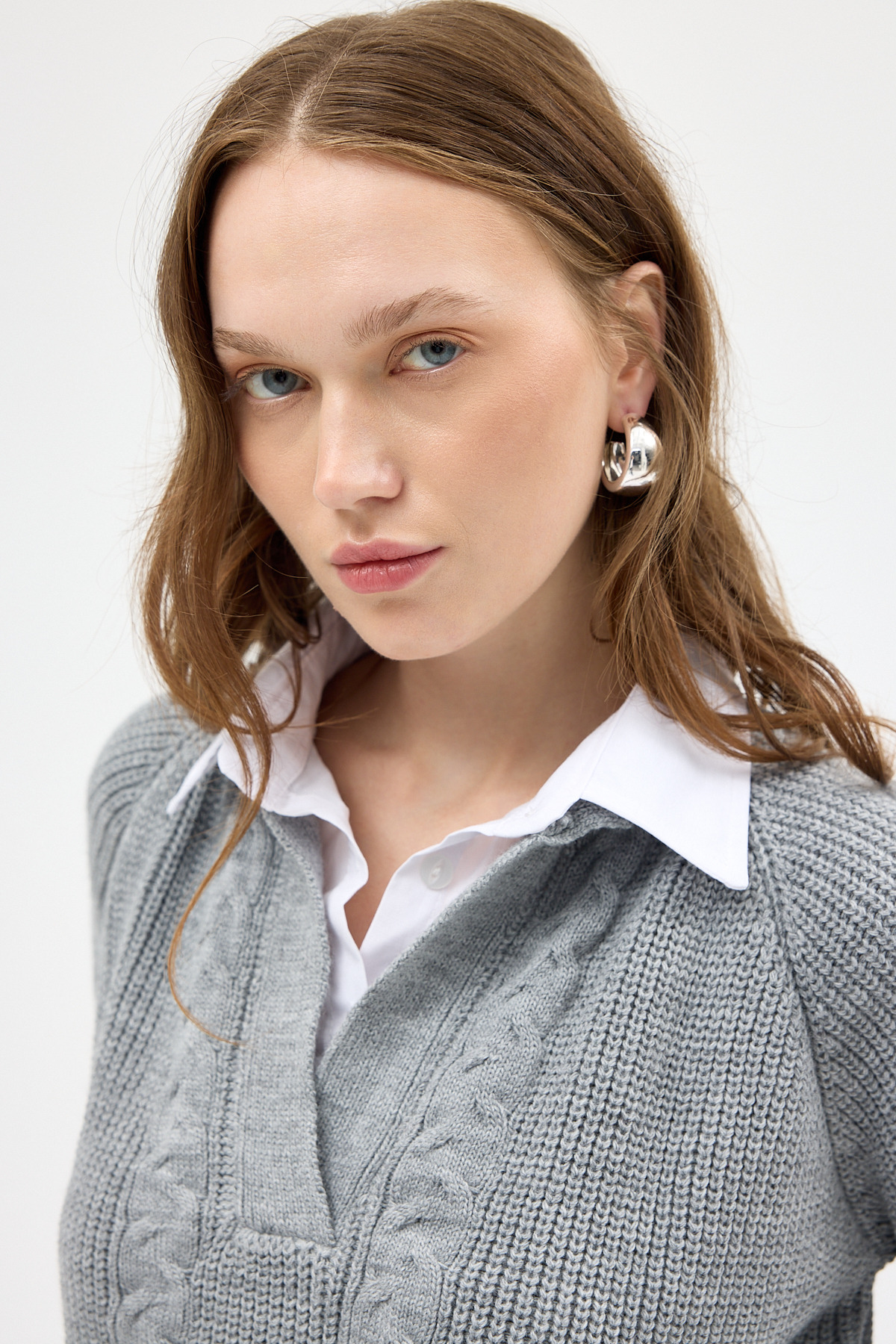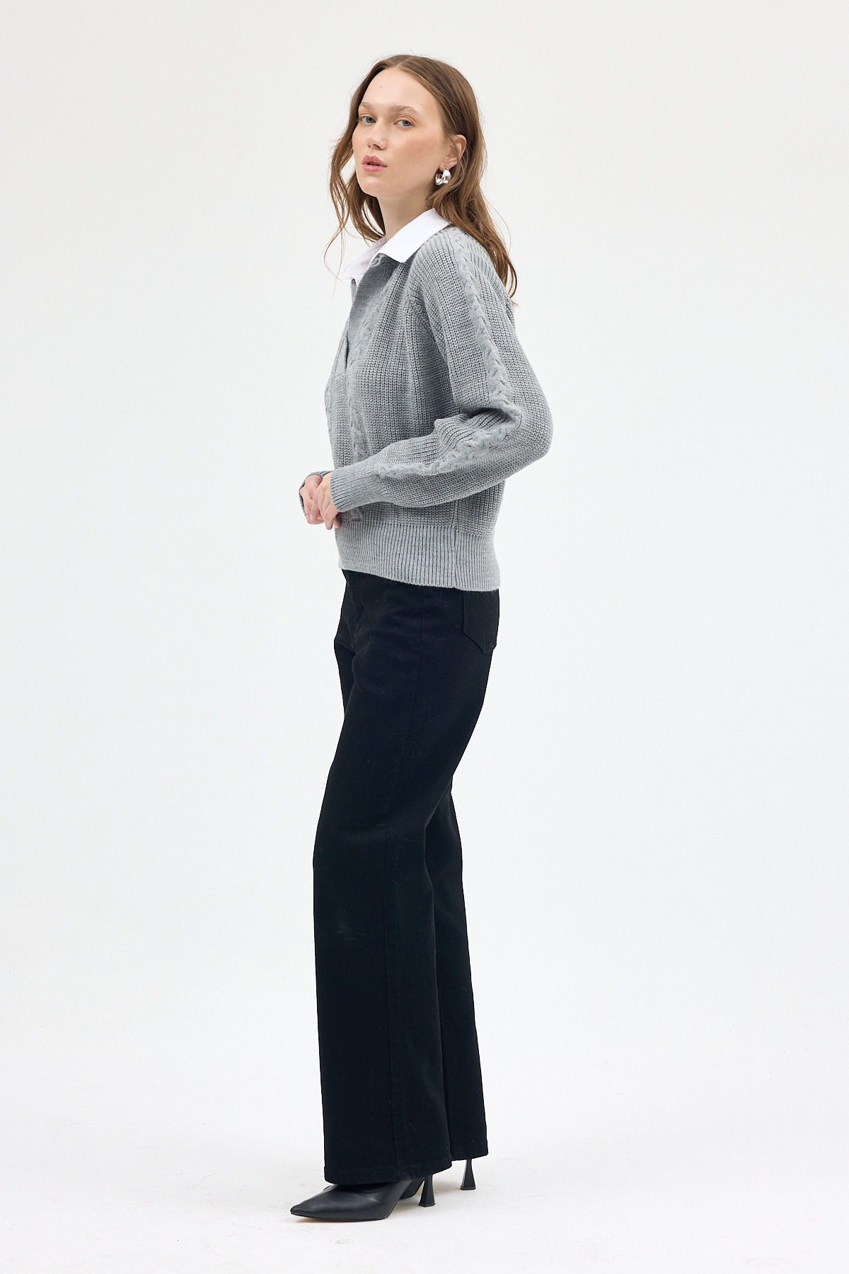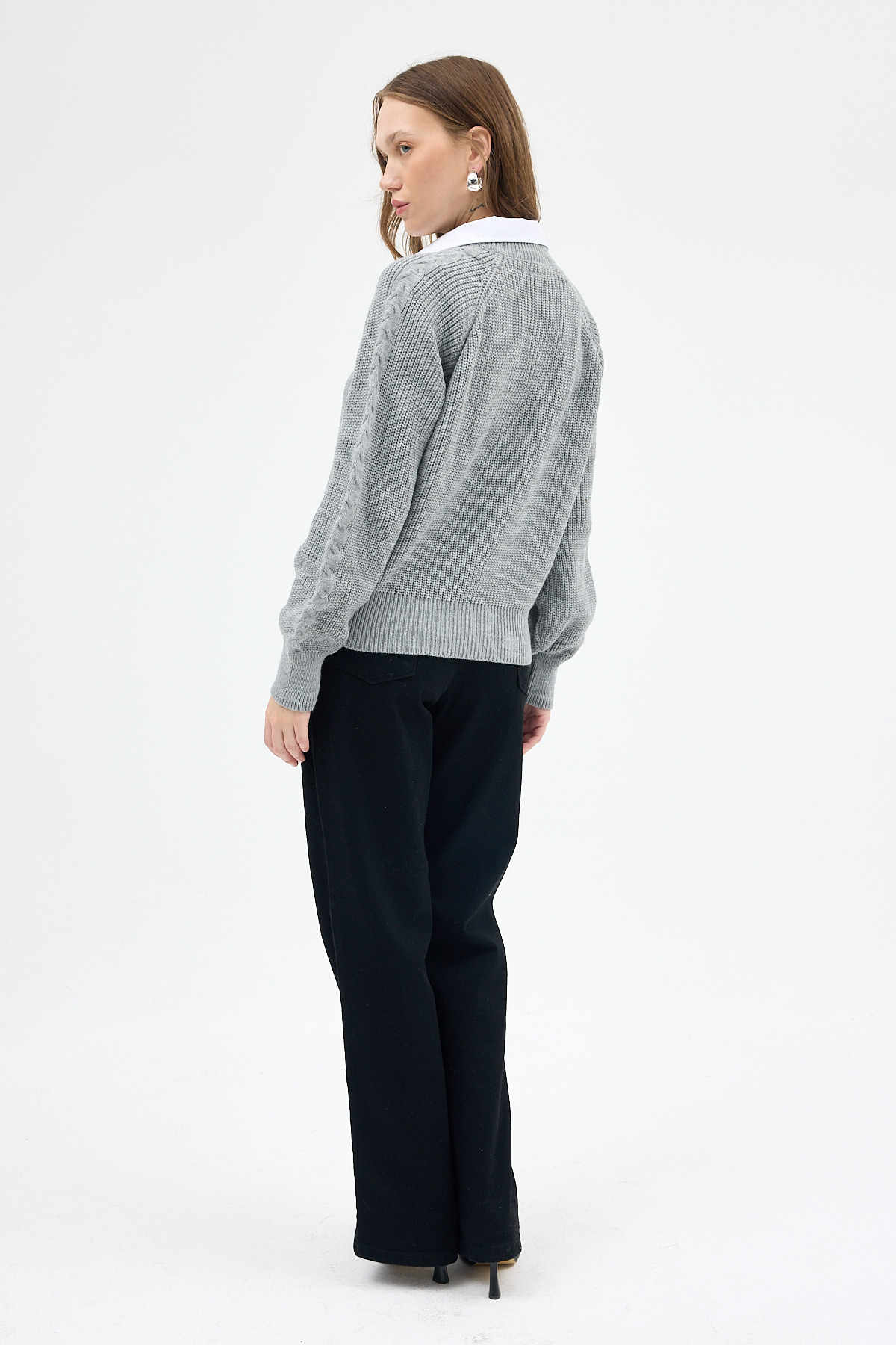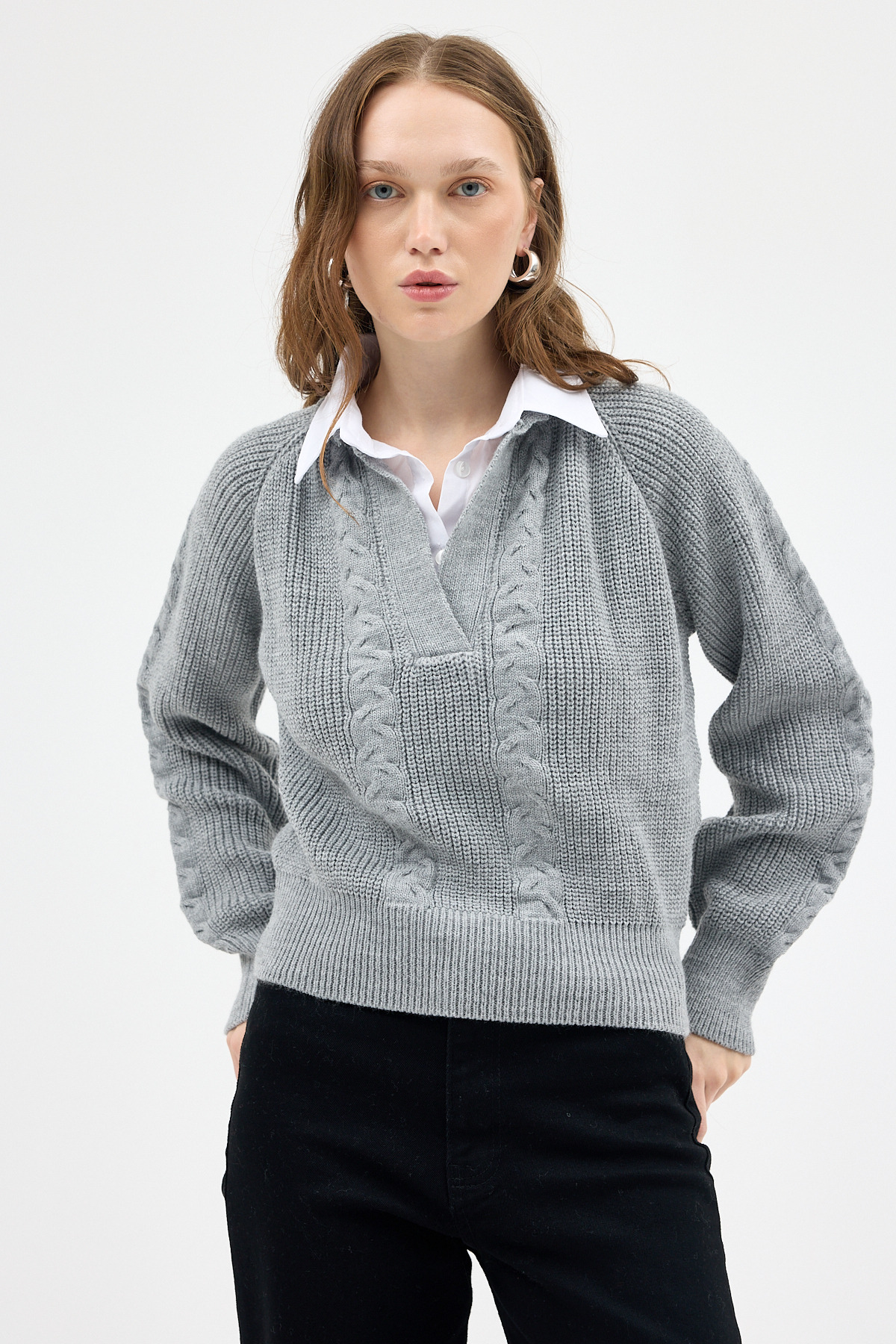 Açık Gri Gömlek Yakalı Örgü Kadın Kazak 2335
