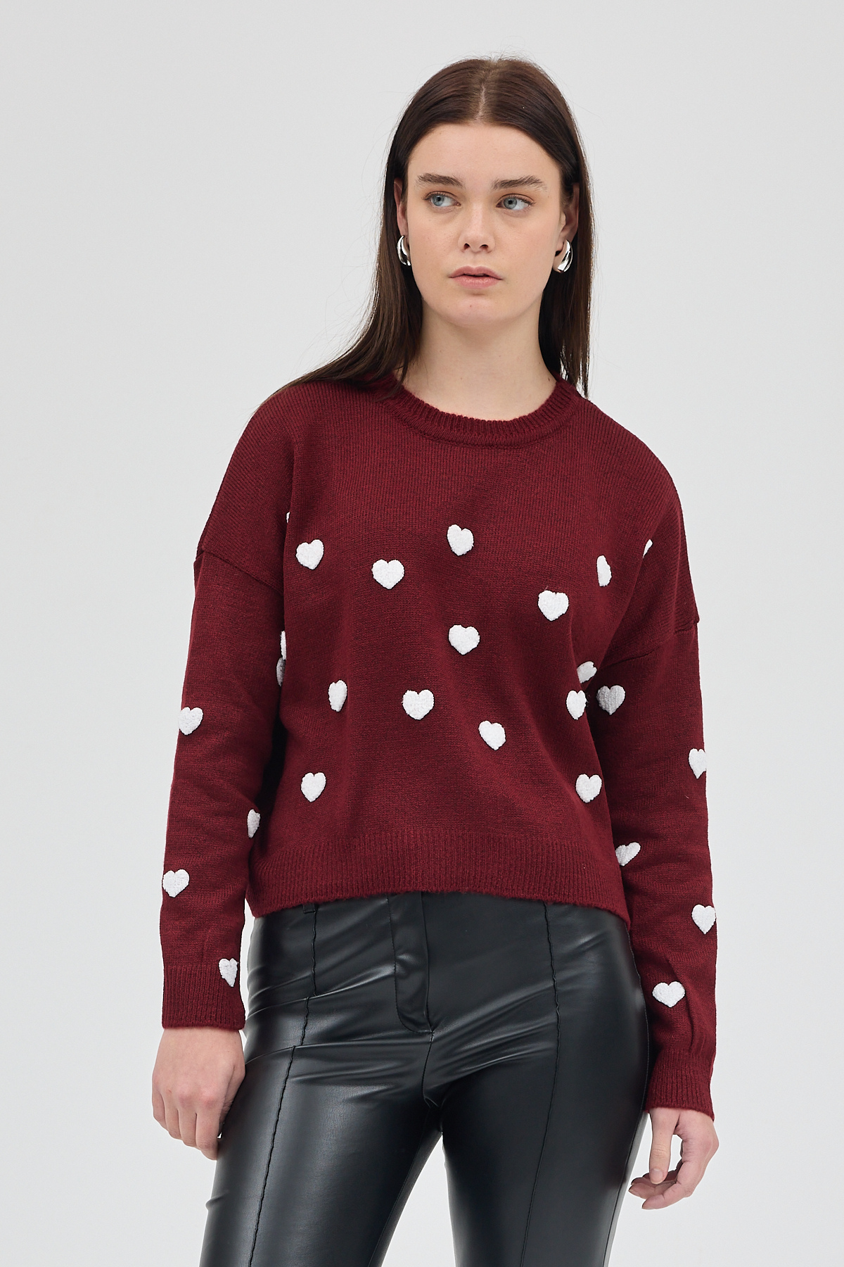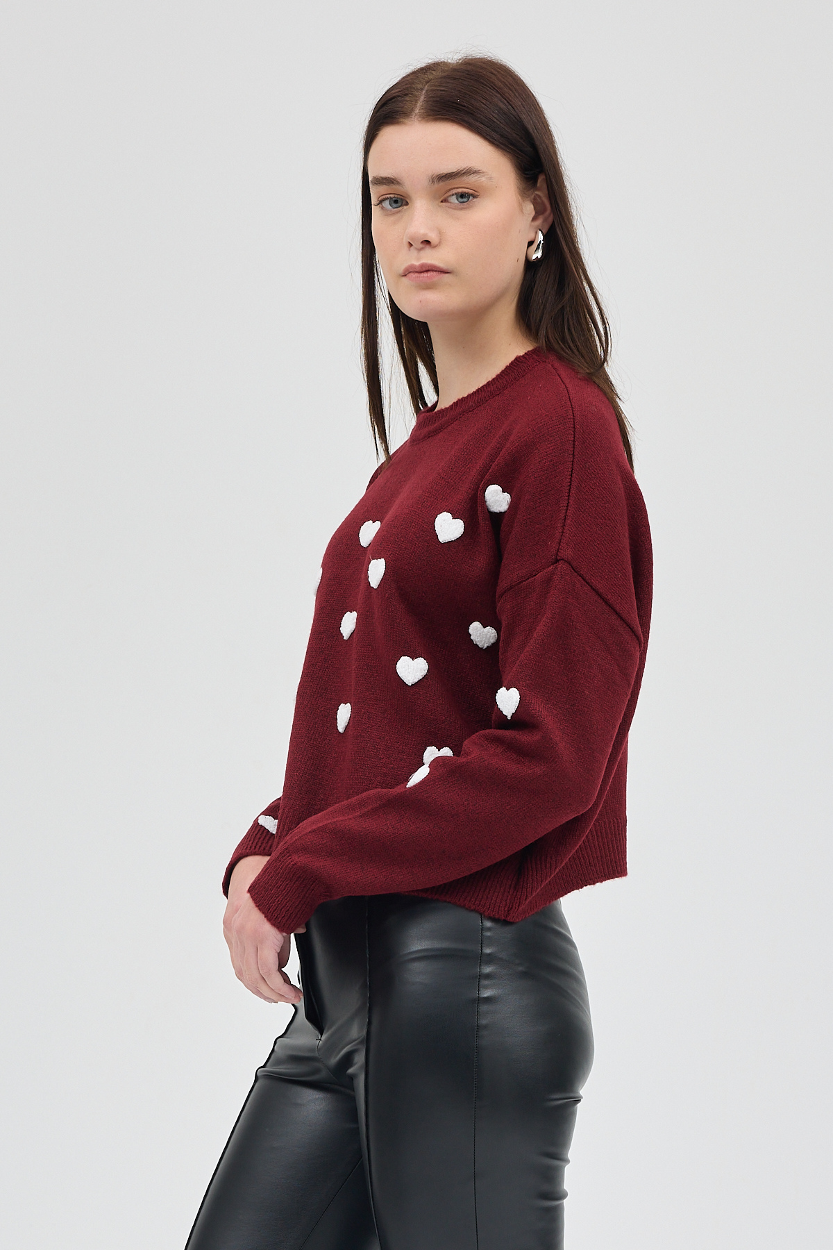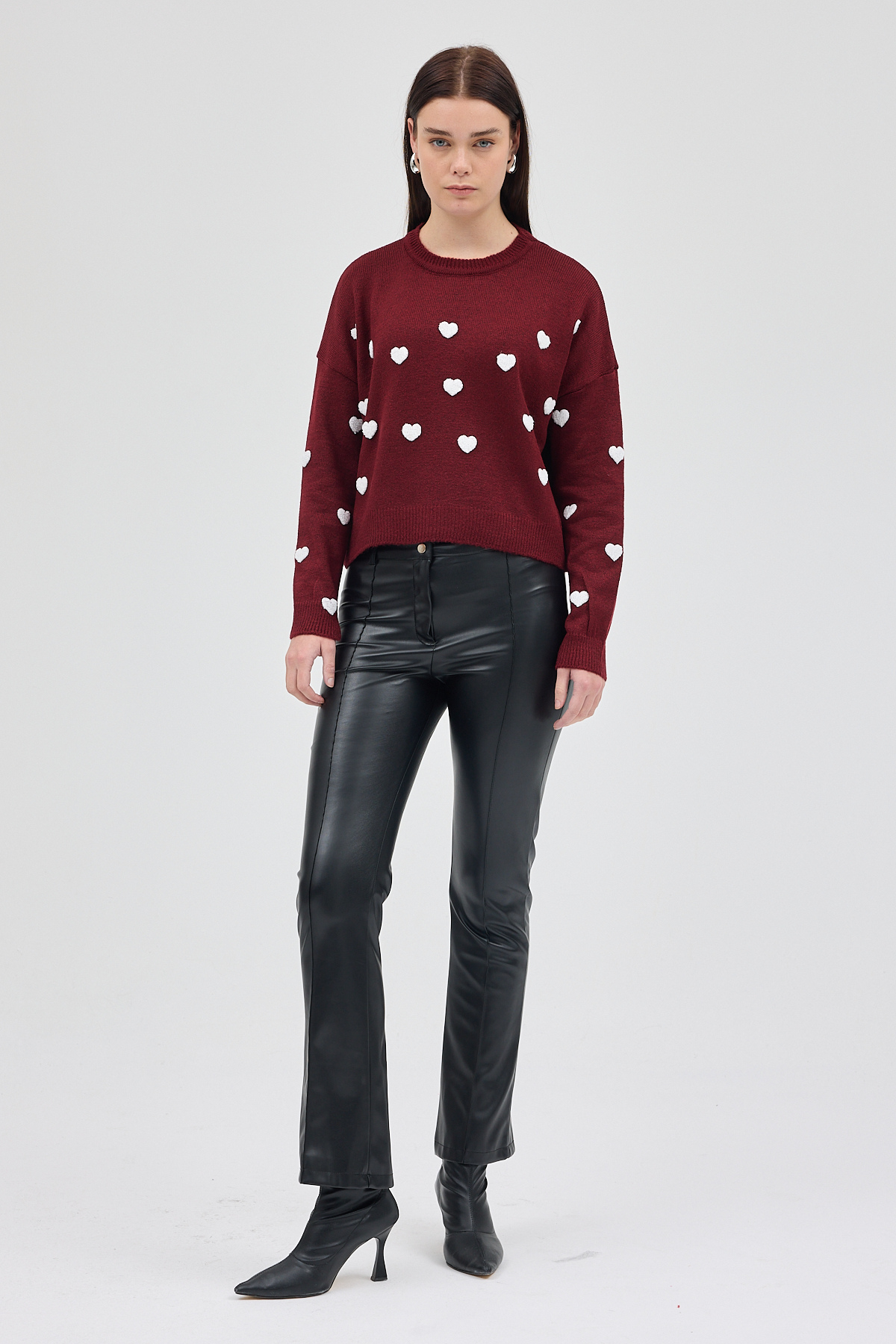Bordo Kalp Nakışlı Bisiklet Yaka Crop Kazak 2337
