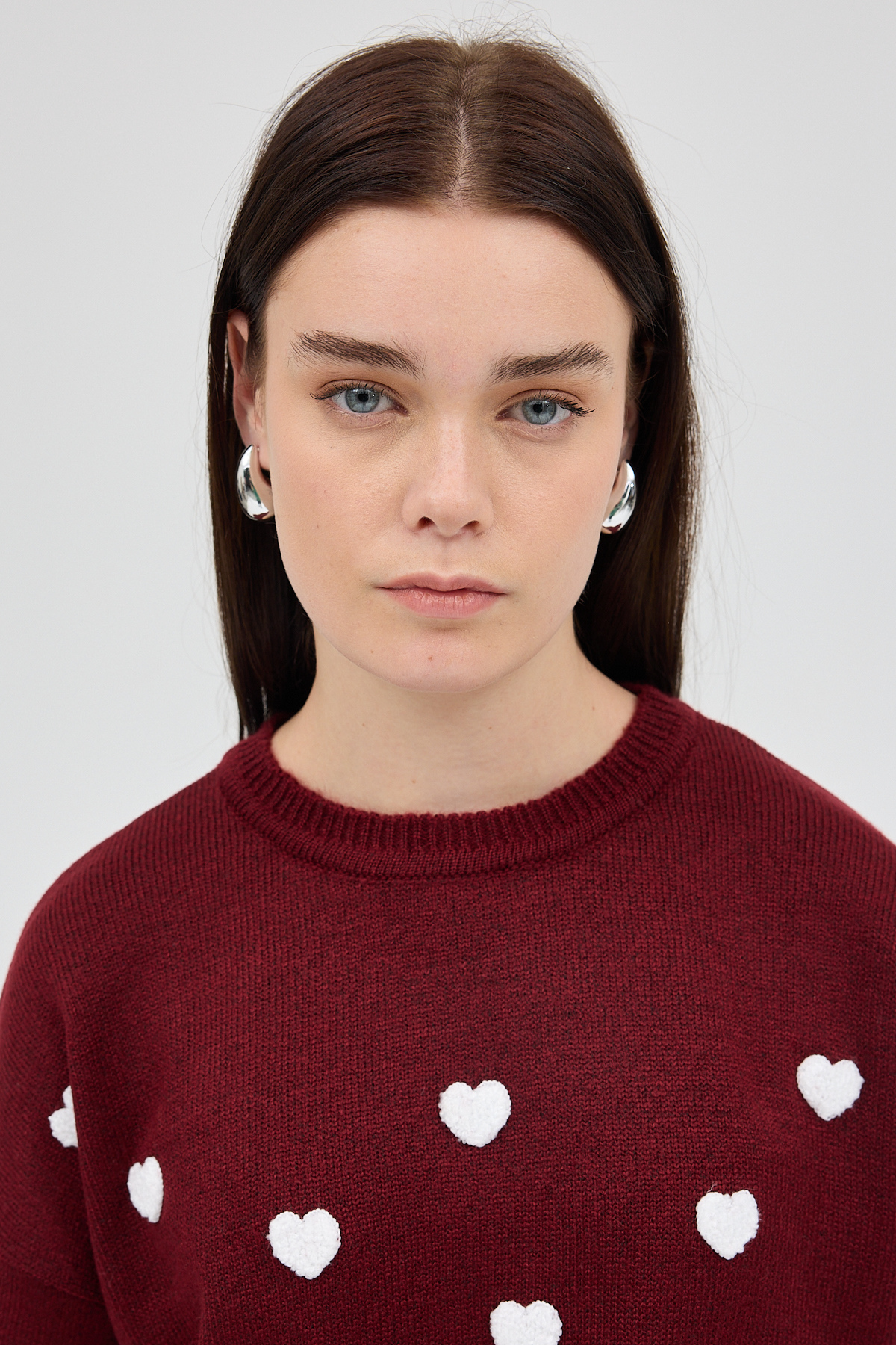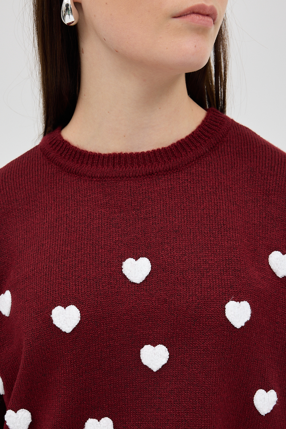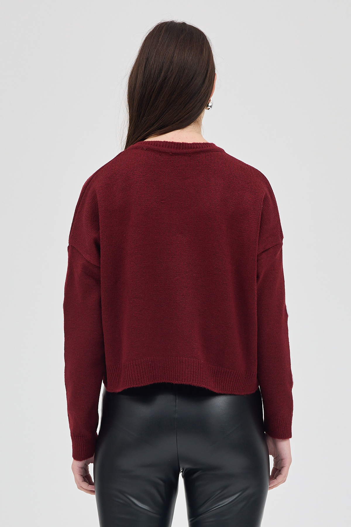 Bordo Kalp Nakışlı Bisiklet Yaka Crop Kazak 2337
